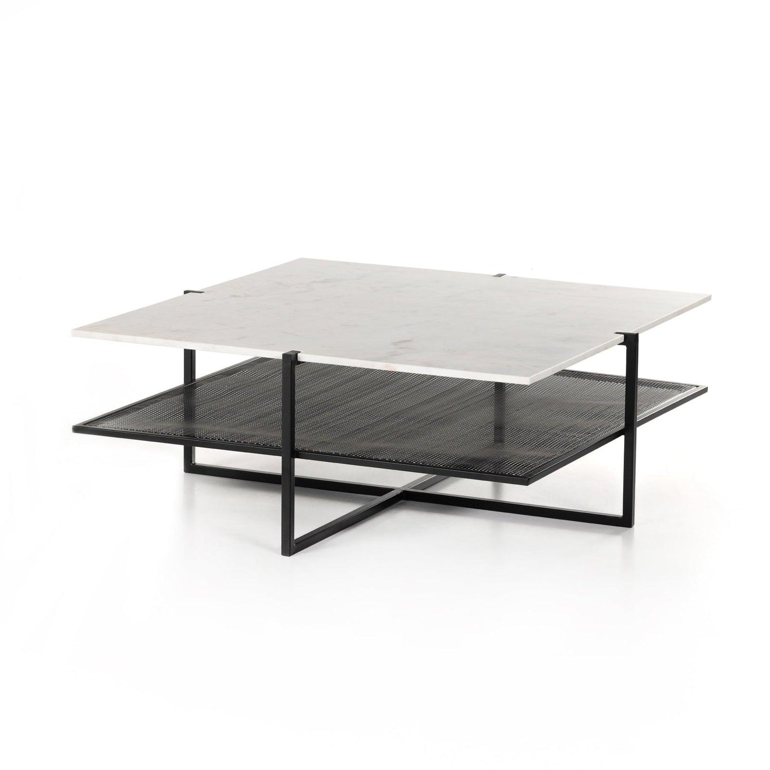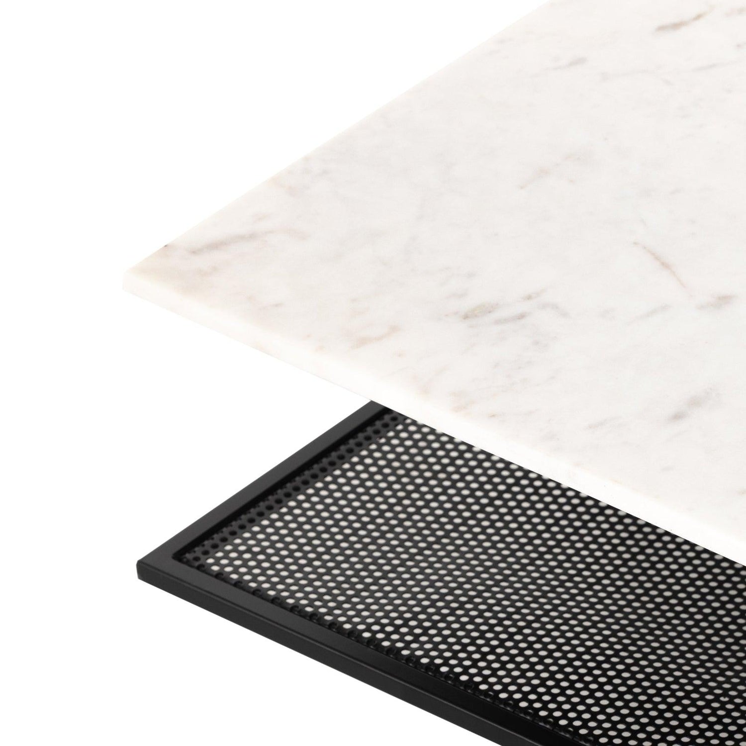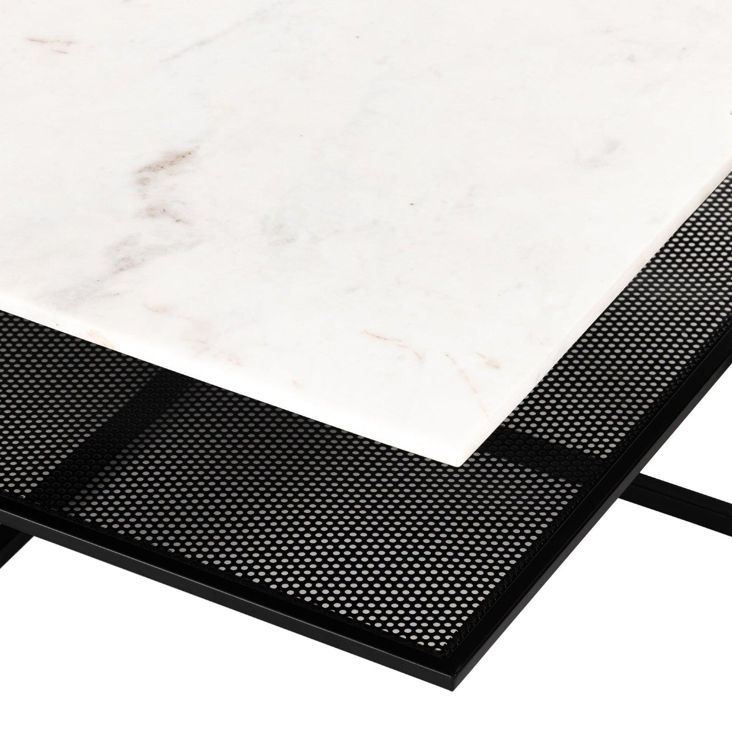 - El hierro delgado con acabado de latón antiguo forma una X para sostener niveles de metal perforado y mármol blanco pulido, aportando una apariencia de simple gracia a la mesa de café moderna.