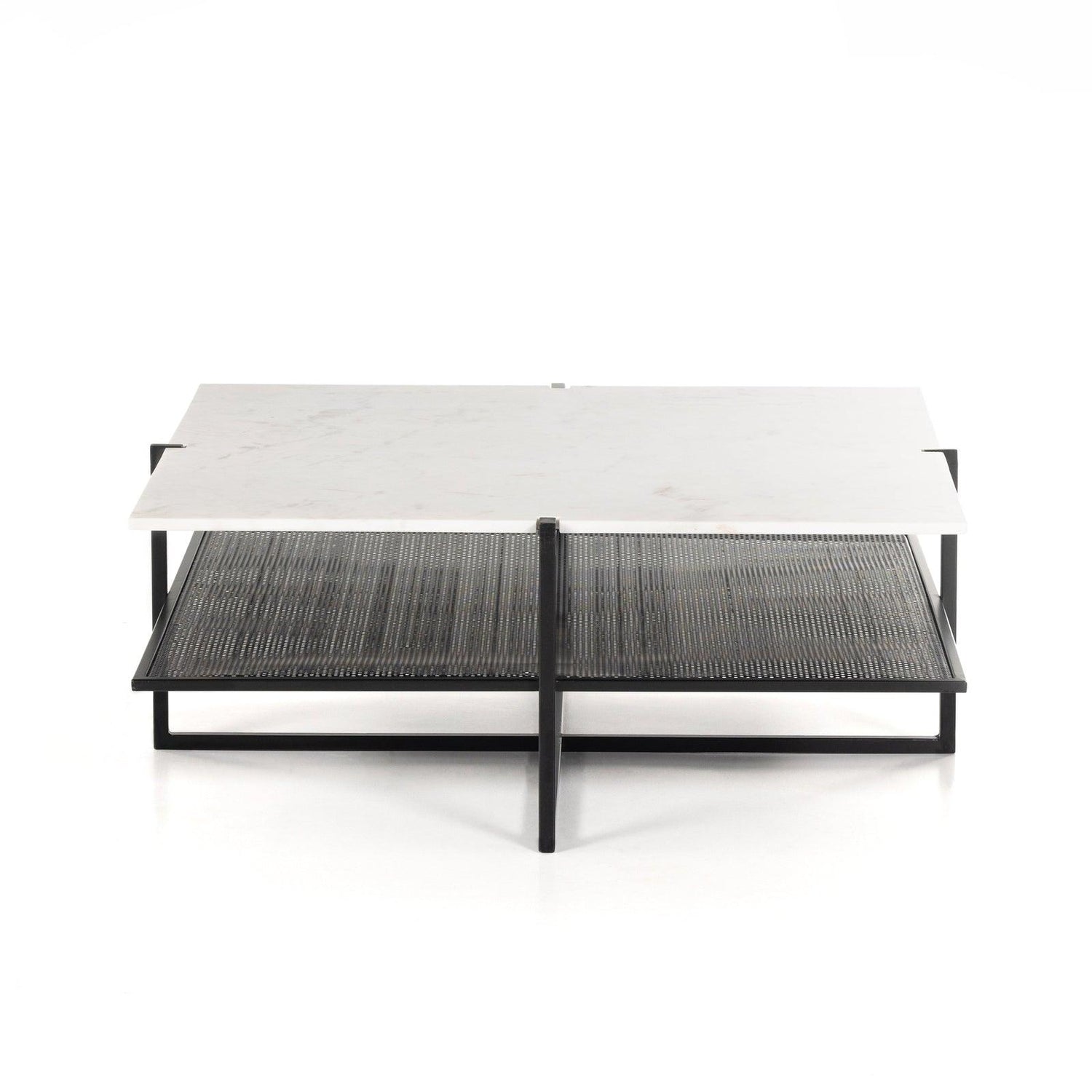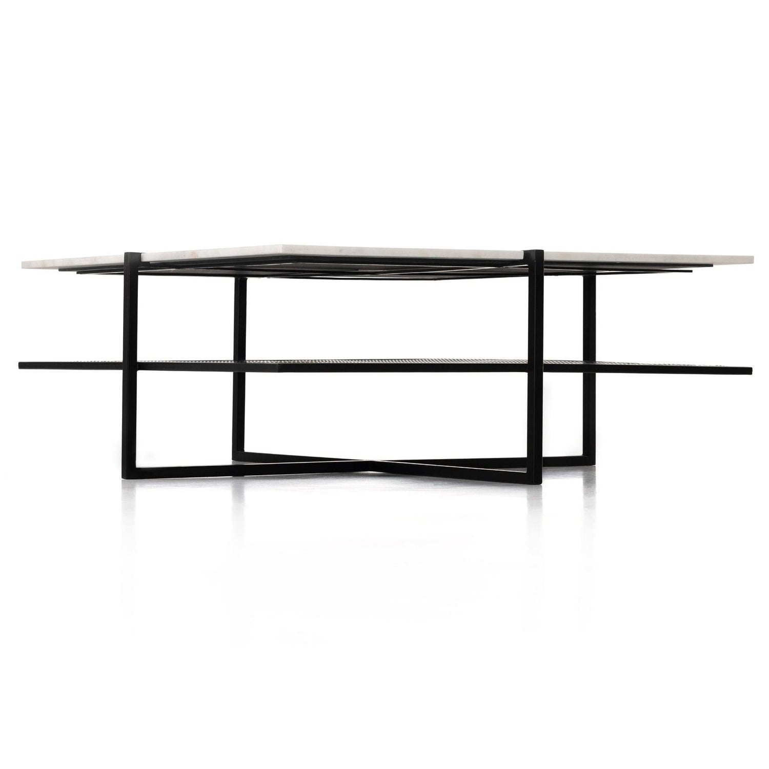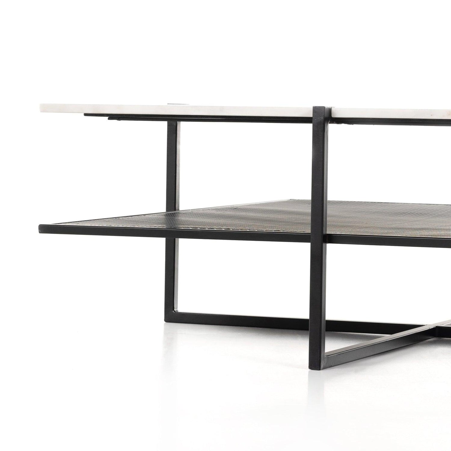- El hierro delgado con acabado de latón antiguo forma una X para sostener niveles de metal perforado y mármol blanco pulido, aportando una apariencia de simple gracia a la mesa de café moderna.