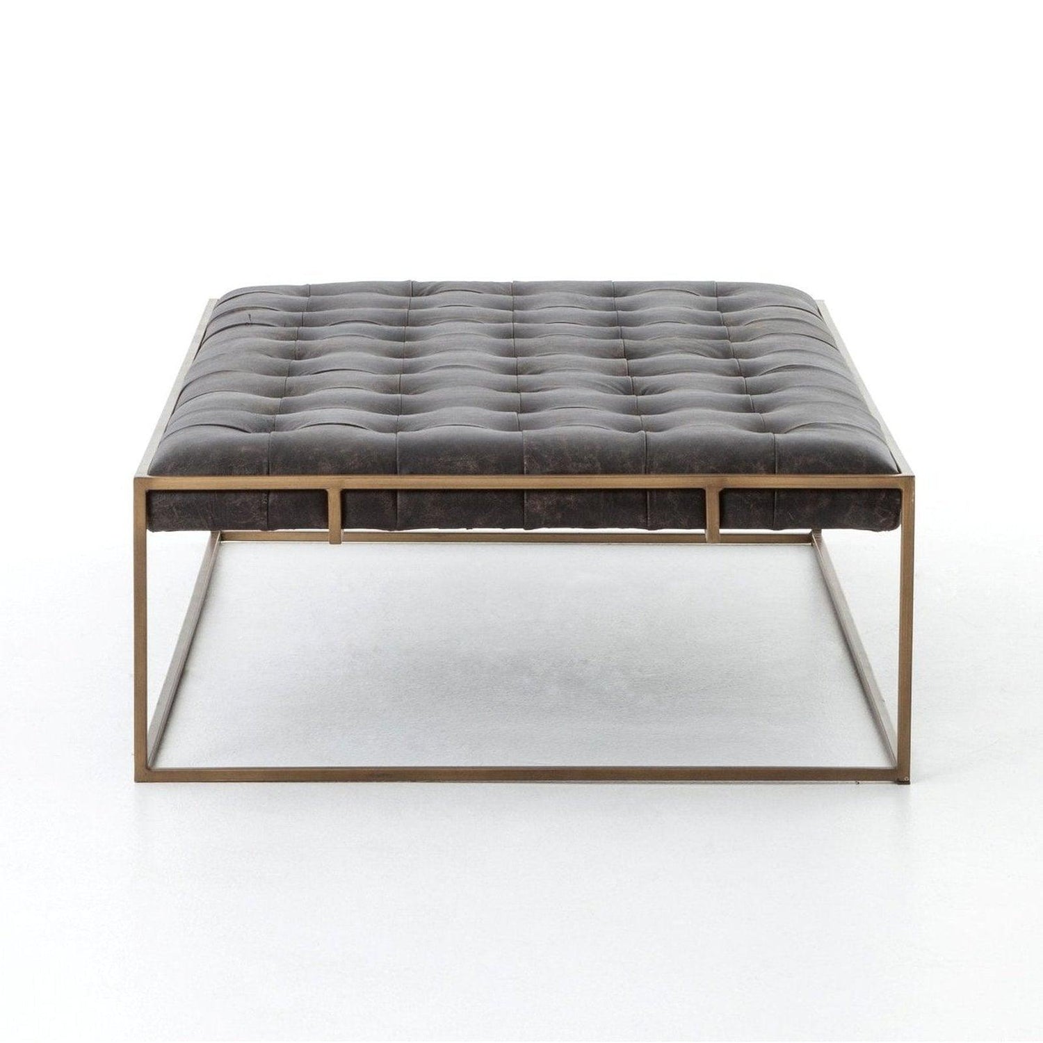 - Las tapas de cuero de grano superior con mechones ciegos flotan dentro de una base Parsons de latón antiguo con detalles en forma de jaula.