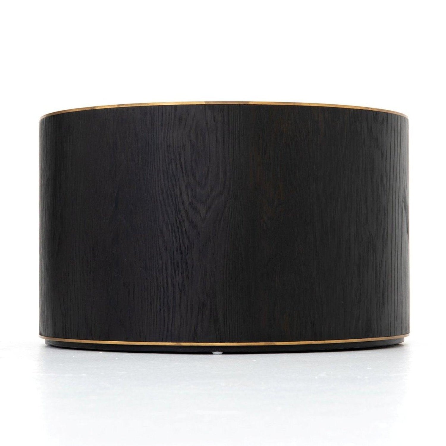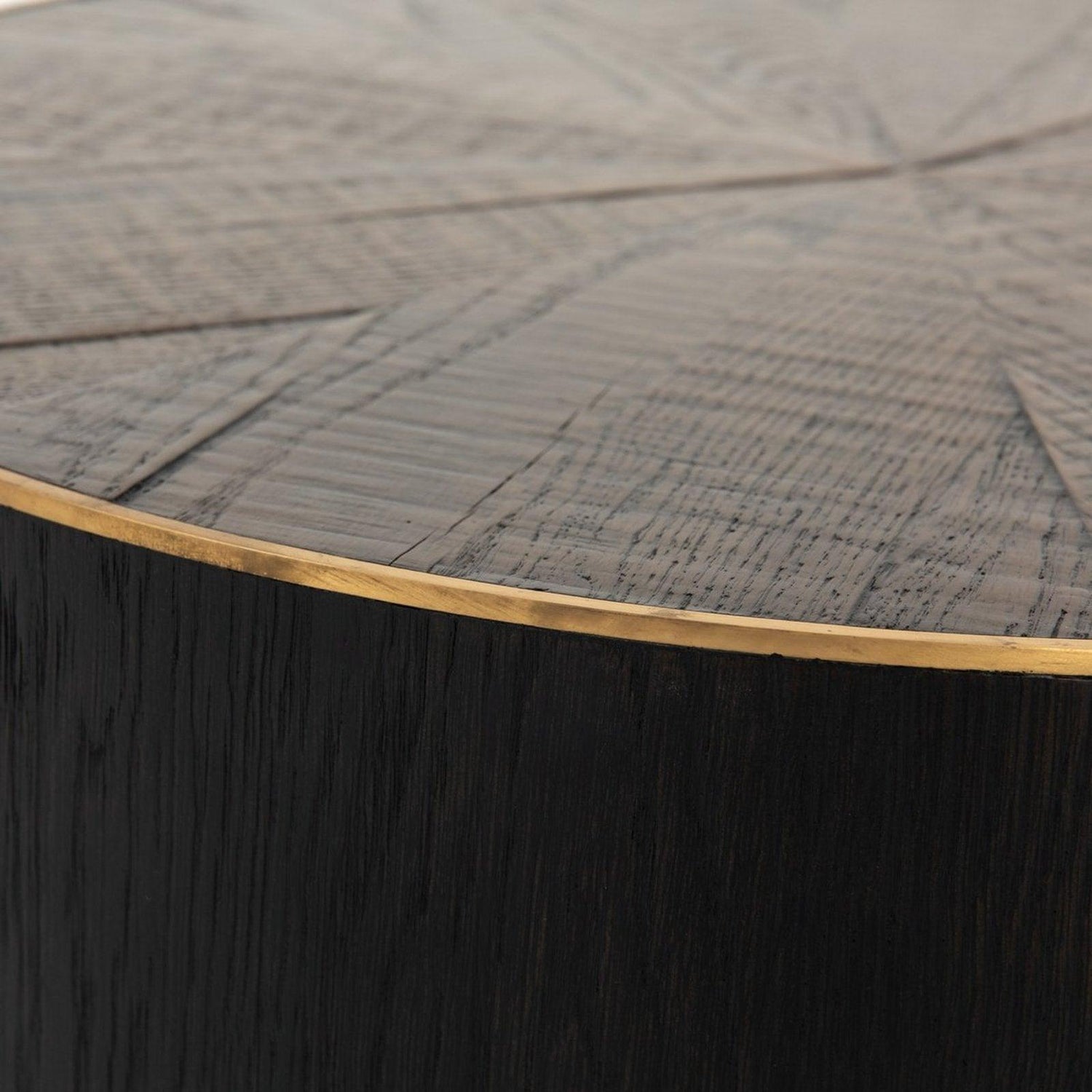 • Una tapa de roble con acabado ébano está cortada en una textura en forma de estrella, enmarcada por lados de ébano profundo y rodeada por un ribete revestido de latón brillante.