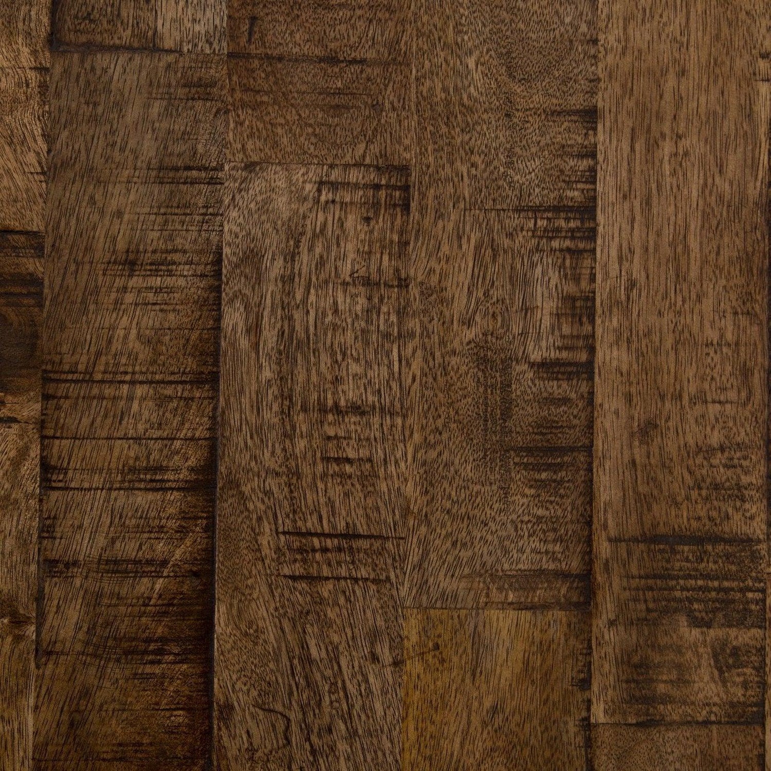 - Una gruesa losa de madera de mango parece flotar dentro de su delgado marco de hierro.