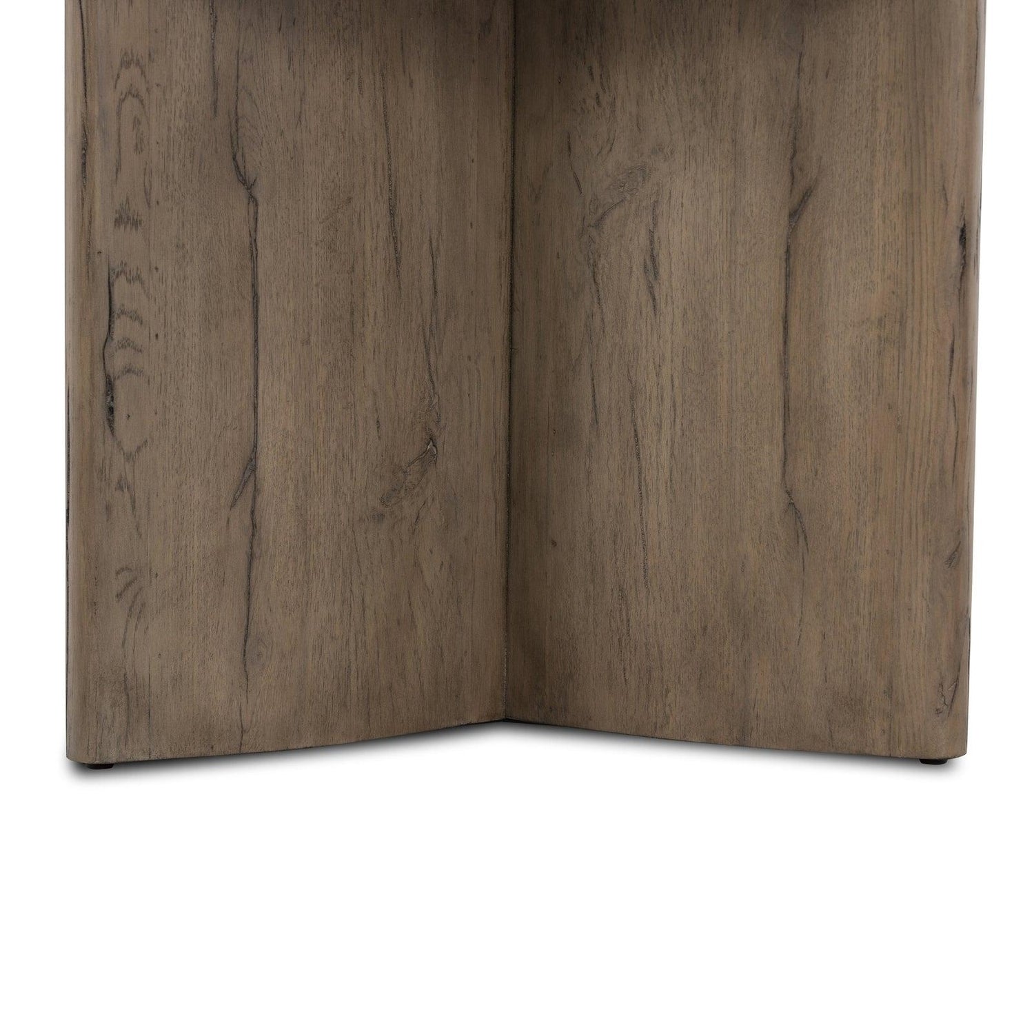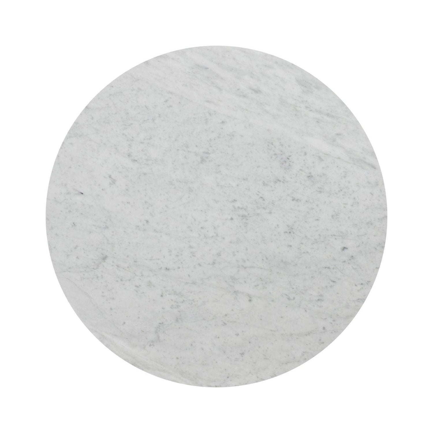 - Con un acabado en gris rústico, el roble de corte grueso forma una base de pedestal robusta para una mesa redondeada de mármol italiano blanco, con vetas naturales maravillosamente sutiles.