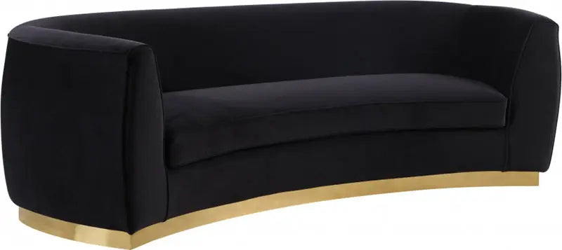 La combinación perfecta de terciopelo negro y acero inoxidable dorado cobra vida en tu espacio con este sofá Julian de terciopelo negro. Este audaz sofá de terciopelo negro viene tapizado en un terciopelo suntuoso y de tacto suntuoso para darle un toque moderno a tu espacio. El diseño curvo del respaldo le da un toque moderno, y el borde de acero inoxidable dorado alrededor de la base realza su atractivo deslumbrante. Combínalo solo o con otras piezas de la colección Julian.