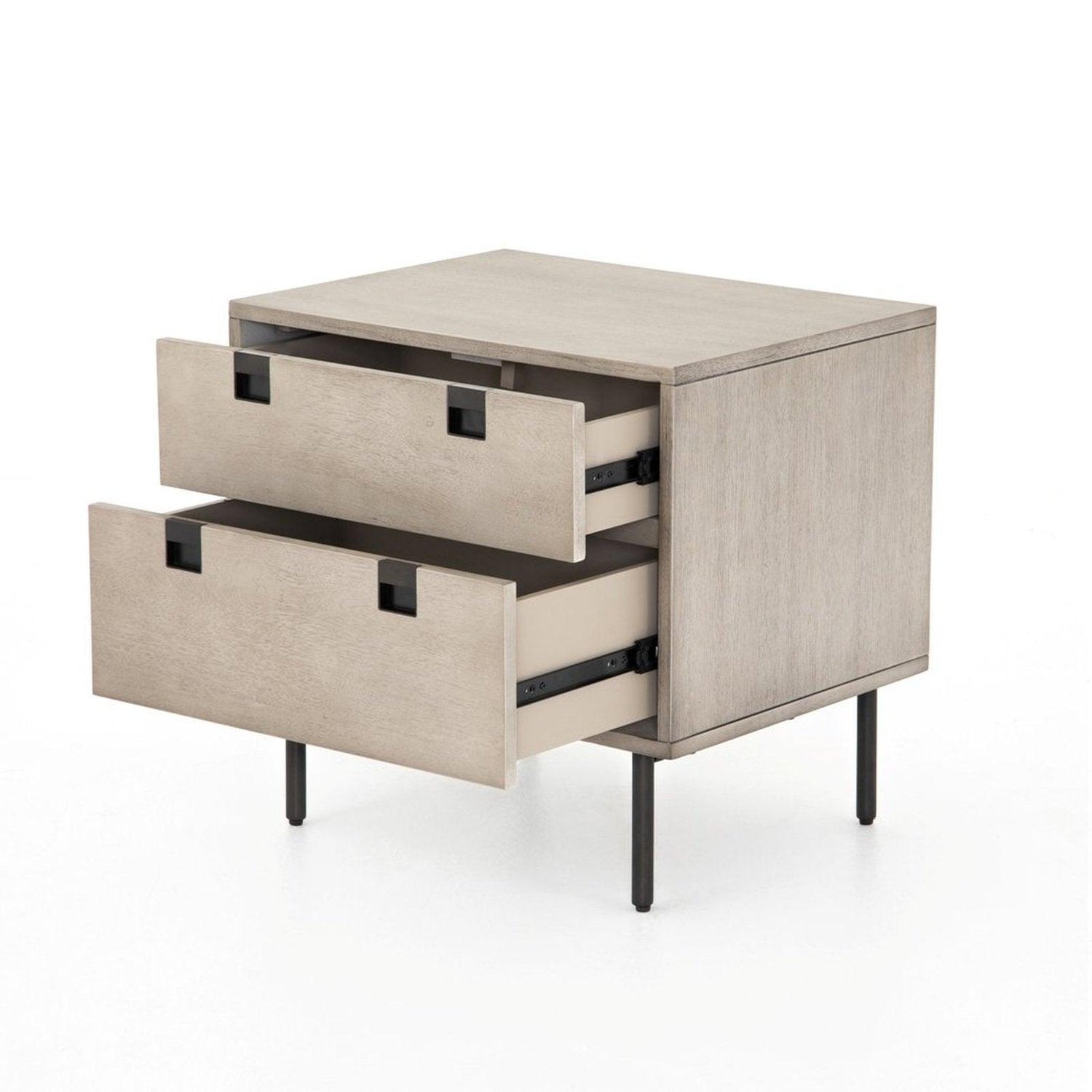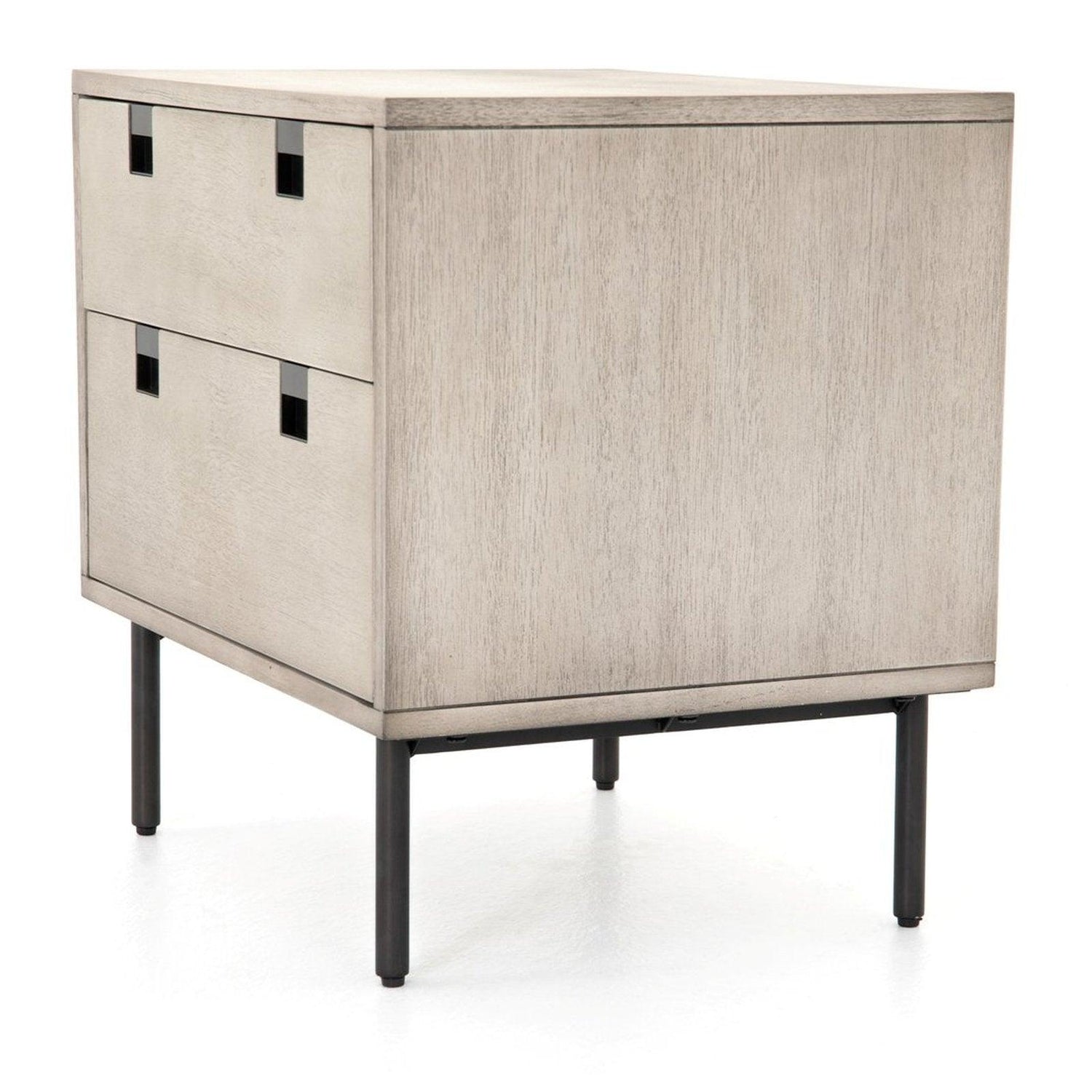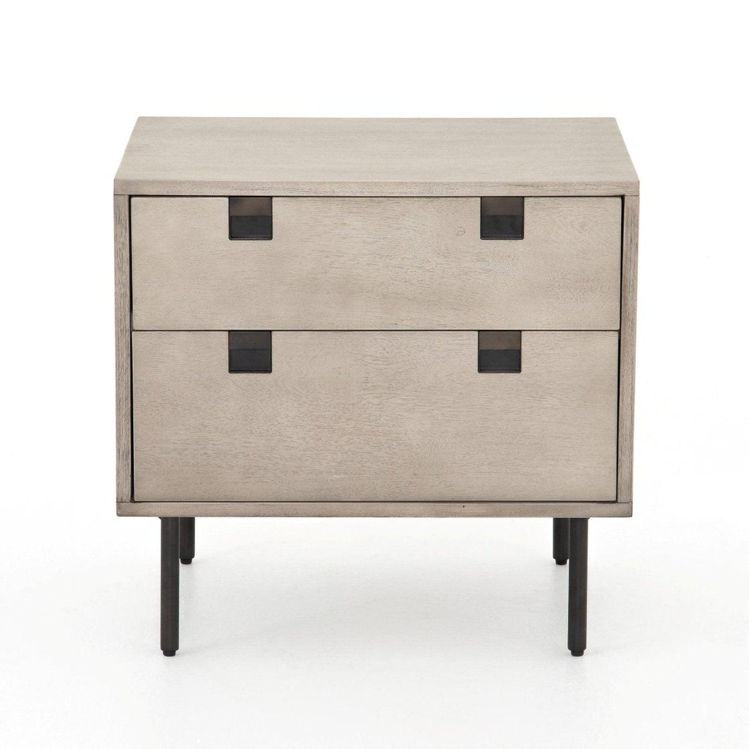 • Una forma limpia y cúbica aporta un aspecto estructurado pero ligero al almacenamiento junto a la cama, con cajones dobles de chapa de acacia lavada en gris colocados sobre patas de hierro con acabado en bronce antiguo.