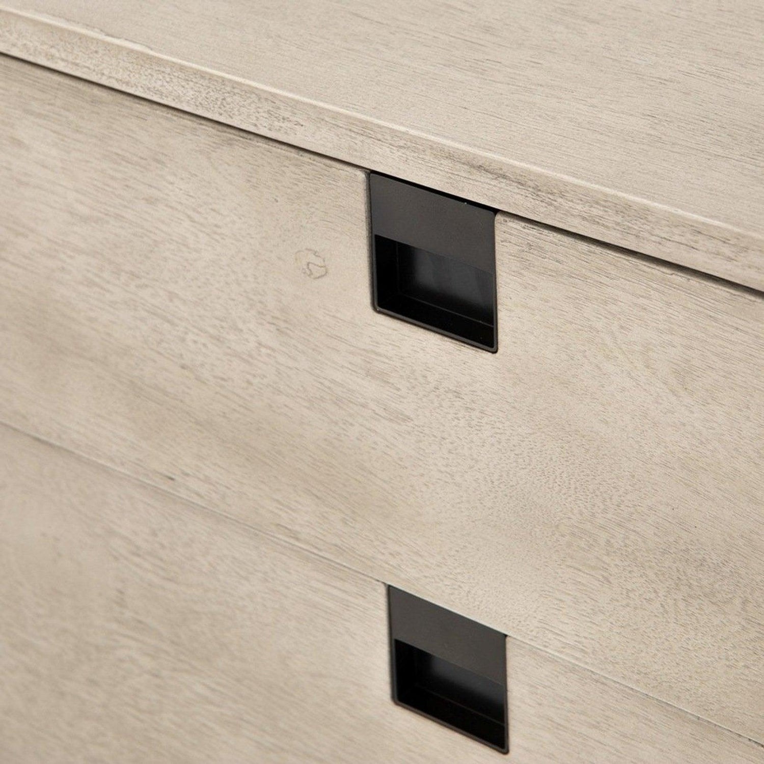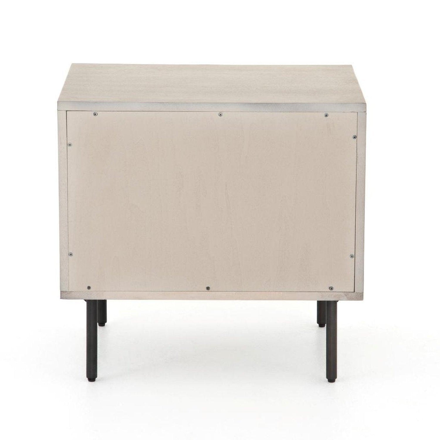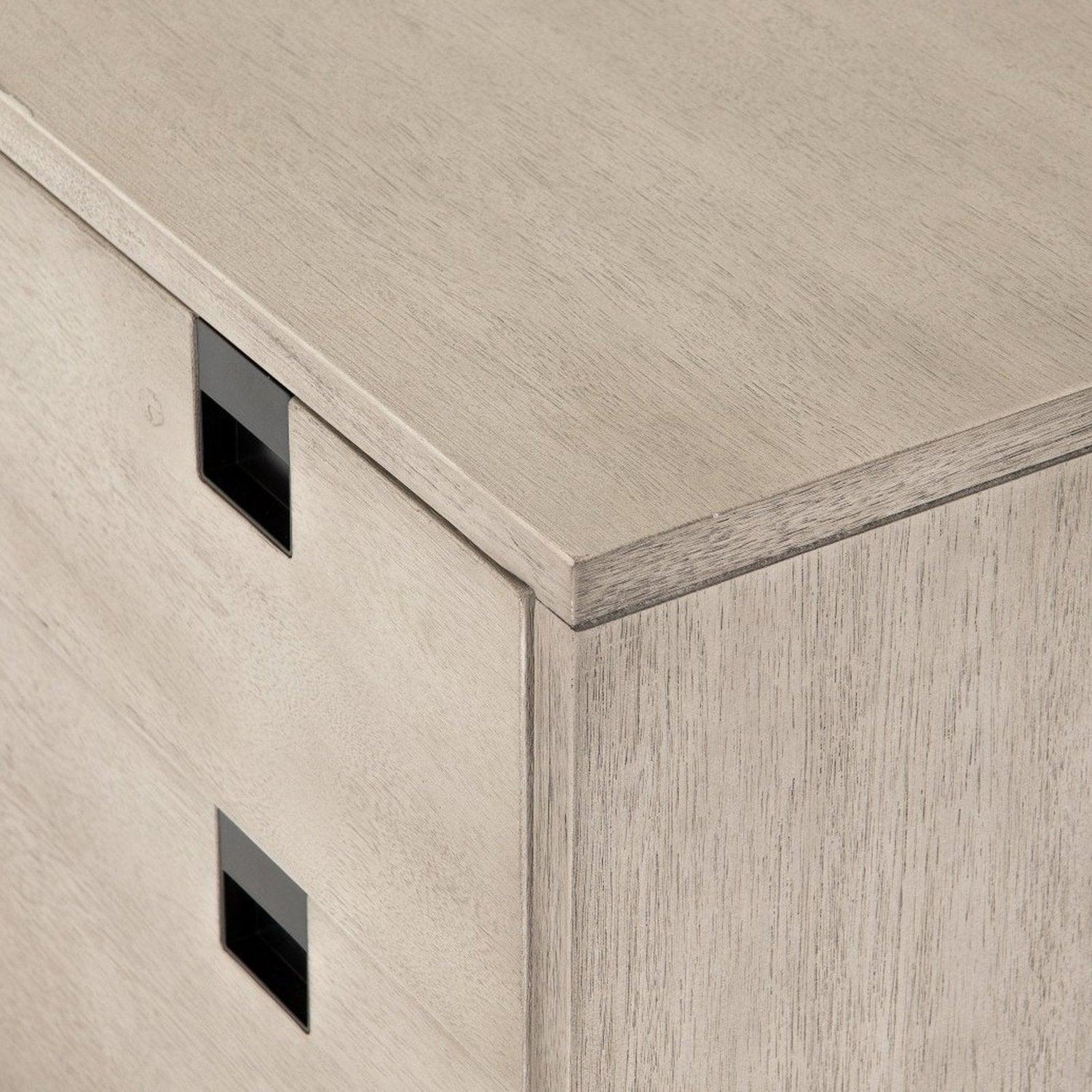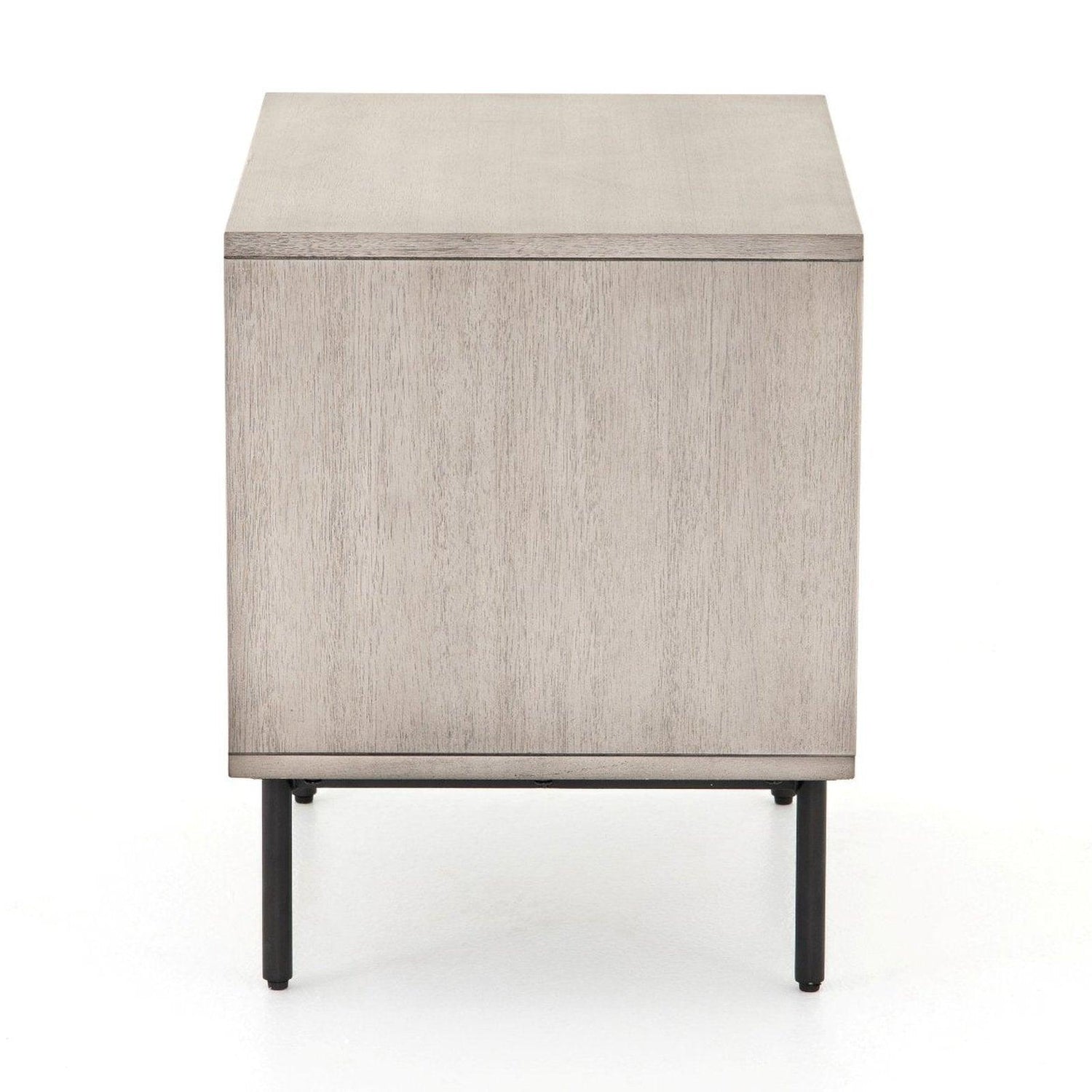 • Una forma limpia y cúbica aporta un aspecto estructurado pero ligero al almacenamiento junto a la cama, con cajones dobles de chapa de acacia lavada en gris colocados sobre patas de hierro con acabado en bronce antiguo.