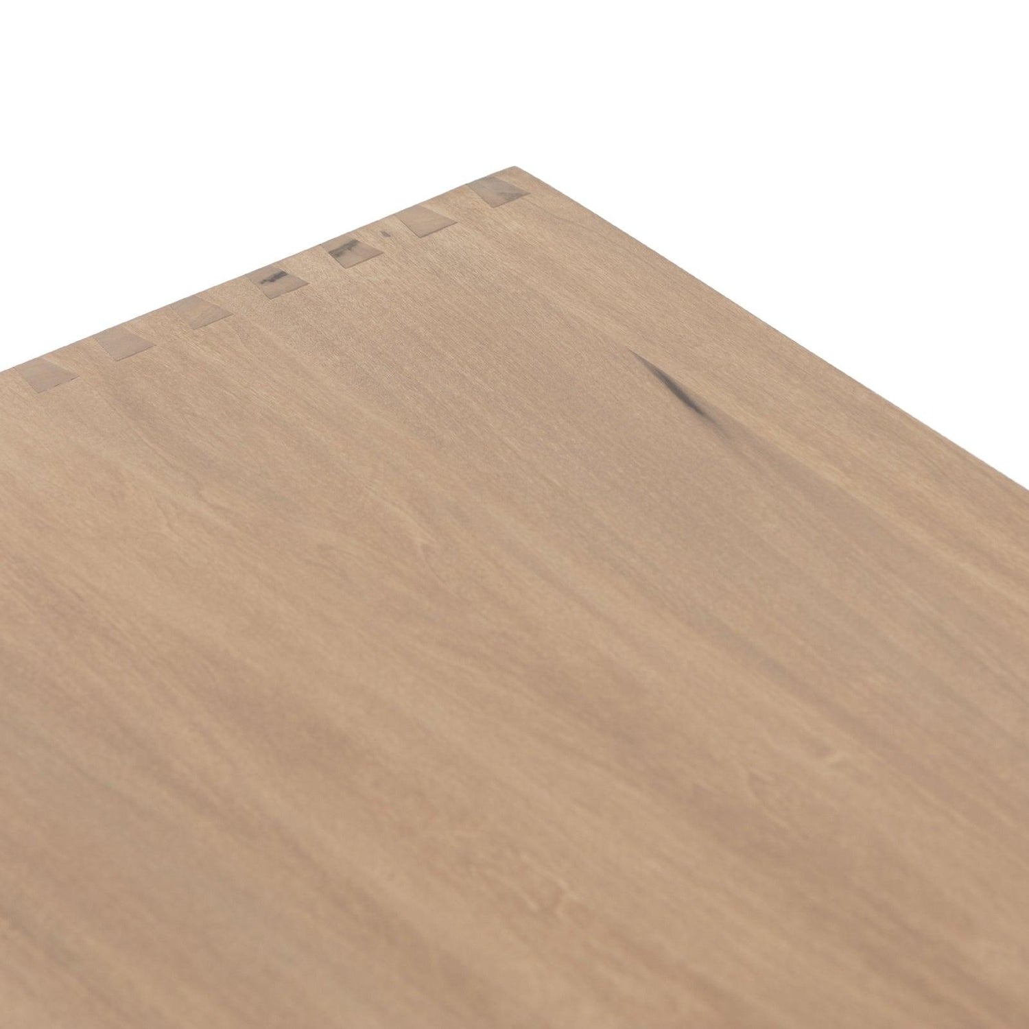 • El álamo macizo lavado en seco forma una mesita de noche cúbica, con uniones de cola de milano y herrajes de hierro y cuero para una actualización fresca e impulsada por los materiales del estilo inspirado en Shaker.