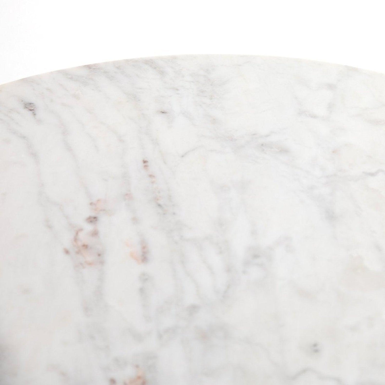 - Una base de aluminio de níquel cepillado se interseca para crear ángulos rectos limpios, con una mesa gruesa de mármol blanco pulido.