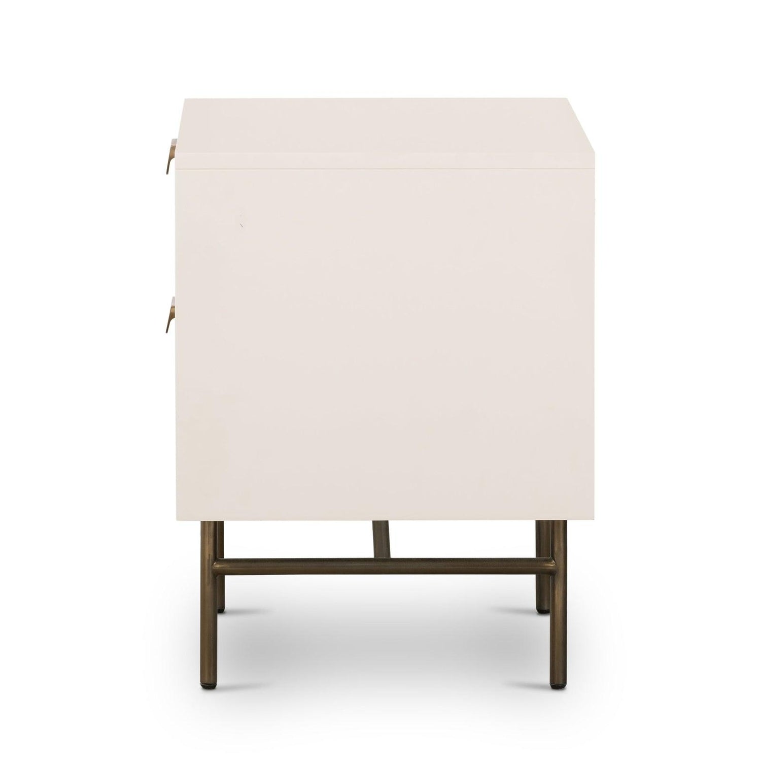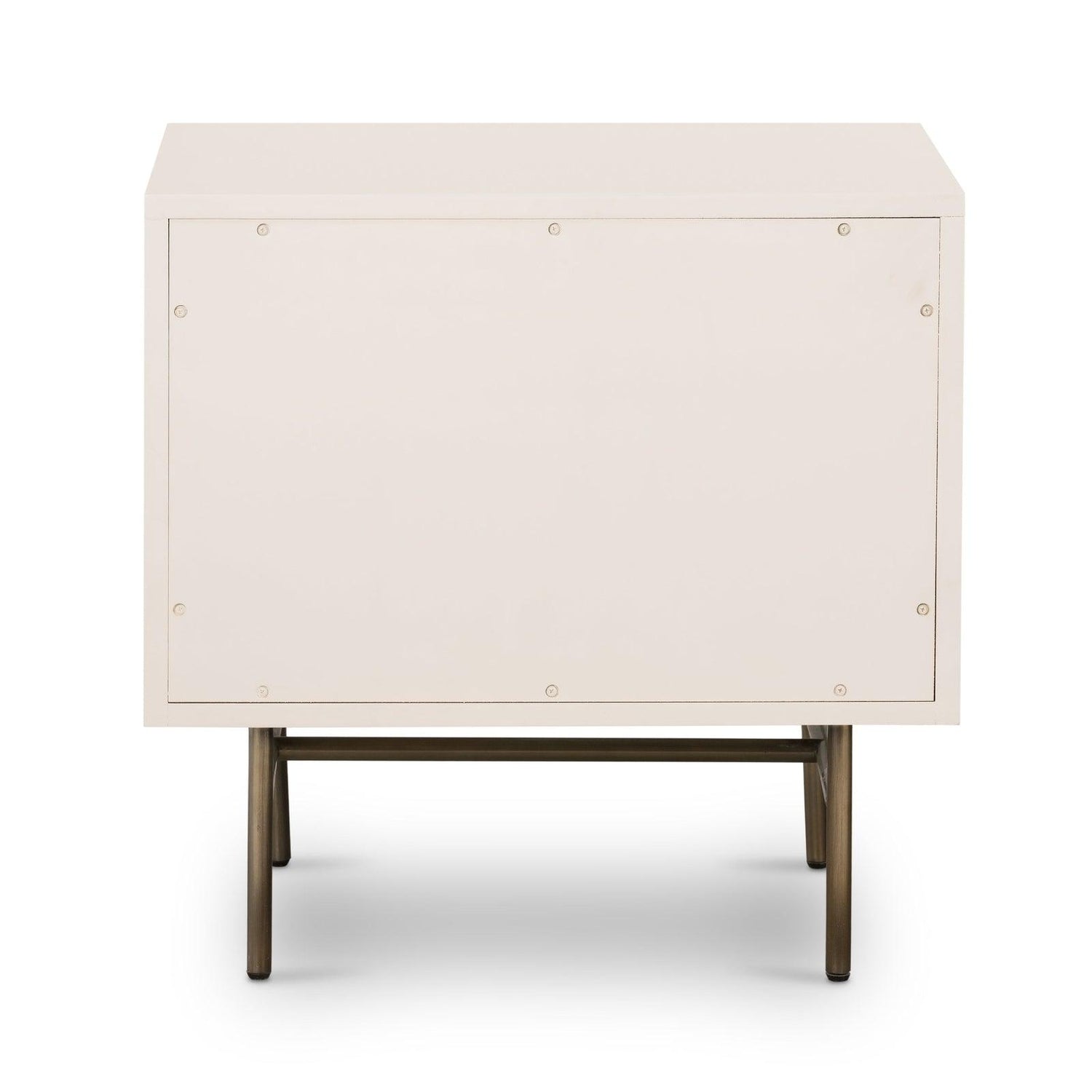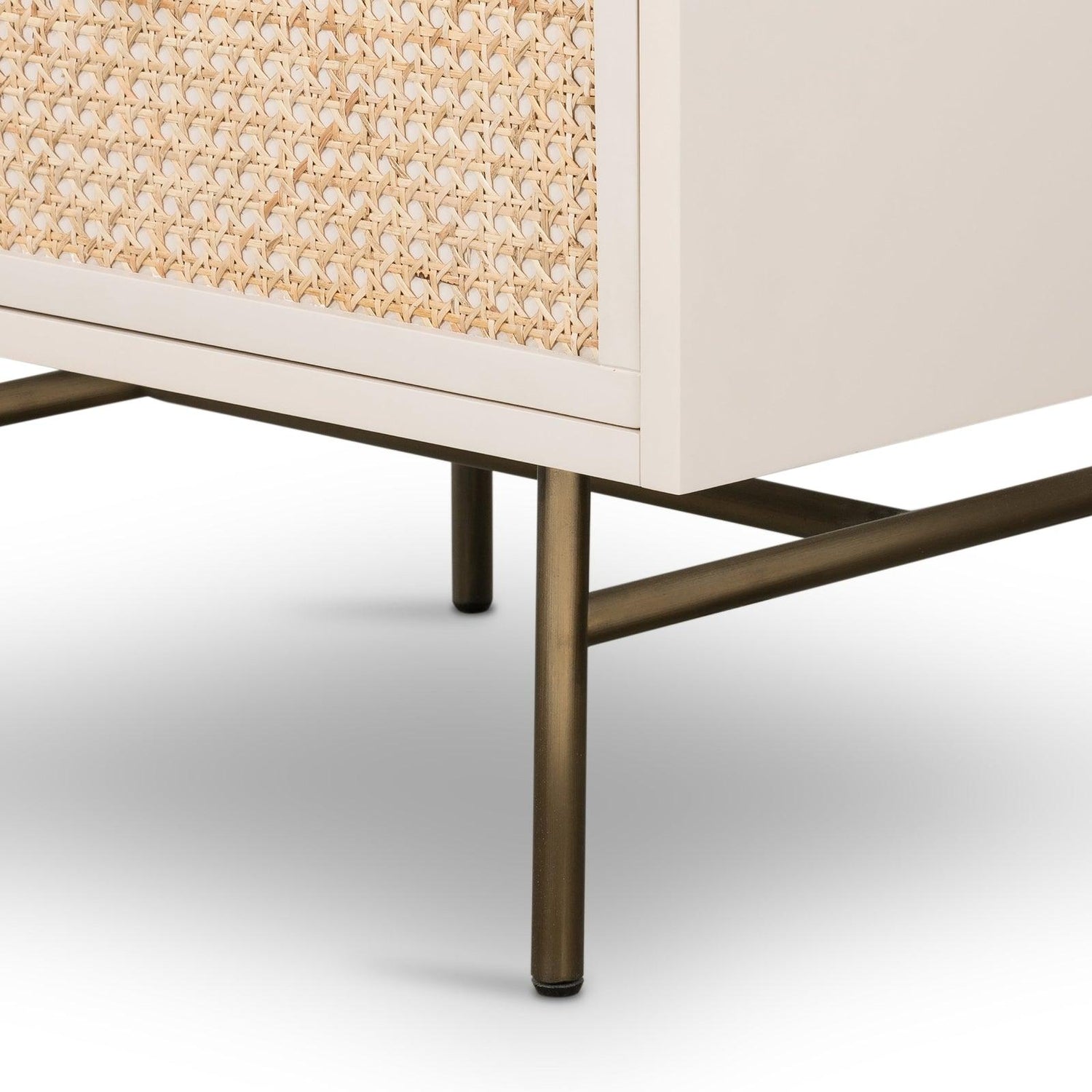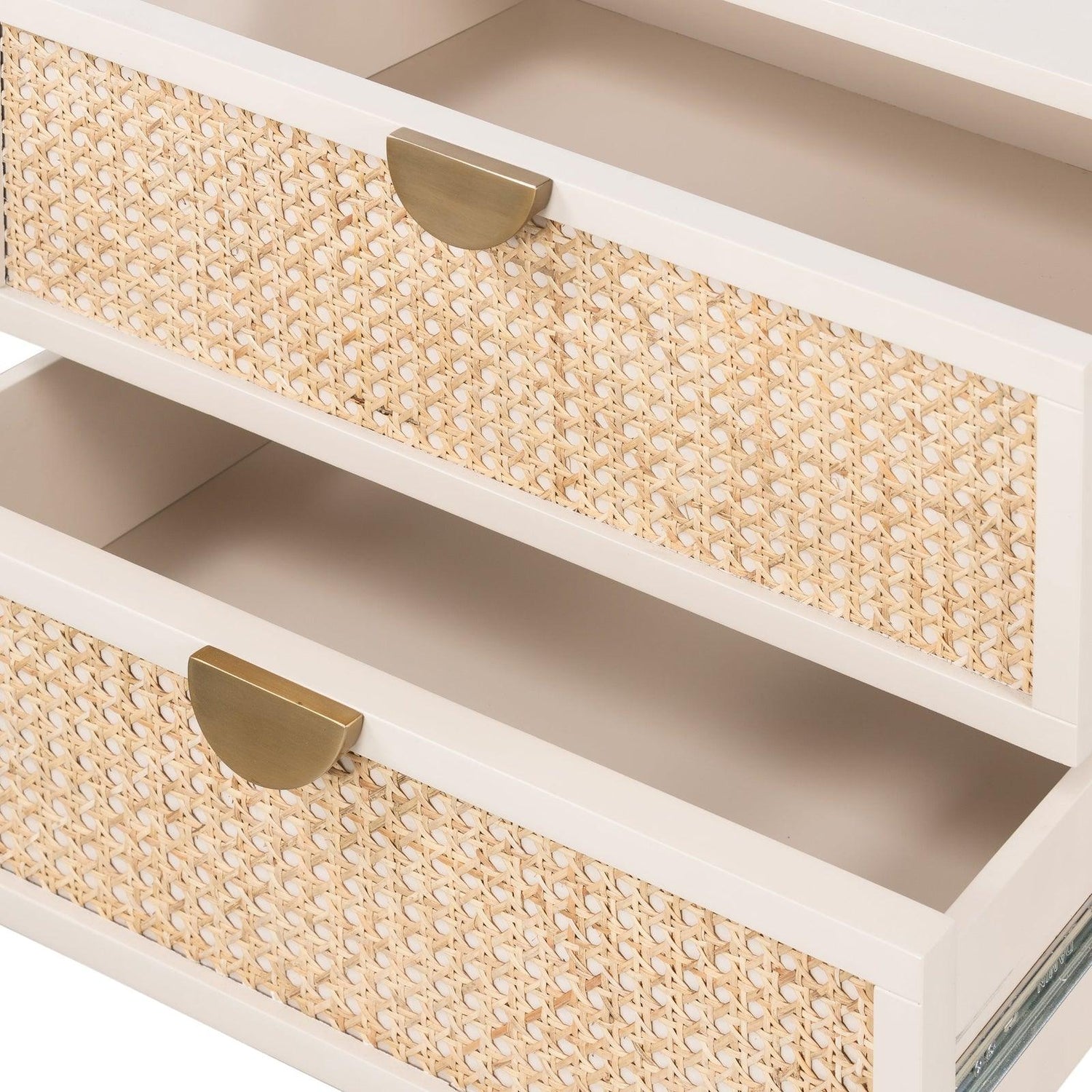 • Una mesita de noche de dos cajones presenta paneles de caña tejida y herrajes en forma de media luna con acabado en latón envejecido.