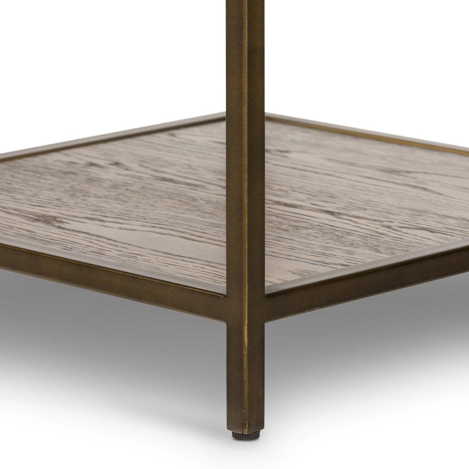 - Un rico acabado color avellana le da profundidad a esta mesita de noche de roble de estilo simple, con bandas de bronce frotado que le dan un toque moderno.