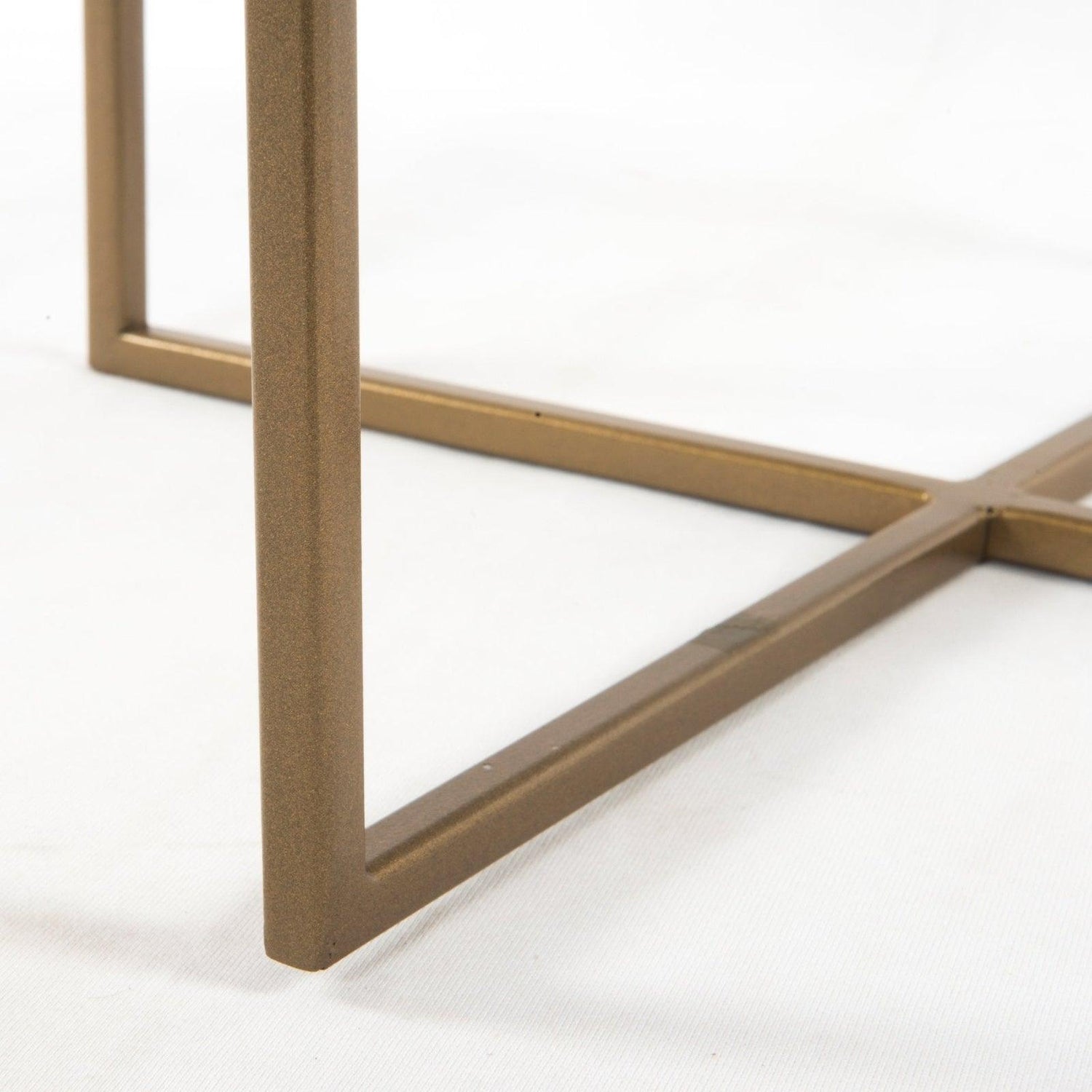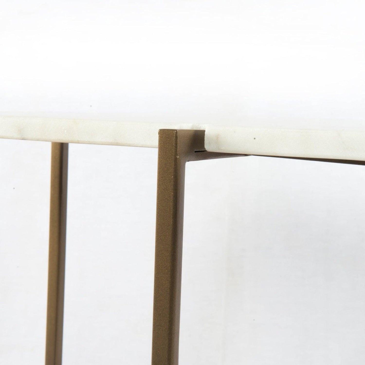 - El hierro delgado con acabado de latón antiguo forma una X para sostener niveles de metal perforado y mármol blanco pulido para lograr una apariencia de simple gracia.