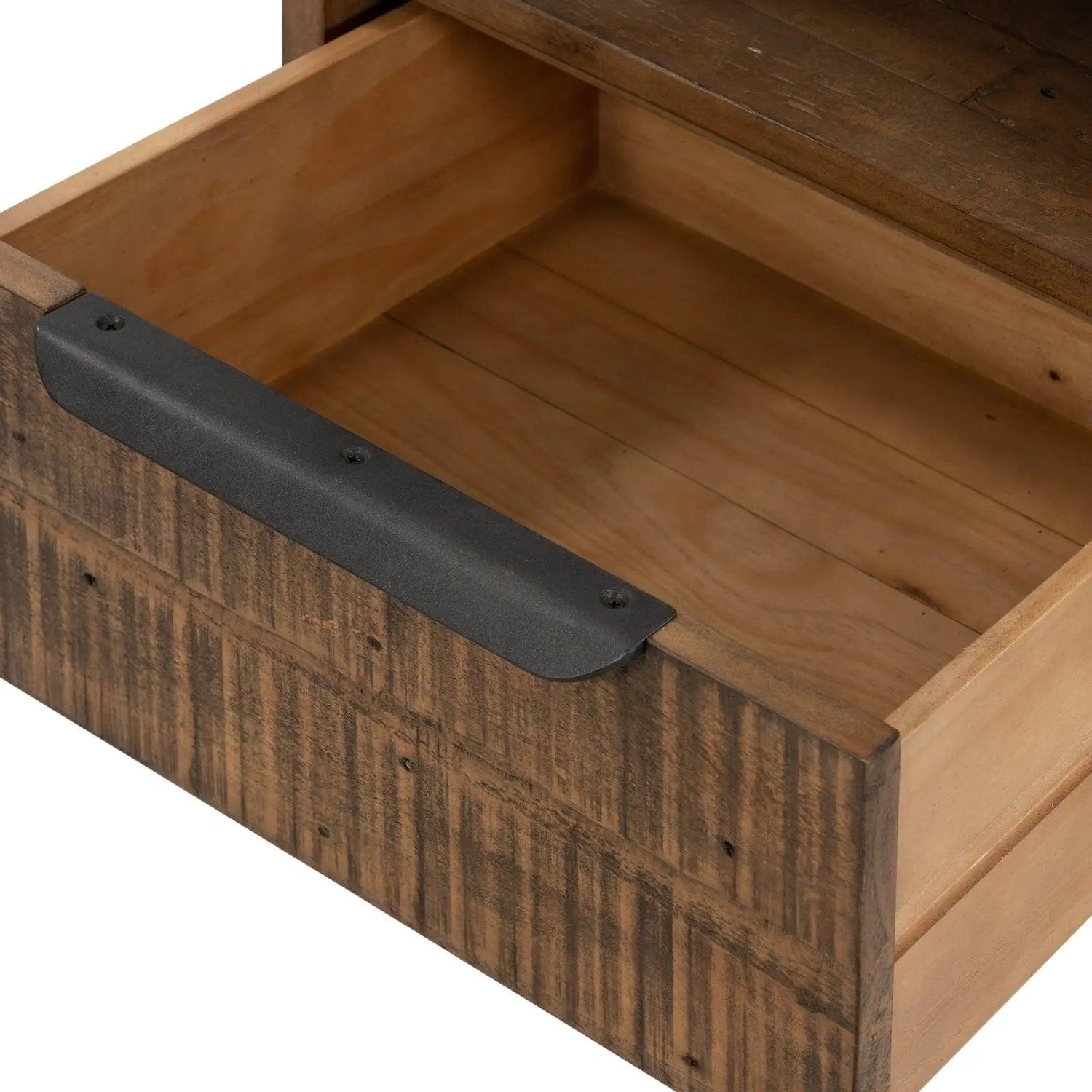 - Con un acabado en sándalo rústico, el pino macizo recuperado hace alarde de su veta natural, con herrajes de hierro planos con acabado metalizado que acentúan un espacioso cajón individual, ideal para un práctico almacenamiento junto a la cama.