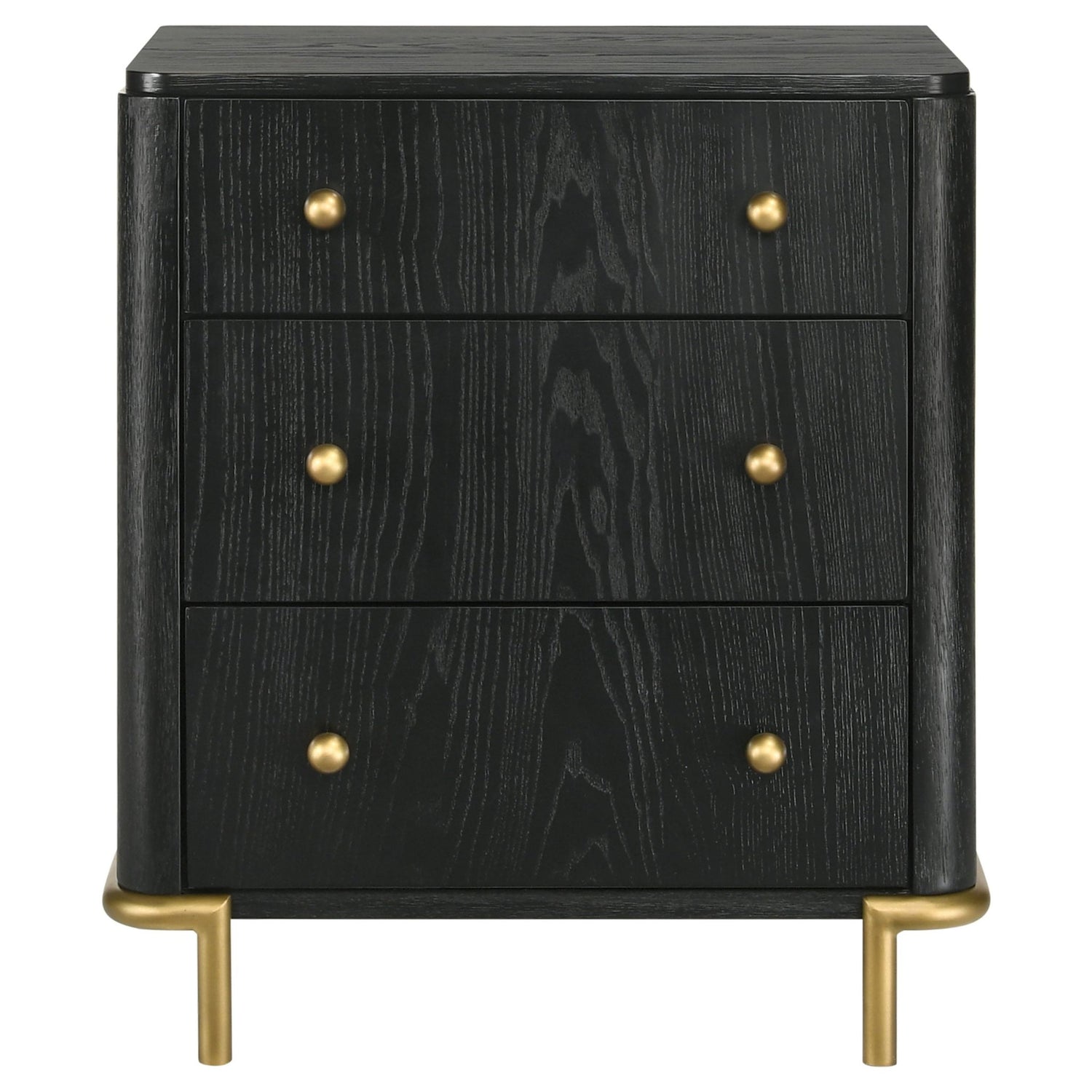 Dale un toque fresco a tu dormitorio con una moderna mesita de noche. Sus tres cajones ofrecen amplio espacio de almacenamiento junto a la cama, ideal para libros y objetos personales. El cajón superior incluye una tapa de fieltro para proteger tus objetos importantes, y un puerto USB integrado facilita el acceso para cargar tu teléfono fácilmente por la noche o mientras descansas en la cama. La mesita de noche presenta un nítido acabado negro cepillado que realza sus detalles de veta de madera, y los pomos y patas con acabado dorado añaden la dosis perfecta de calidez contrastante. Las esquinas redondeadas suavizan la silueta, mientras que la generosa tapa es perfecta para una lámpara de lectura o como elemento decorativo.