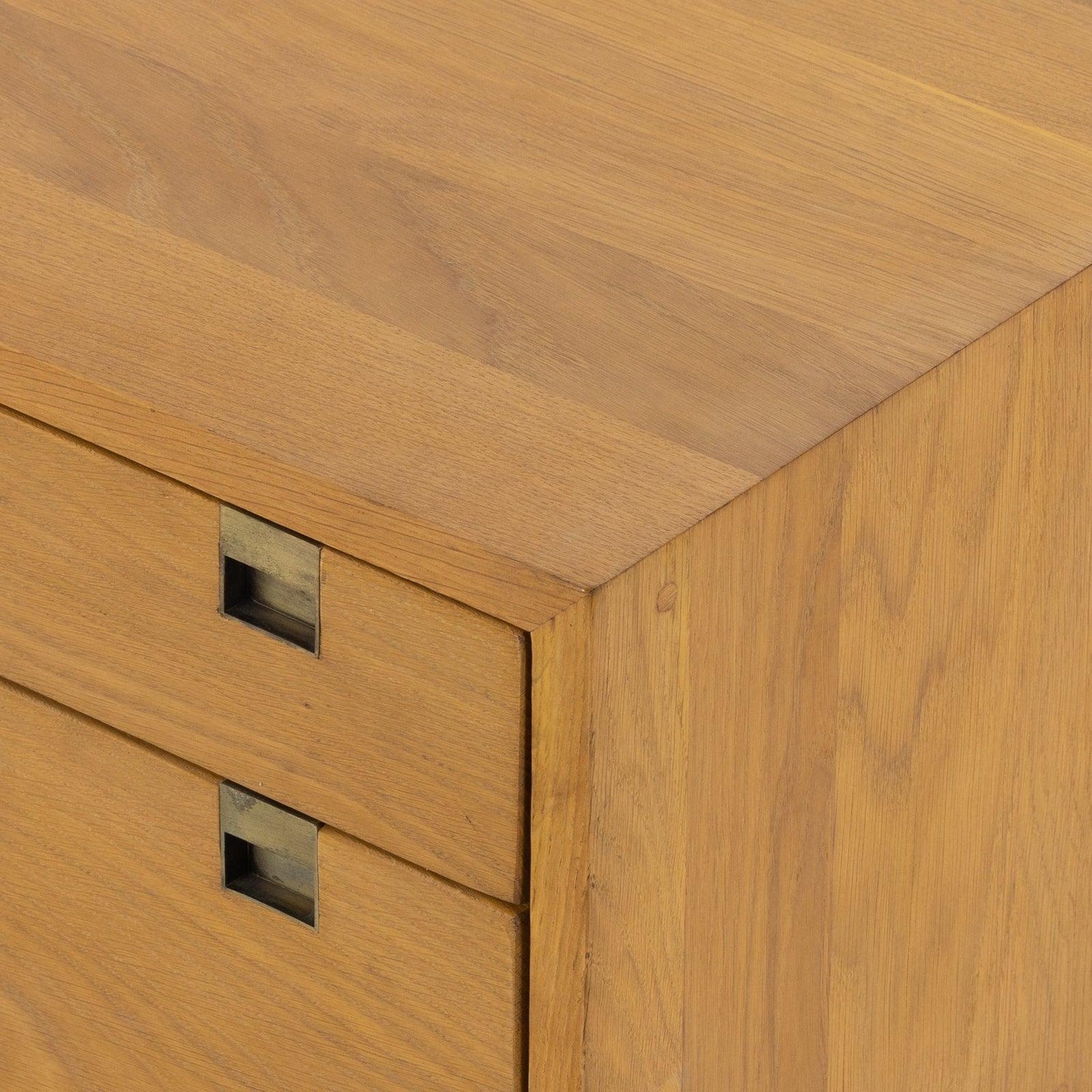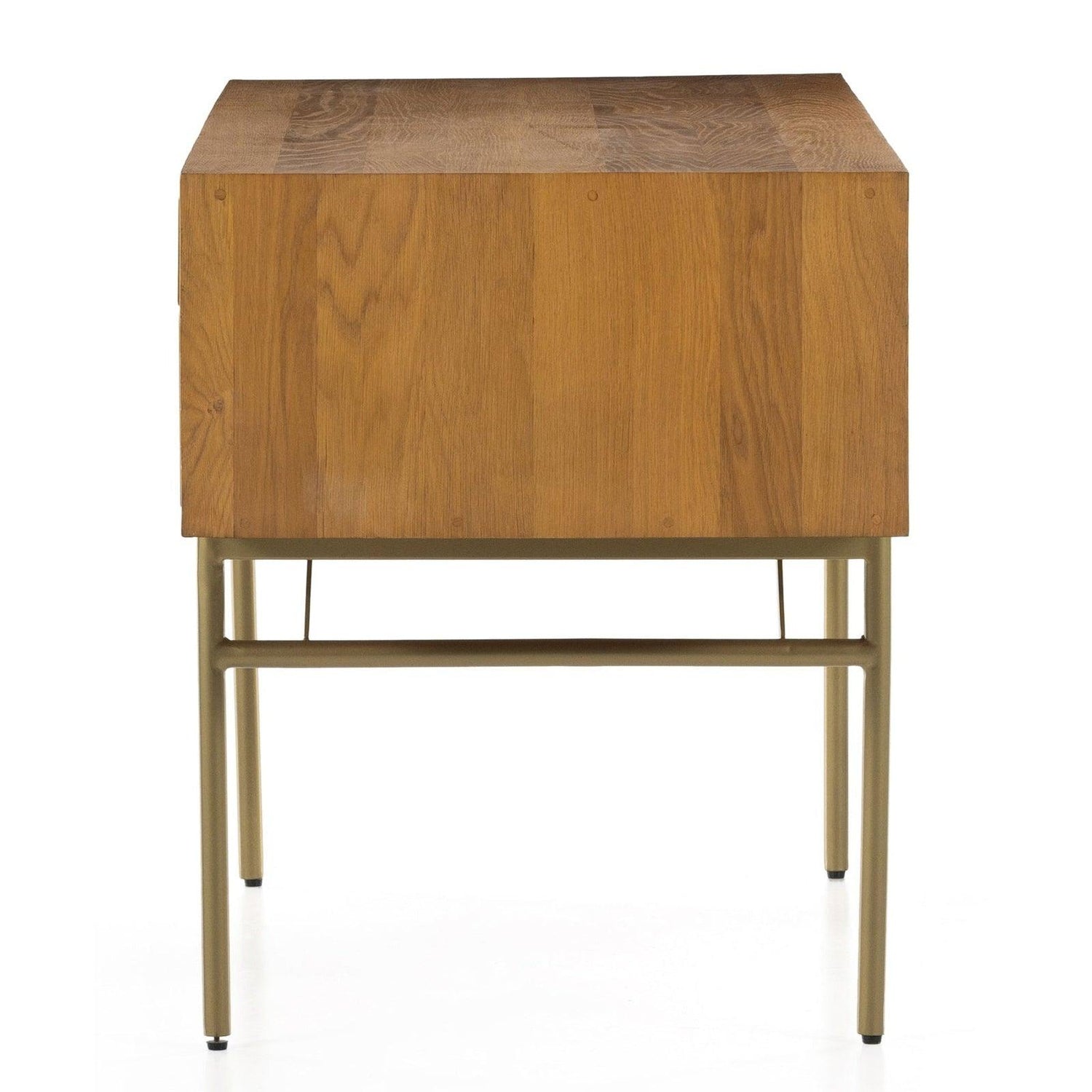 - Un escritorio delgado y aerodinámico de roble natural macizo presenta herrajes cuadrados y patas aireadas con acabado en latón satinado.