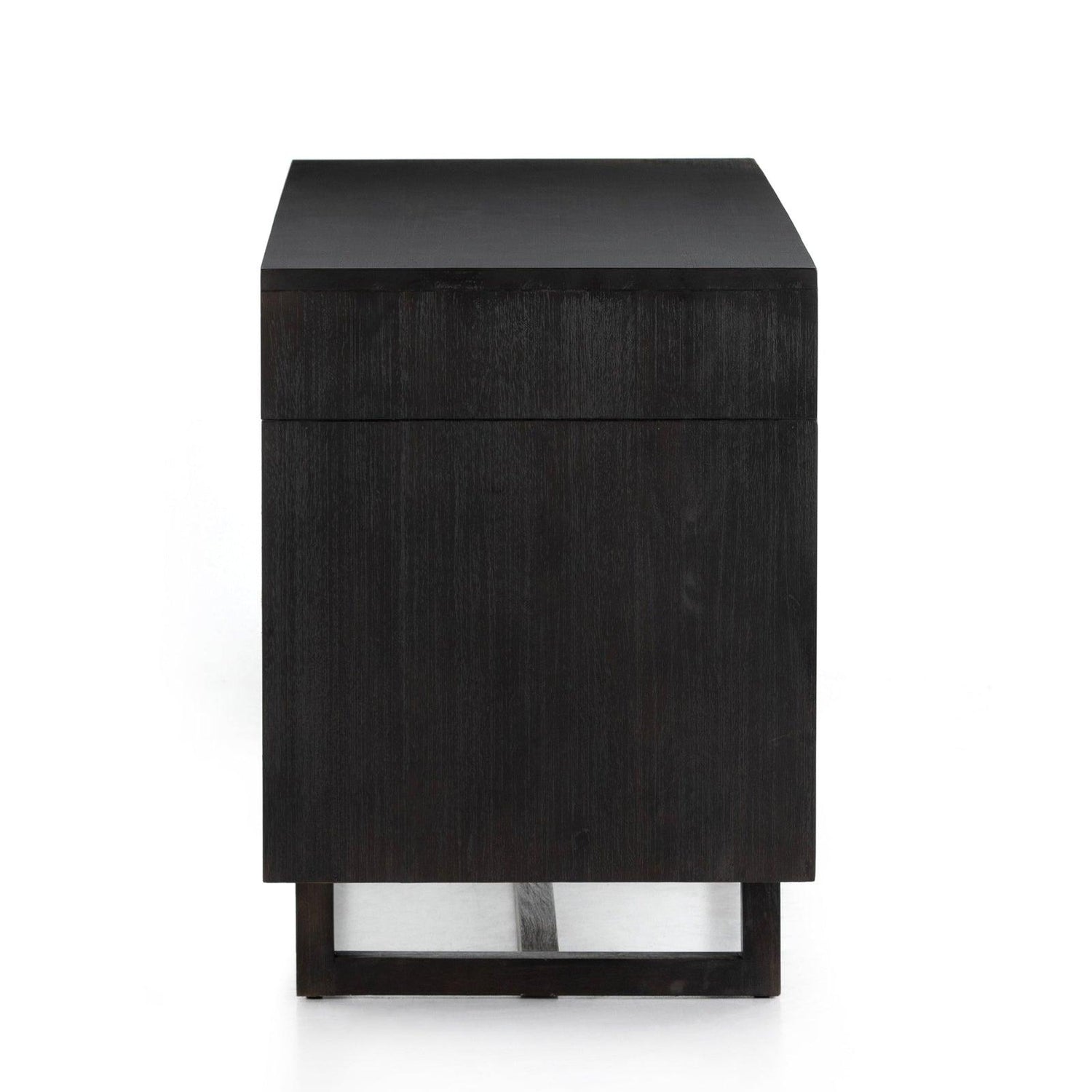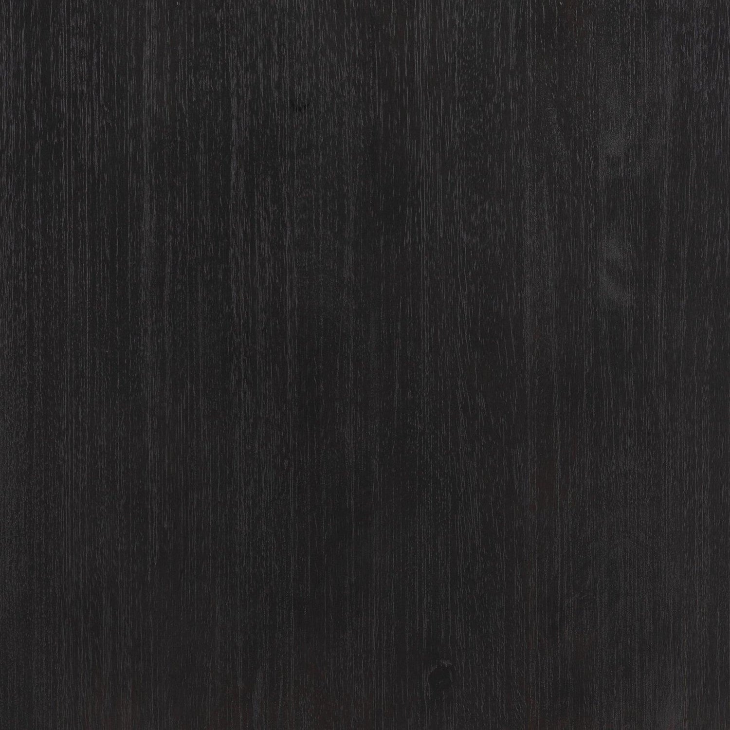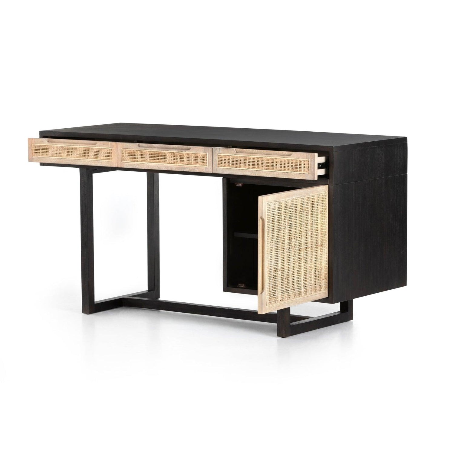 • Un escritorio con textura de mango natural/lavado en negro cuenta con tres cajones cubiertos de caña y gabinetes para guardar archivos de forma práctica.