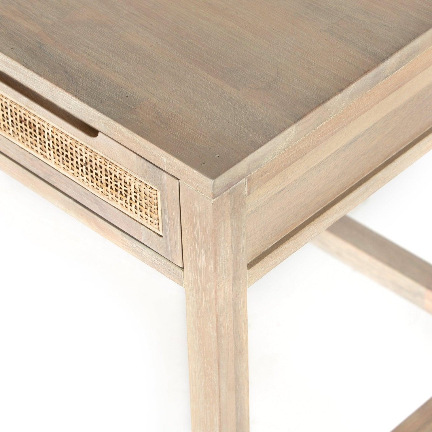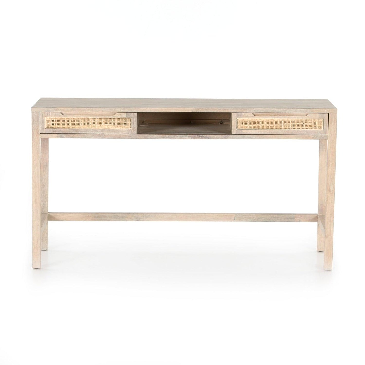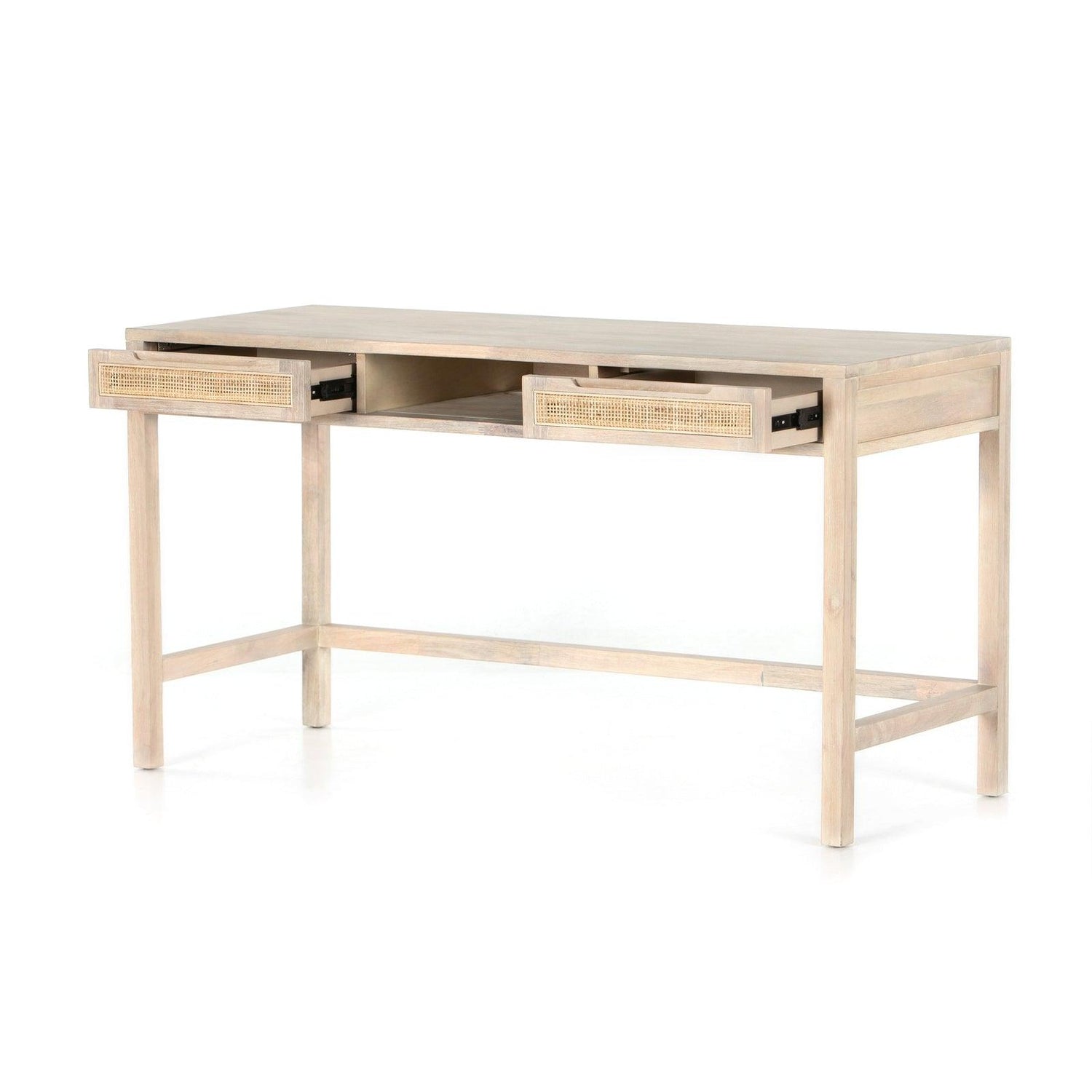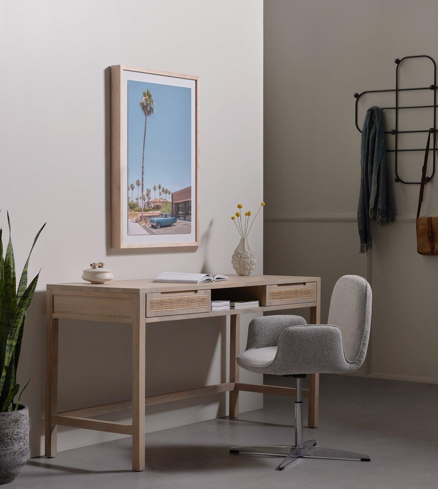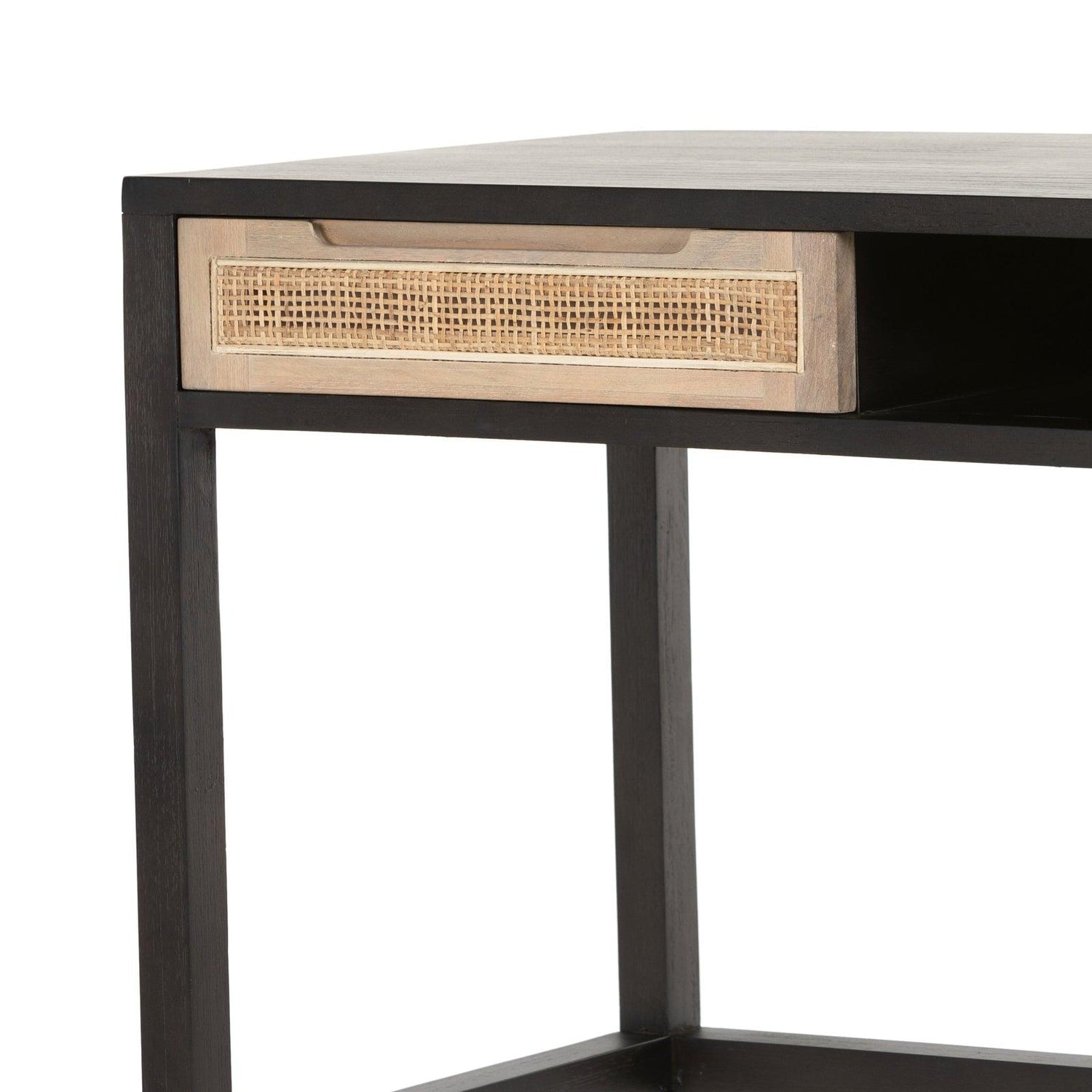 - Con una silueta delgada y angular, un escritorio modular de mango lavado en negro/mango lavado en blanco presenta frentes de cajones cubiertos de caña natural más un cubículo central abierto, que aporta almacenamiento, contraste y textura a la oficina moderna.