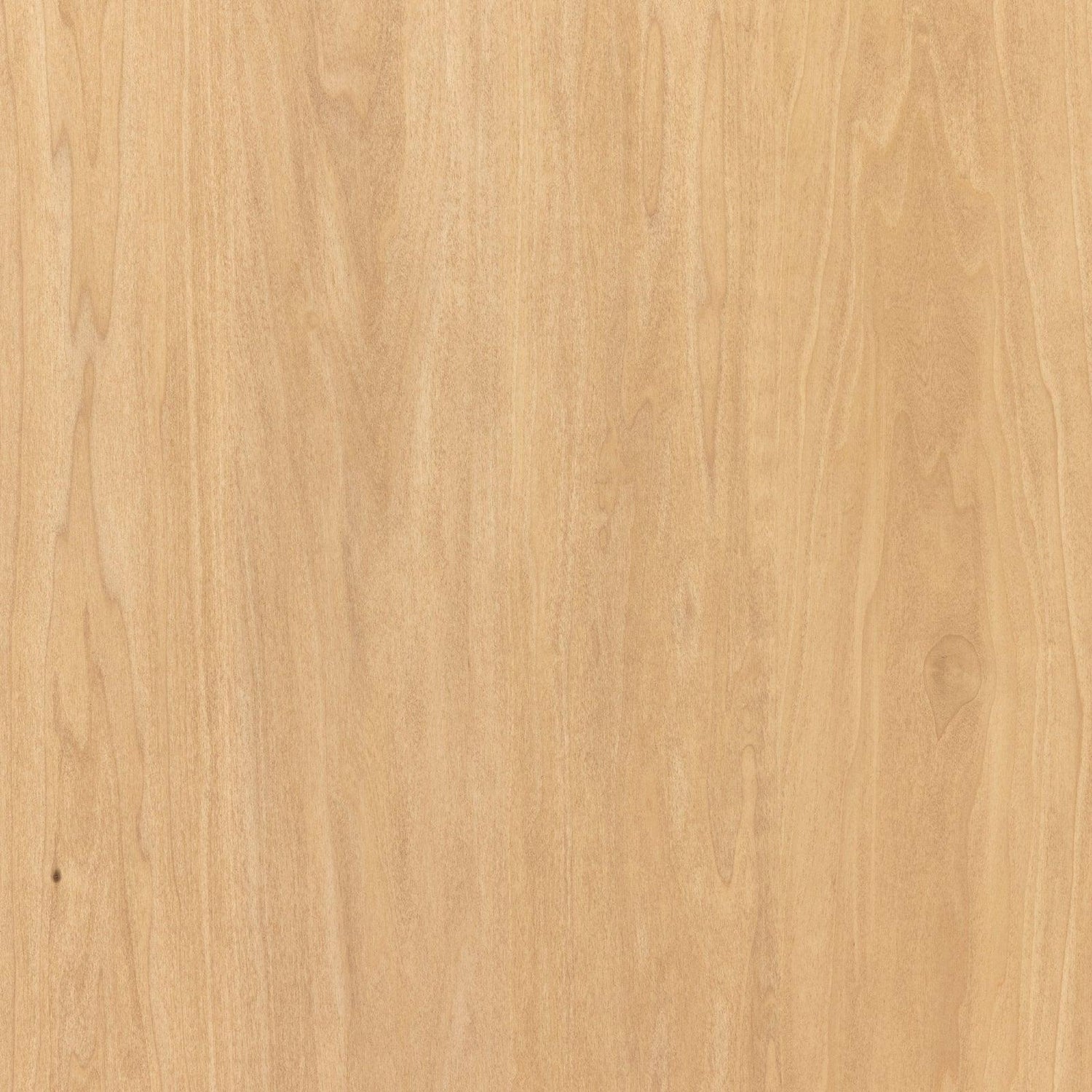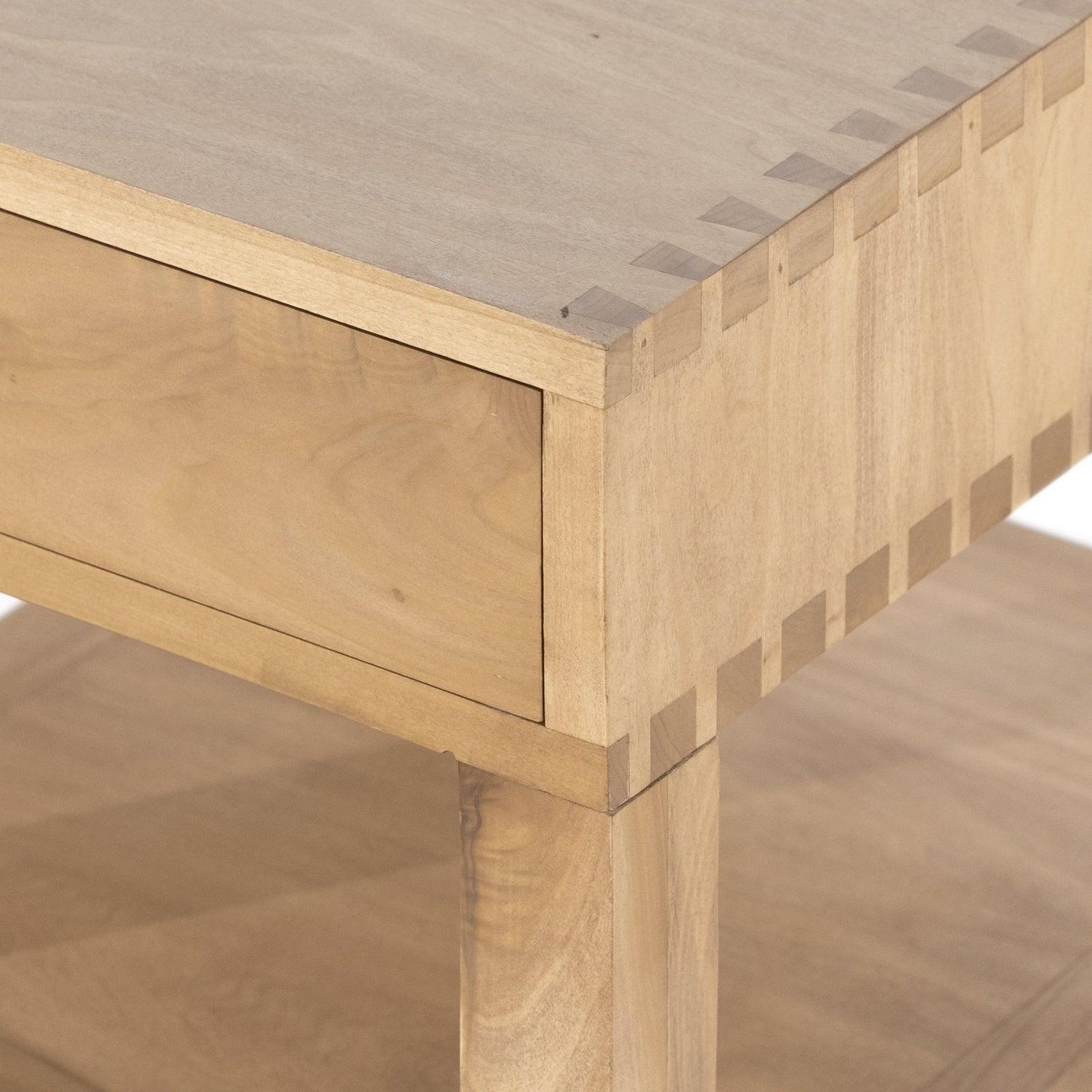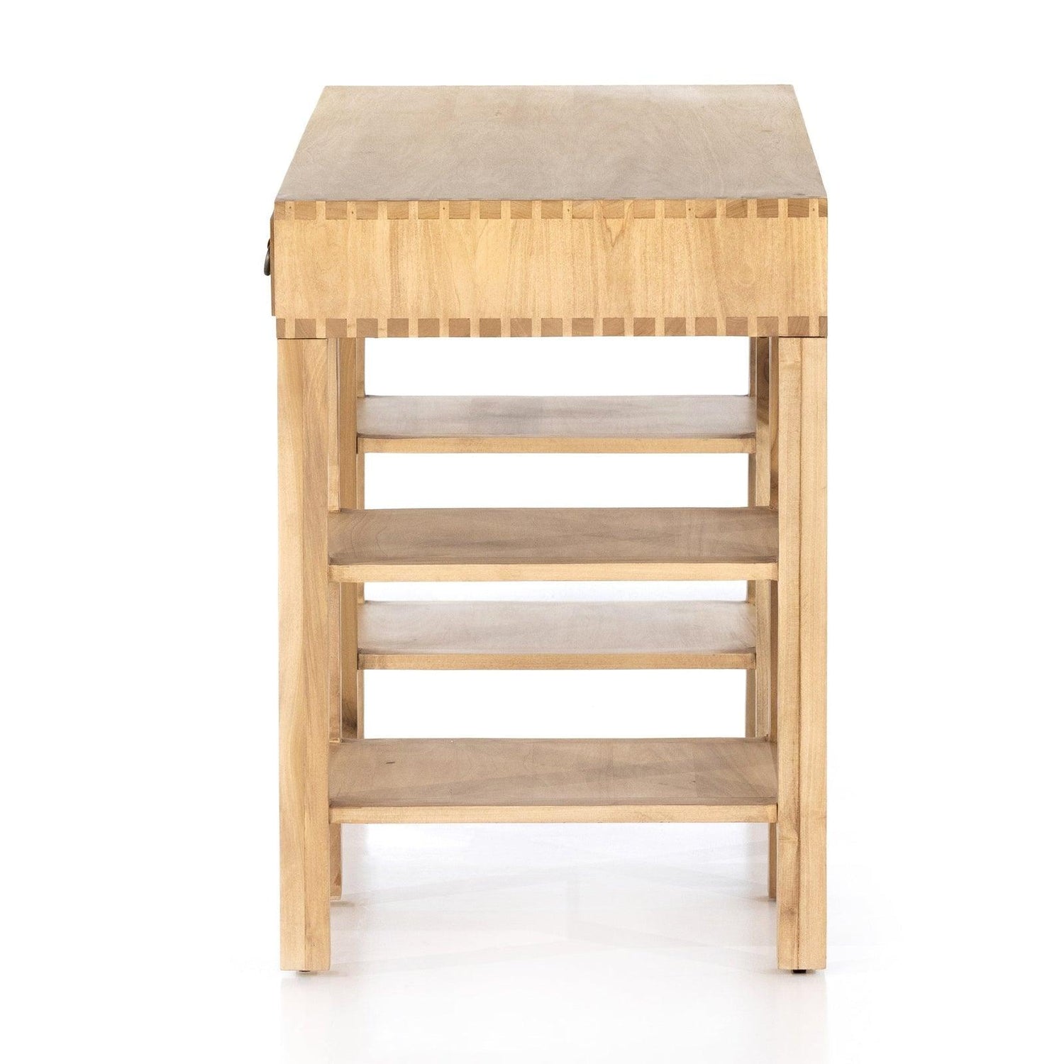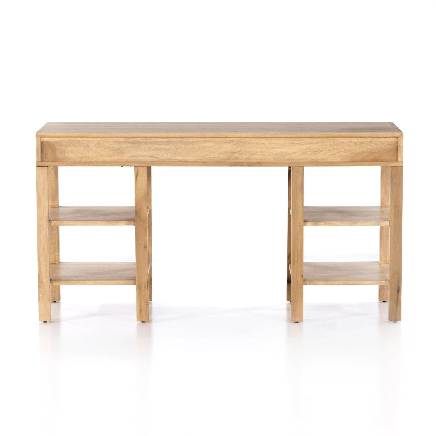 • El álamo lavado en seco forma un escritorio limpio, inspirado en los años setenta, con tres cajones y generosos estantes abiertos.