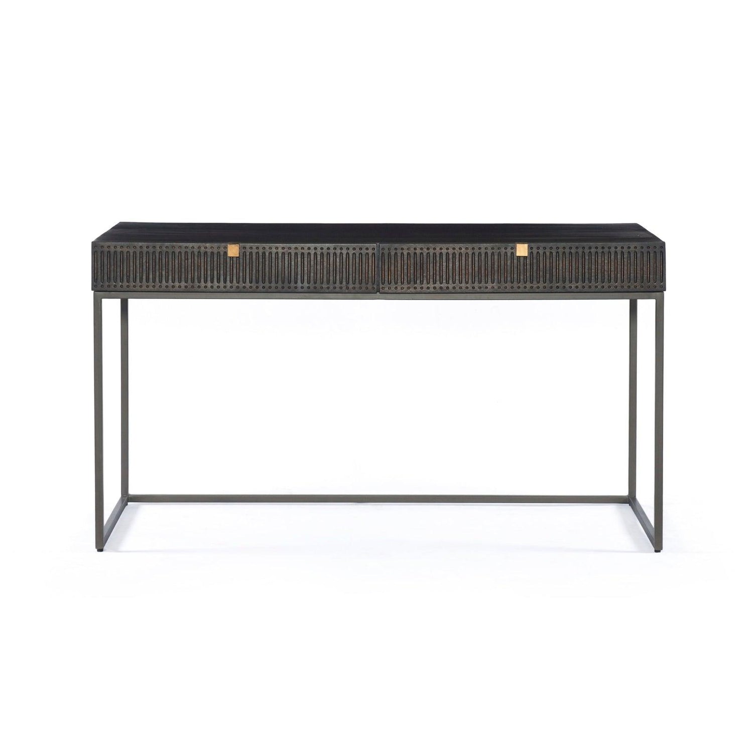 - Una base delgada de hierro agrega un aspecto largo y aireado, mientras que los cajones dobles mantienen los elementos esenciales del escritorio a mano.