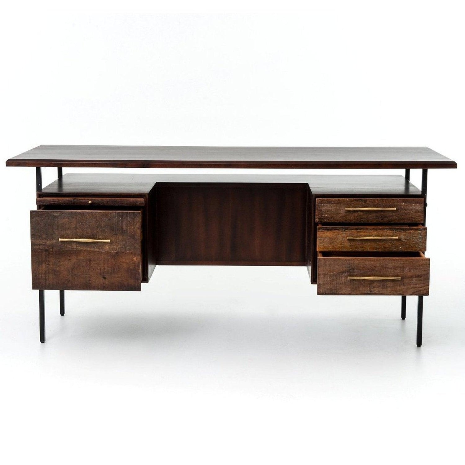 - Este escritorio de abogado inspirado en mediados de siglo ofrece almacenamiento resistente con gabinetes de dos lados.