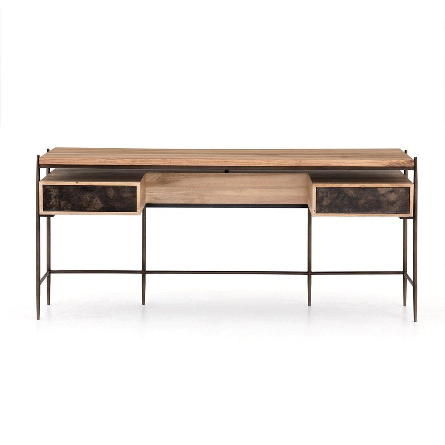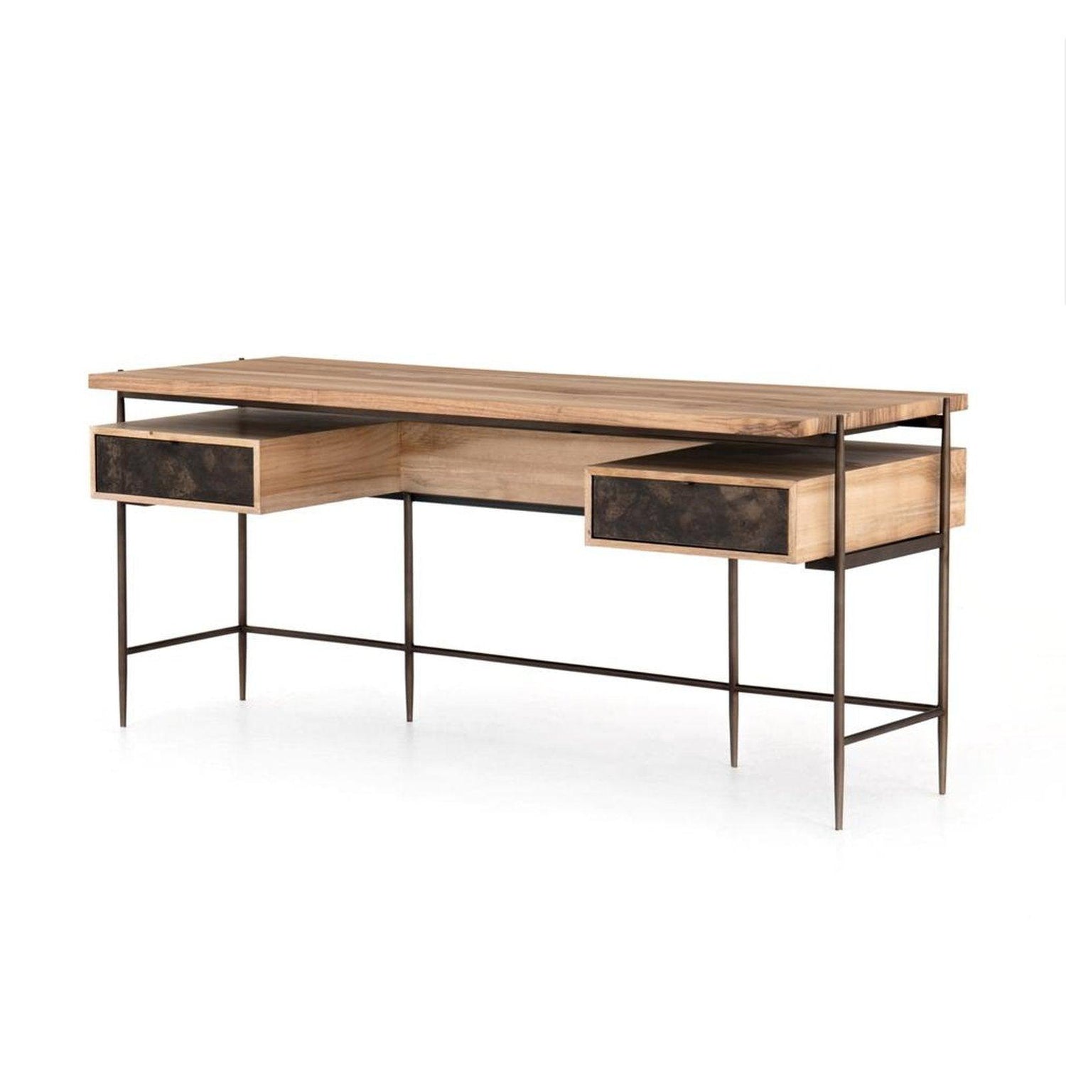 - Los altos y bajos naturales se capturan en una superficie flotante de nogal italiano con acabado rubio, con marcos de hierro desgastado y frentes de cajones que agregan contraste textural.