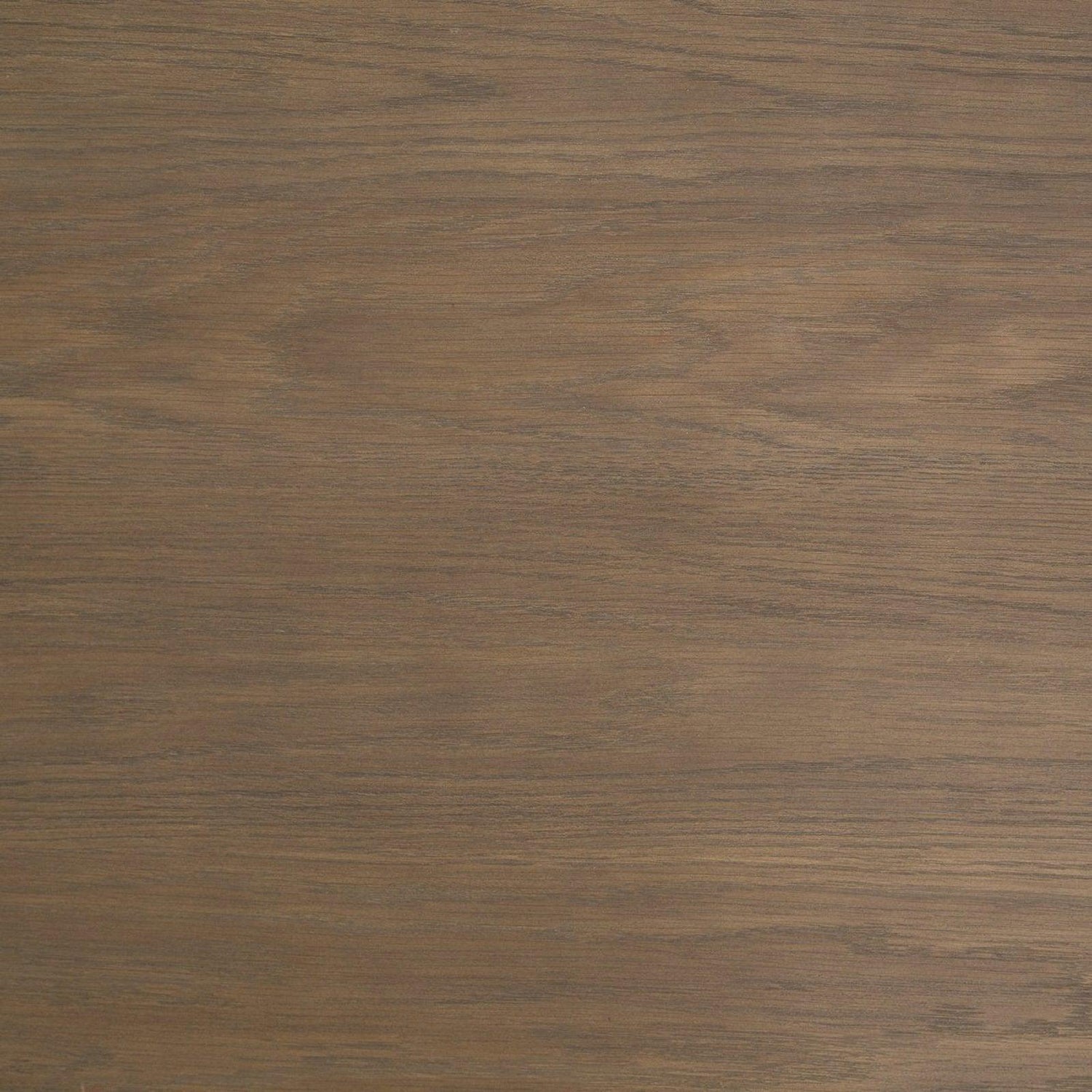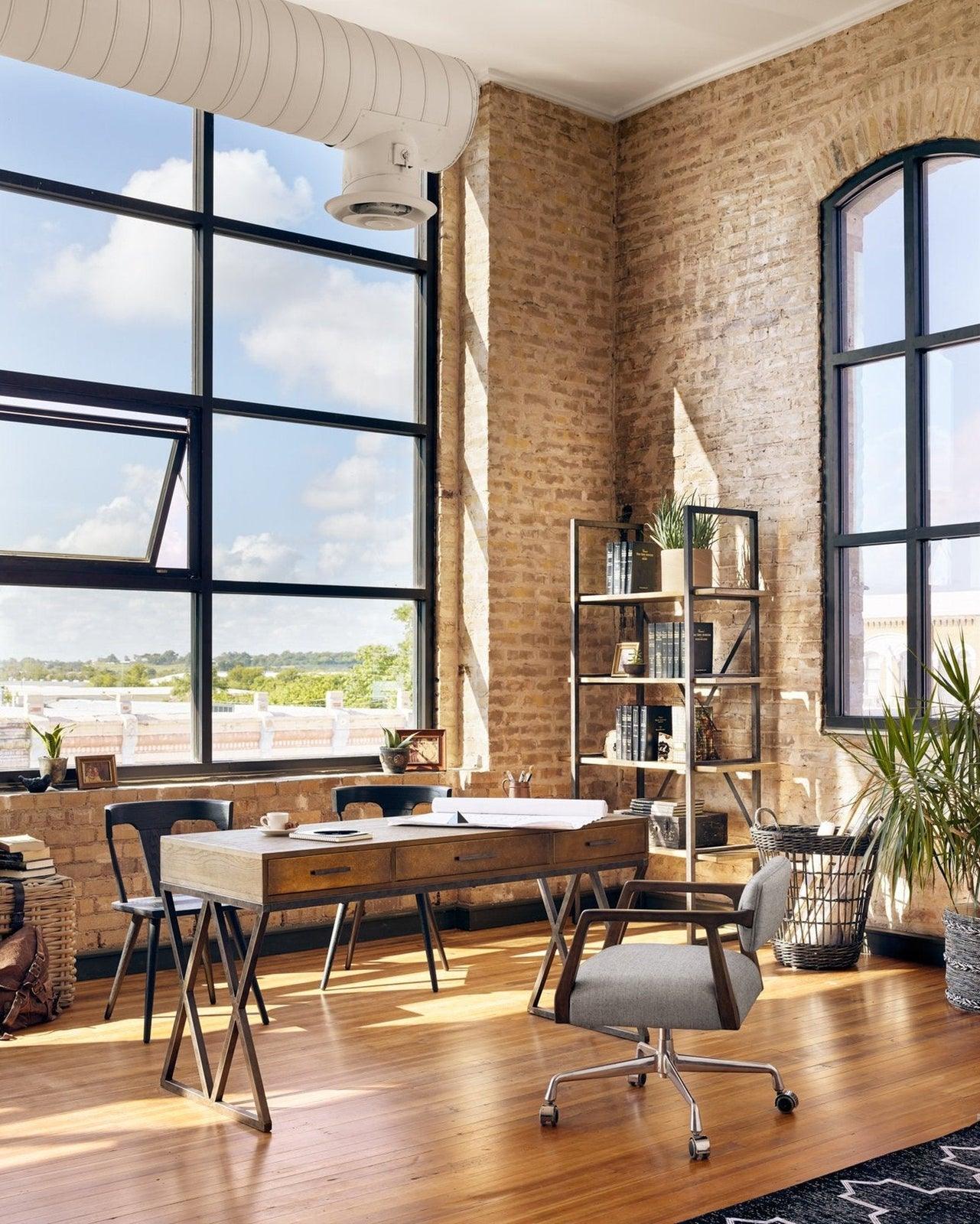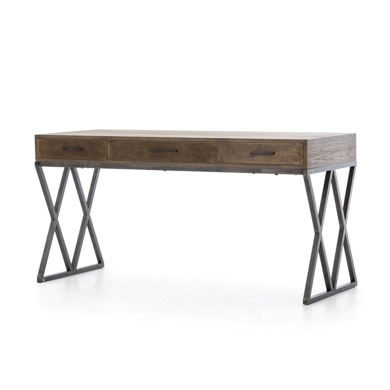 - El escritorio de roble grisáceo contrasta con los frentes de los cajones revestidos de latón con acabado de latón envejecido.