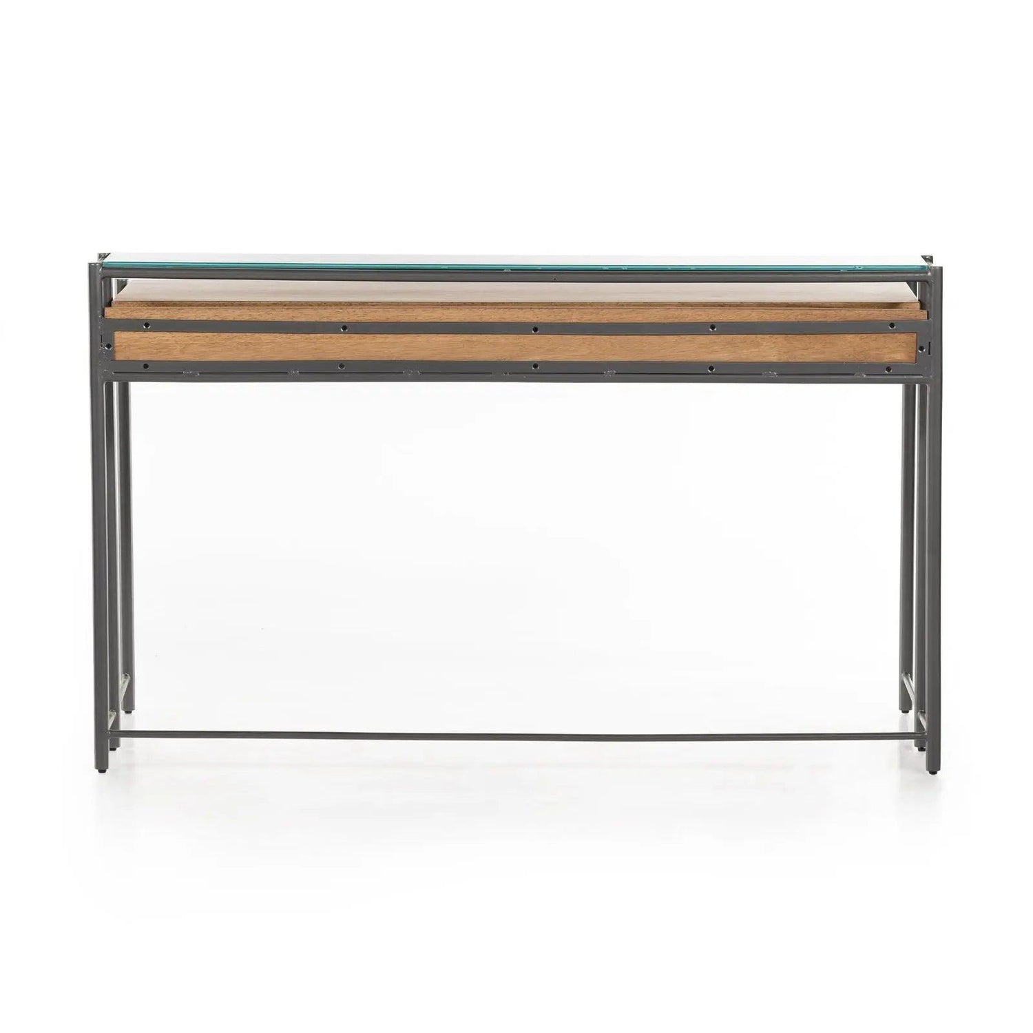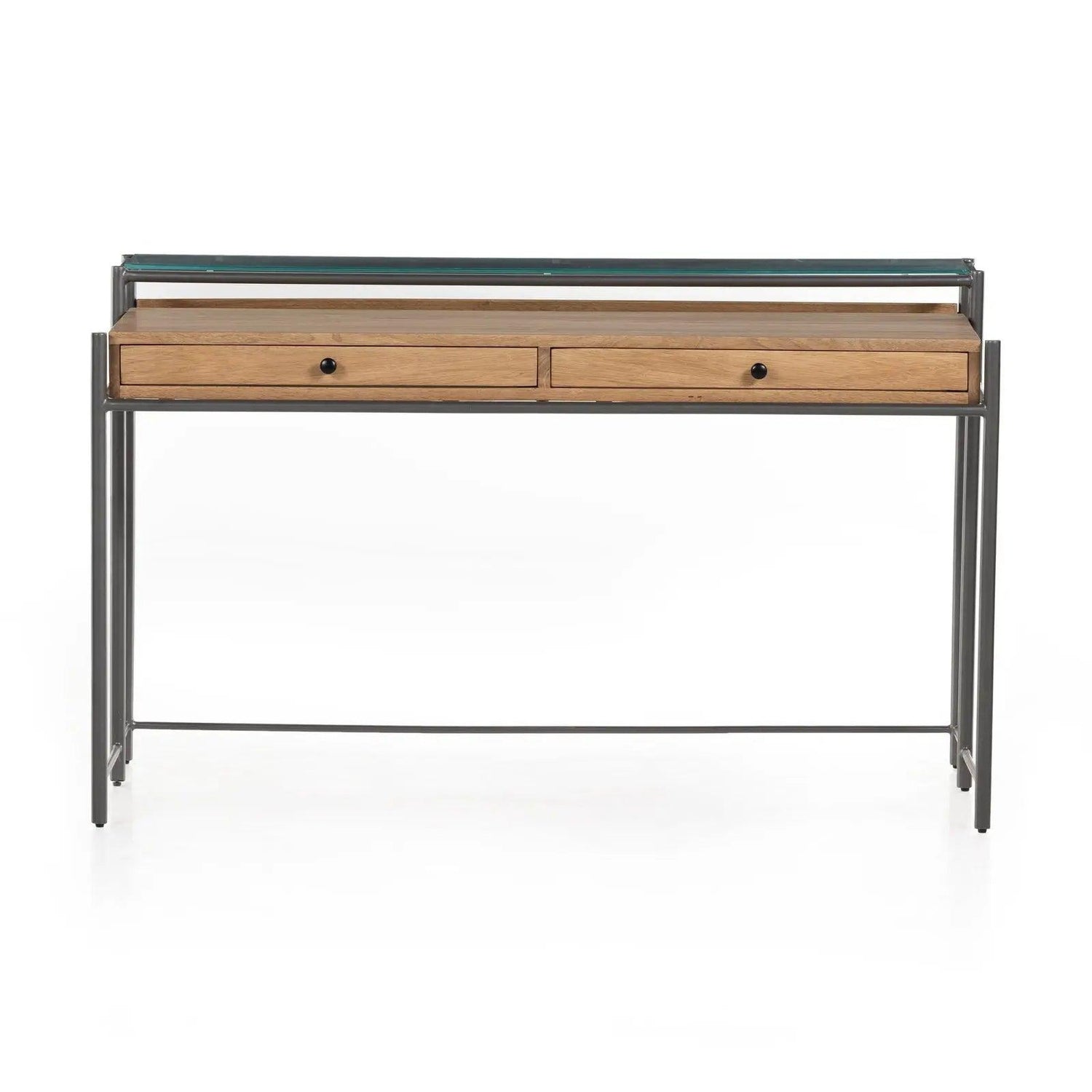 - Con un perfil elegante y delgado, el hierro con acabado metalizado forma un marco aireado y simplificado para un escritorio de madera de parawood macizo con acabado miel ahumado, con cajones dobles para un almacenamiento conveniente y estantes de vidrio templado para almacenamiento adicional y espacio de exhibición.