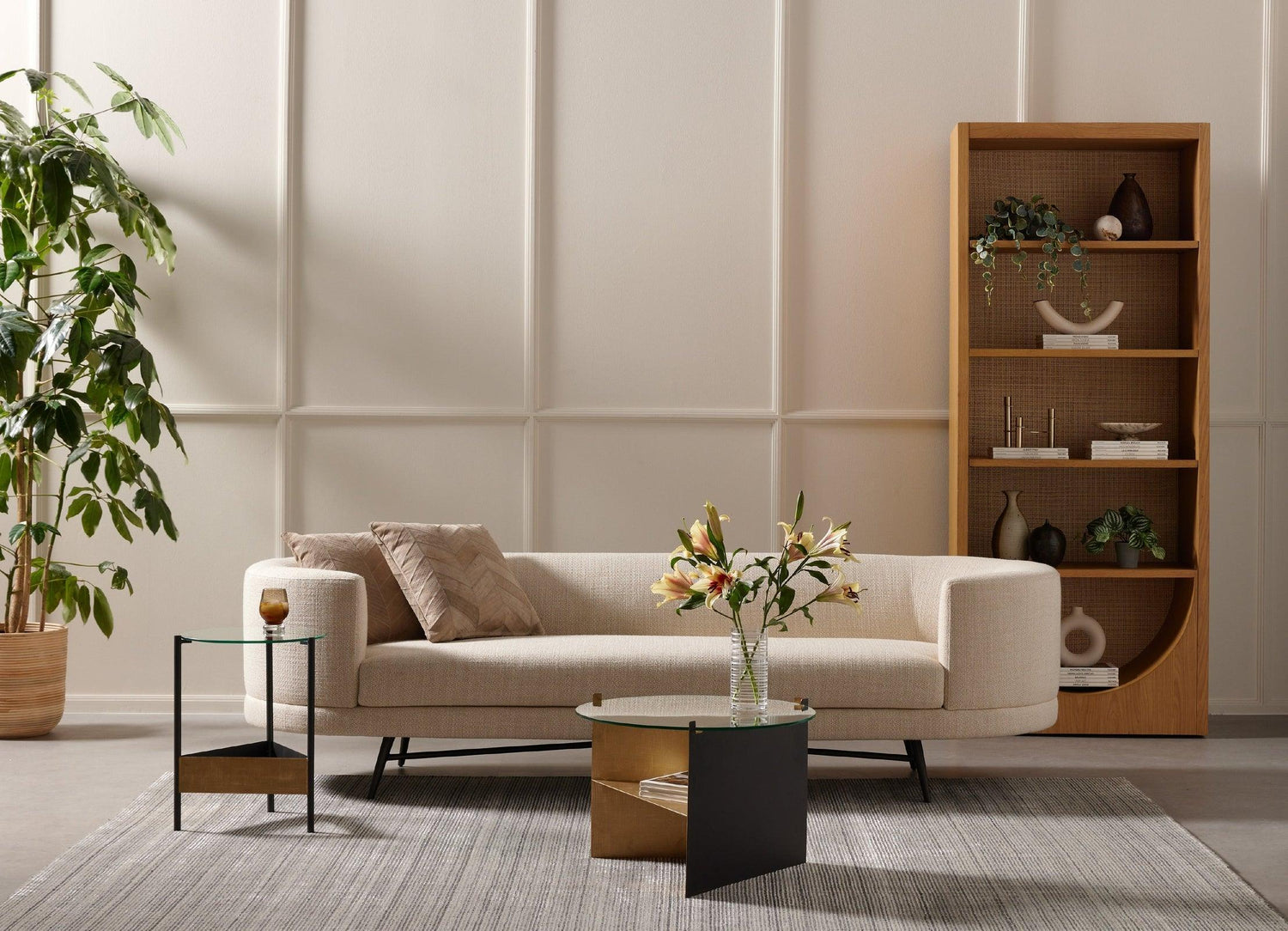 - El roble con acabado miel forma un marco alto y limpio para estanterías espaciosas, con un arco inferior y paneles de caña natural tejidos a mano que le dan un aire divertido y texturizado a esta pieza inspirada en los años setenta.