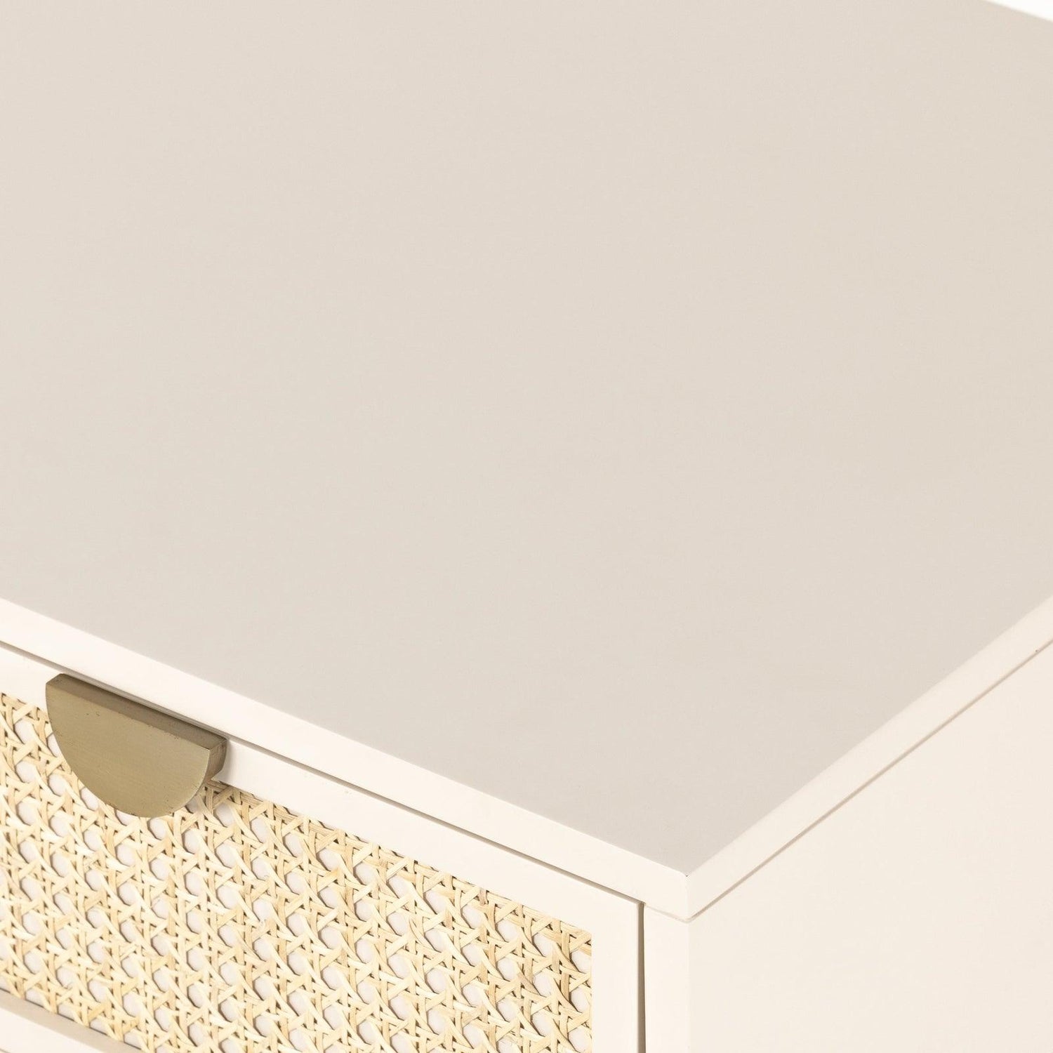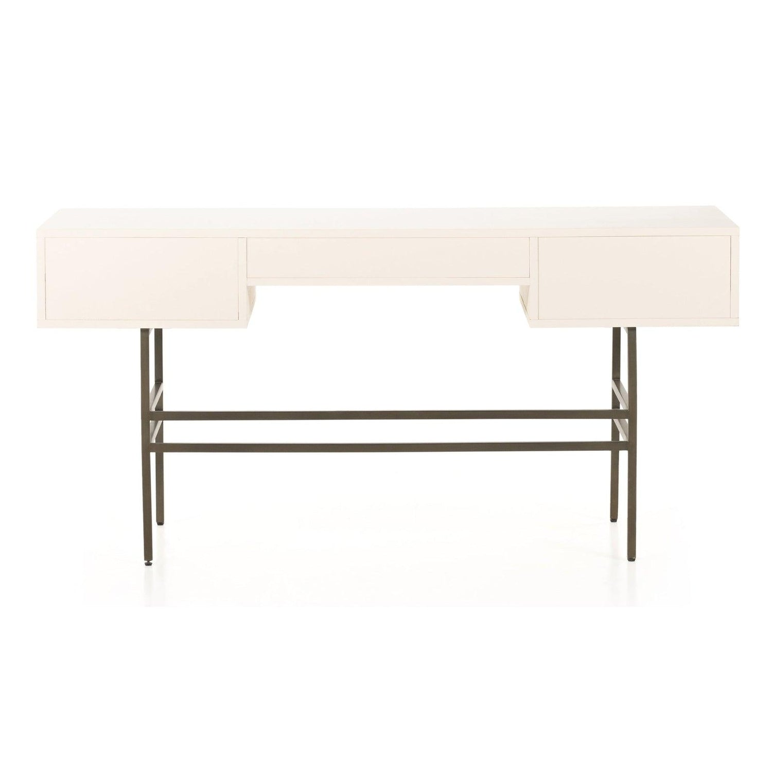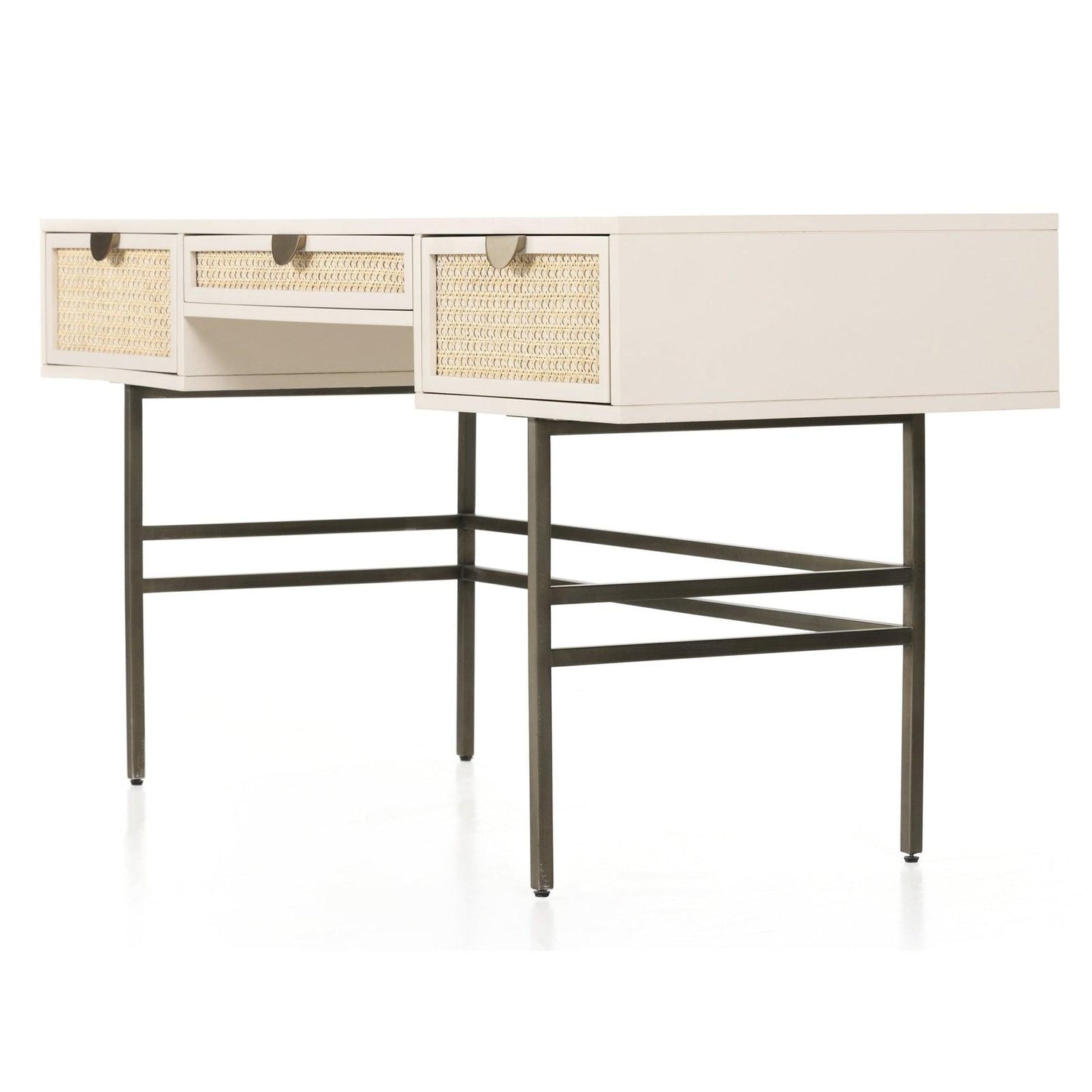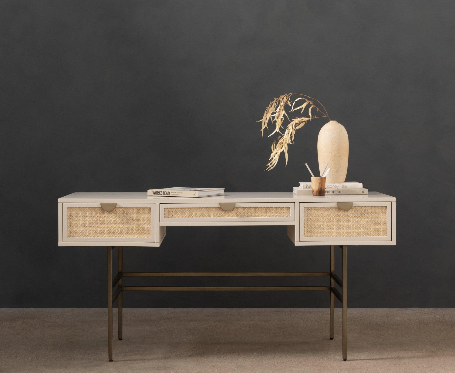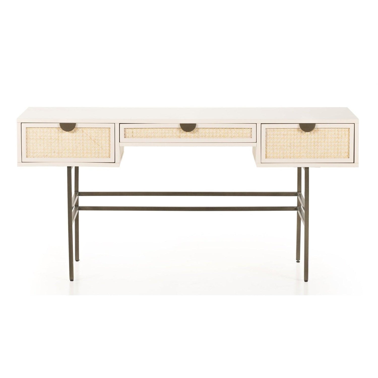 • Un escritorio lacado de tres cajones presenta paneles de caña tejida y herrajes en forma de media luna con acabado en latón envejecido.