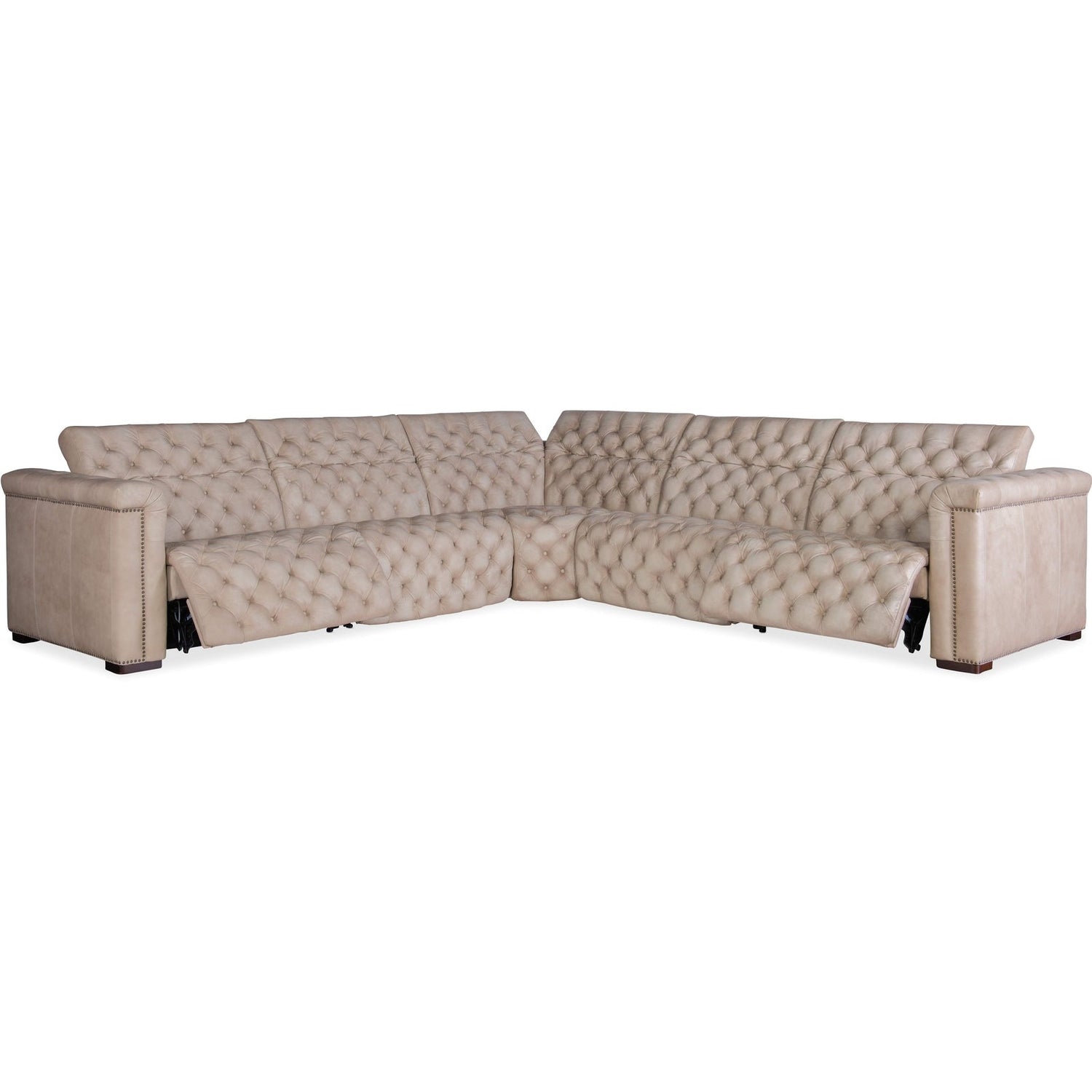 El seccional reclinable eléctrico Savion Grandier de 5 piezas de Hooker Furniture, en cuero Giovanni Taupe o Bellagio Gravel, combina la elegancia tradicional atemporal con la funcionalidad moderna. Con dos sillones reclinables eléctricos, reposacabezas eléctricos ajustables, capitoné capitoné y ribetes de tachuelas aplicados a mano, este seccional ofrece comodidad superior y un diseño sofisticado. Perfecto para salas de estar de alta gama, espacios de entretenimiento formales y salones de lujo.