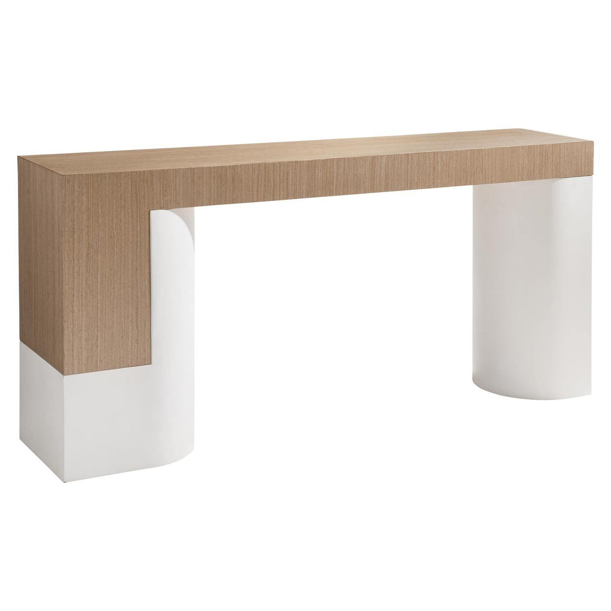 - Una interacción de blanco y madera, esta mesa consola equilibra forma y función.