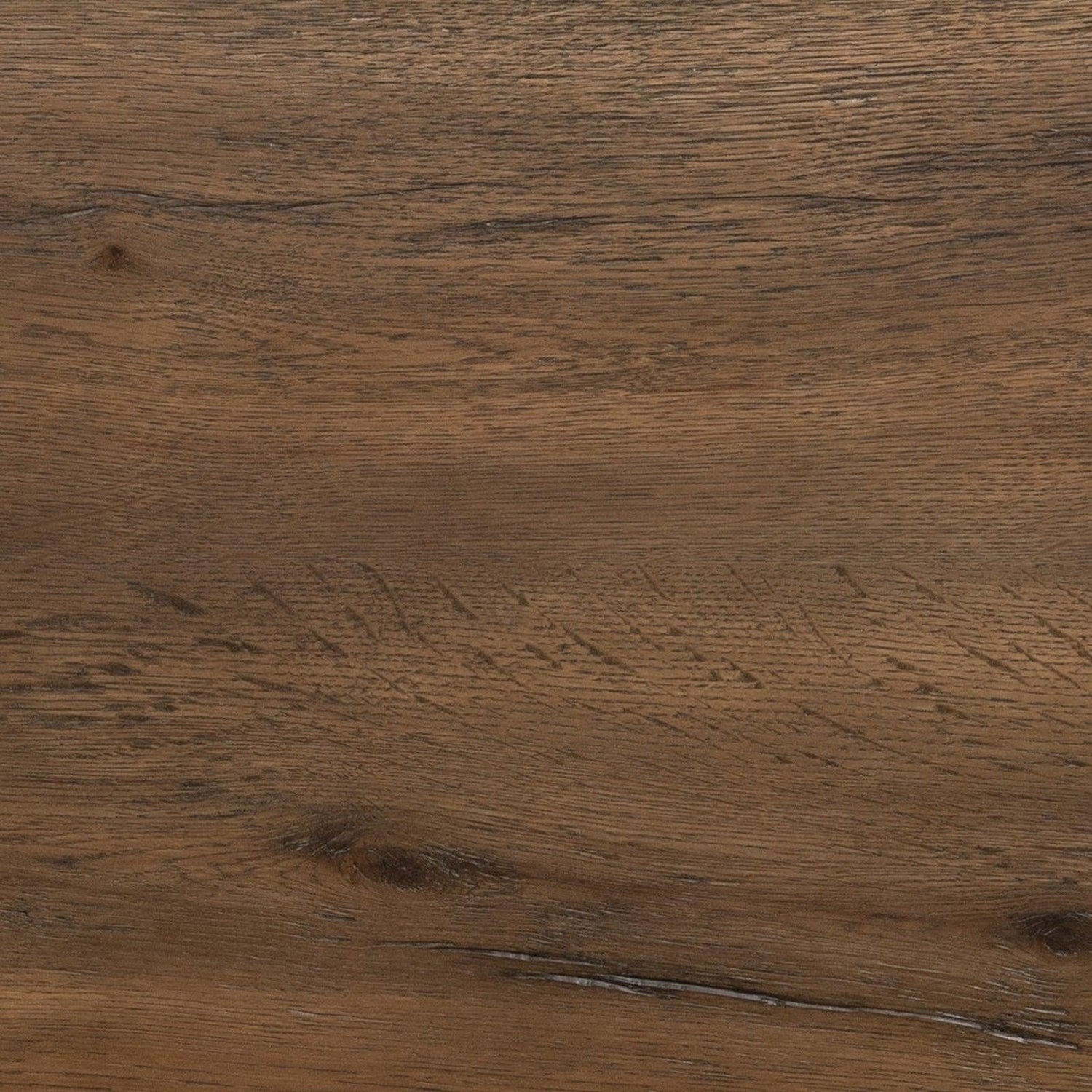 • Terminada en un marrón rústico intenso, una consola doble estilo altar de chapa de roble grueso presenta nudos y vetas visibles, con cajones dobles para un amplio espacio de almacenamiento de medios.