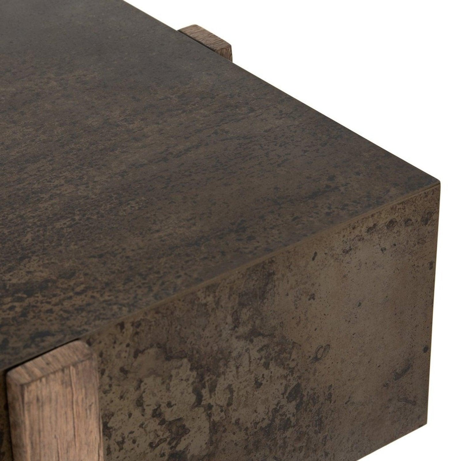 • Con proporciones gruesas y anchas, una mesa consola rectangular con tapa de hierro envejecido se cruza con una base de roble rústico y rico en carácter con hermosos altos y bajos.