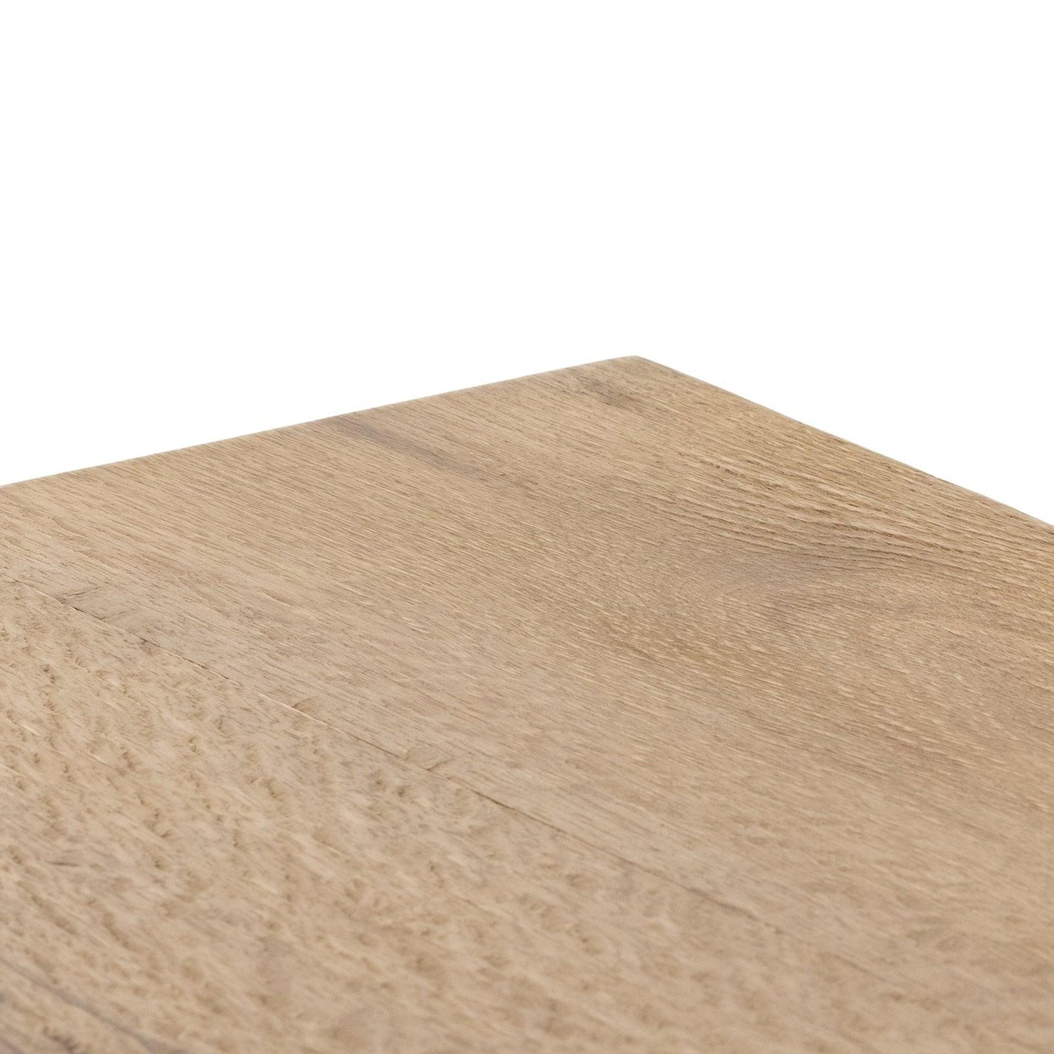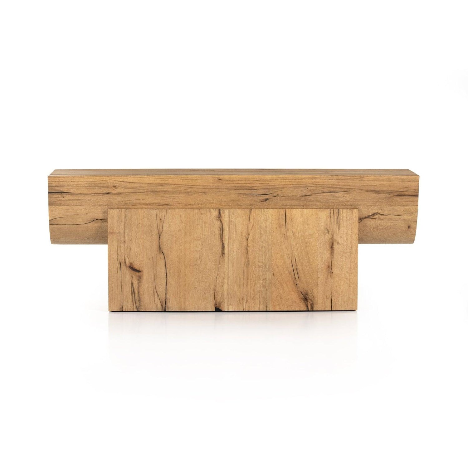 - Una base de pedestal estilo bloque sostiene una mesa con forma de viga, todo hecho de chapa de roble gruesa y de acabado claro con detalles de fresno cortado en forma de ostra.