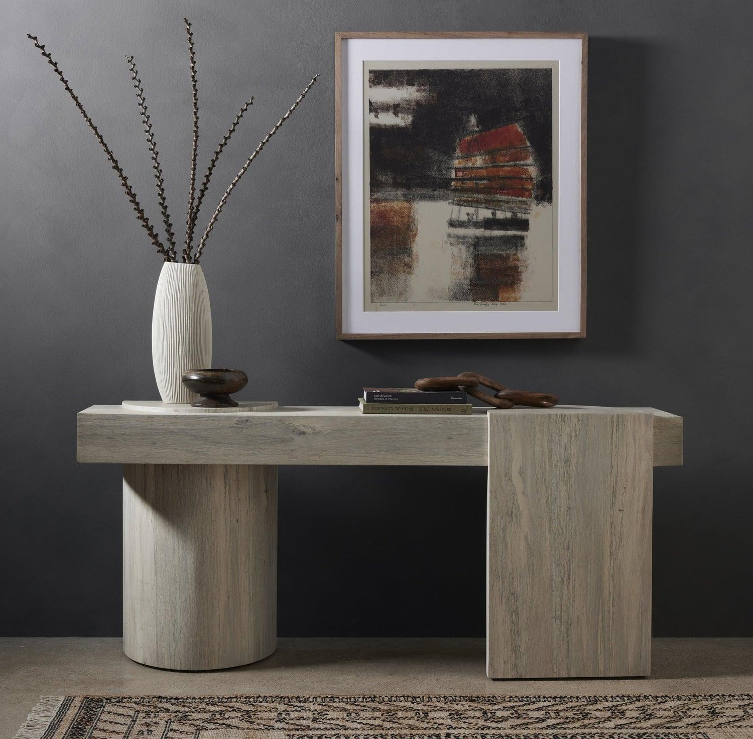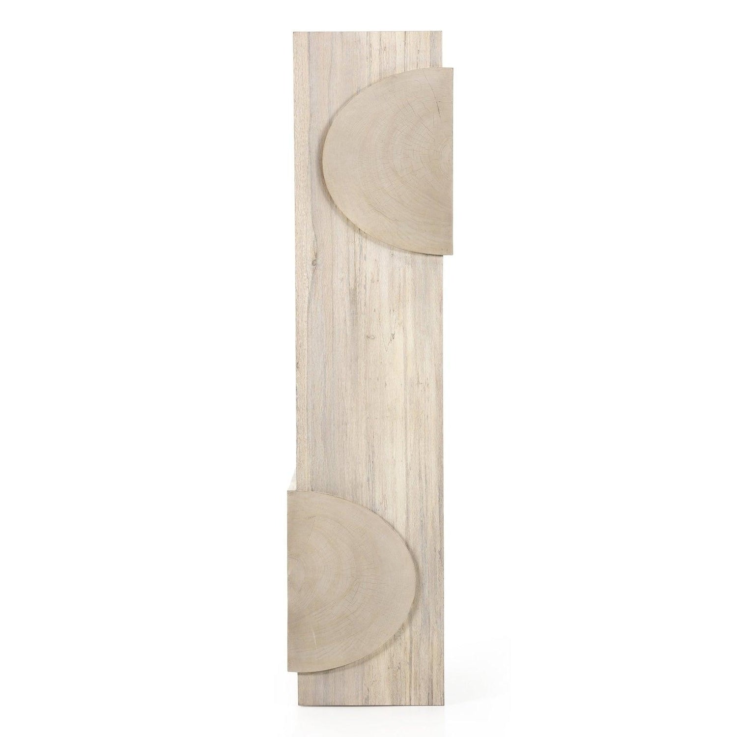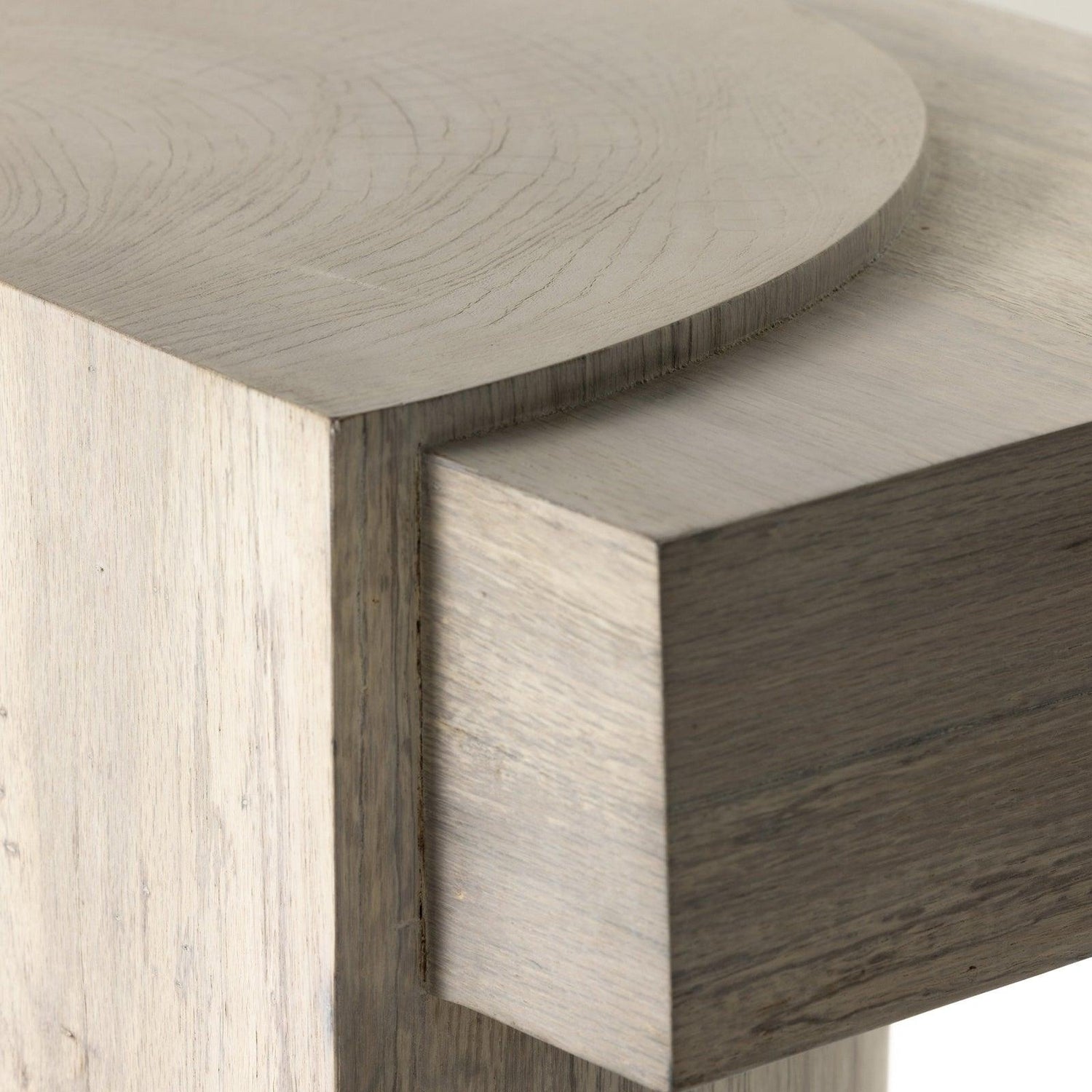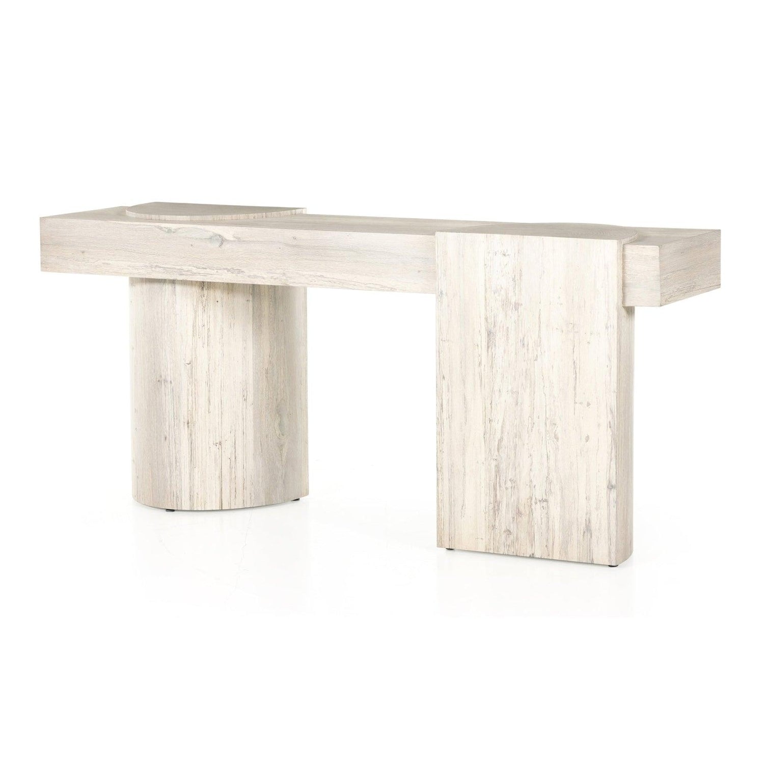 • Fabricada en chapa de roble blanqueado de corte grueso, su base asimétrica presenta patas estilo pilar y una parte superior estilo tablón.