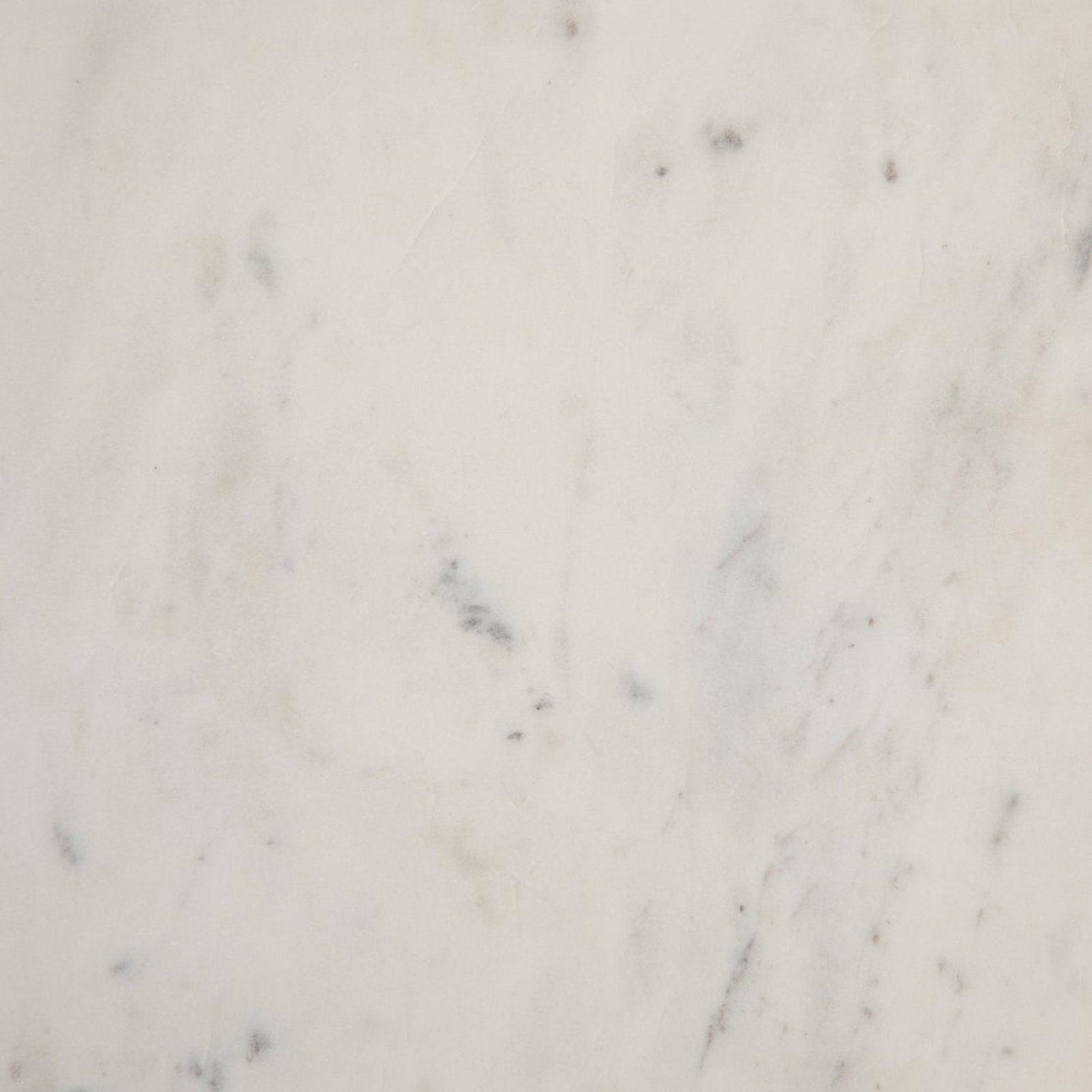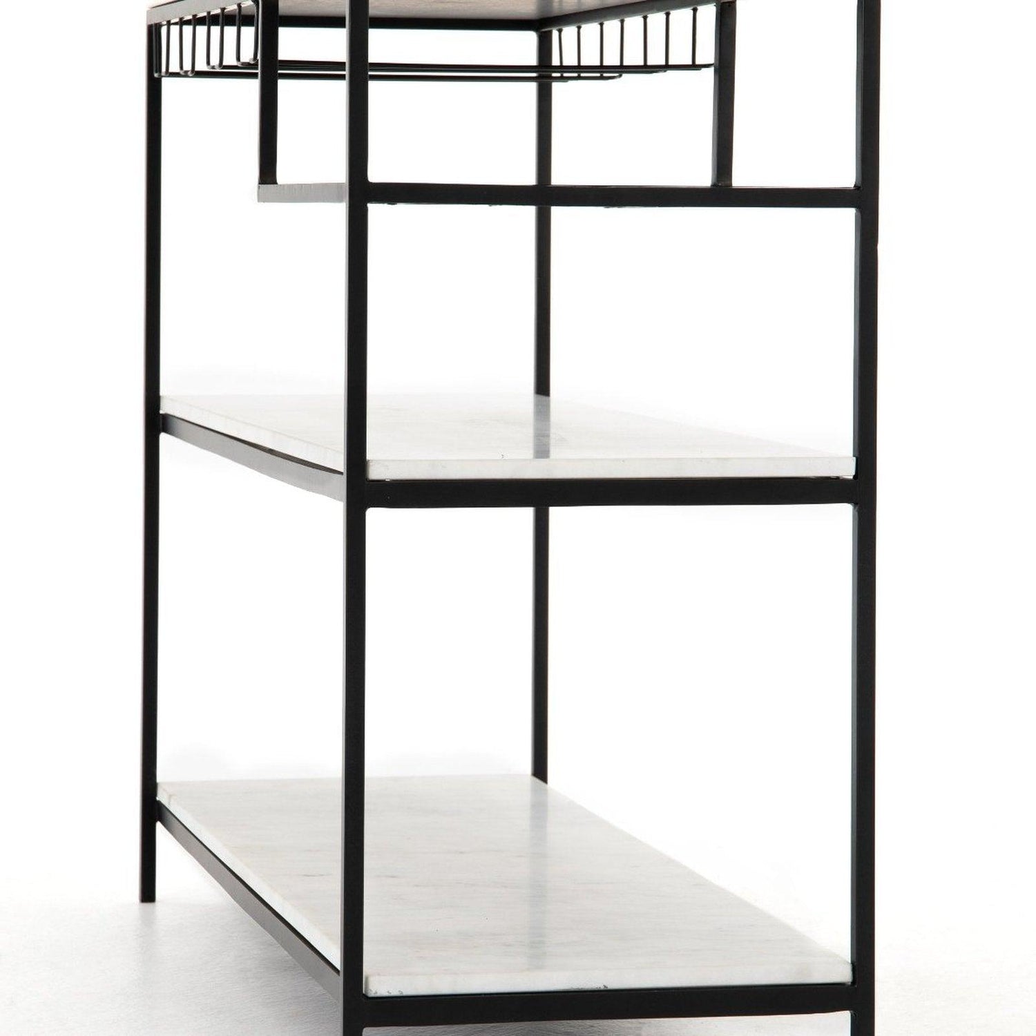 - Los niveles de mármol blanco pulido están enmarcados por hierro negro, con un estante de vidrio flotante y estantes colgantes para copas.