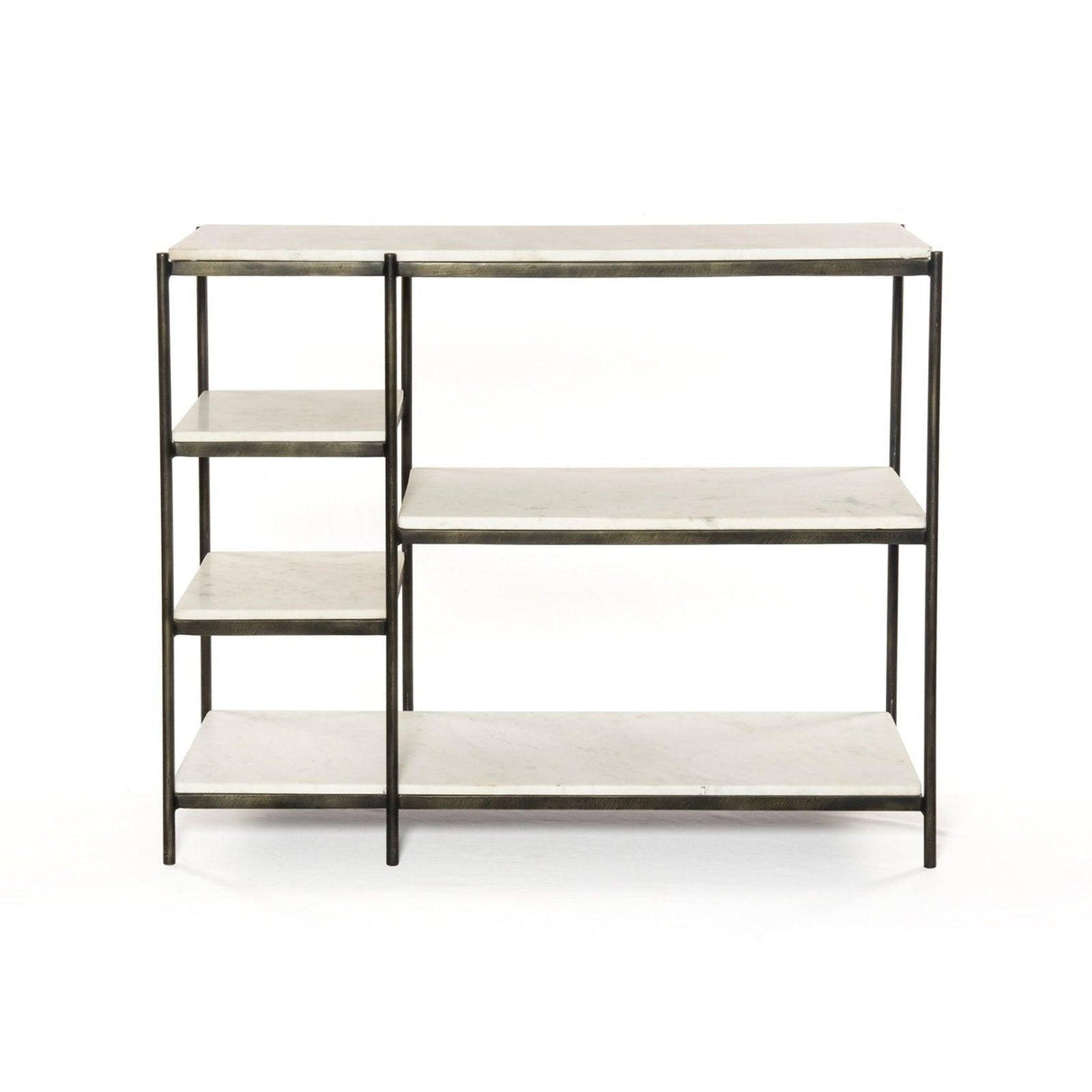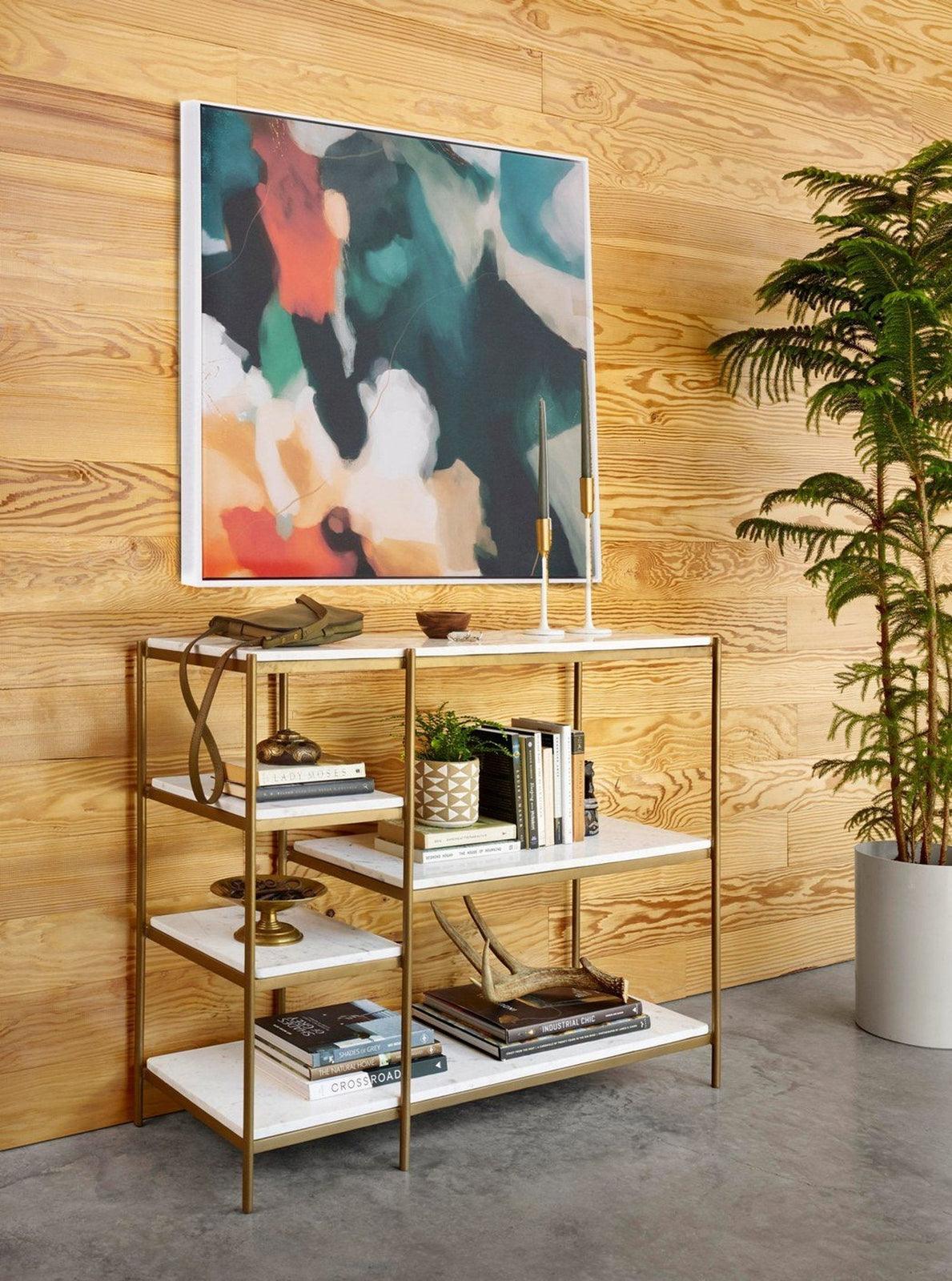- Amplias secciones de estanterías ligeramente inclinadas para combinar una gracia sencilla con líneas modernas.
