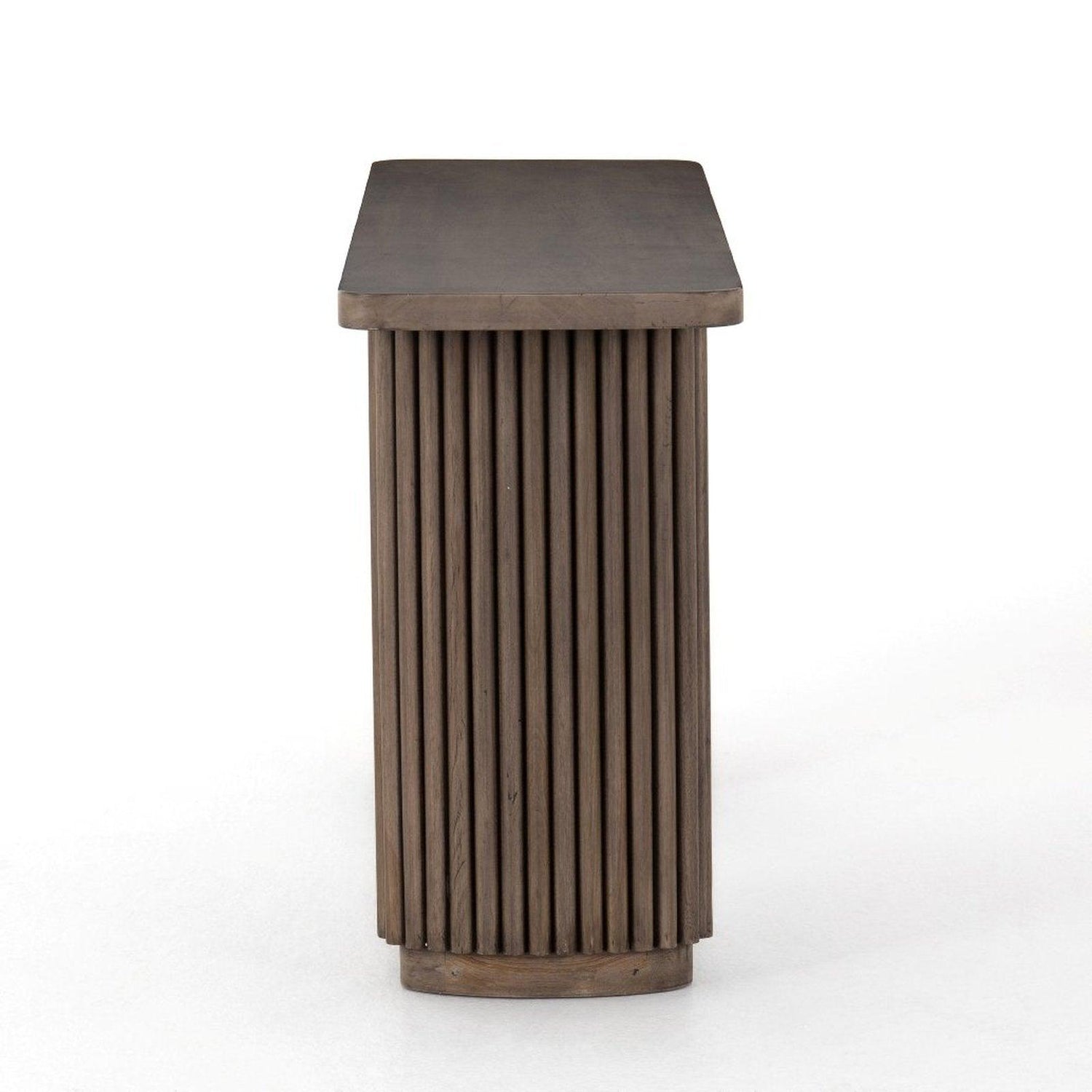 - Inspirada en la decoración de los majestuosos palacios de Jaipur, esta consola que genera conversaciones está hecha de maderas recuperadas mixtas, con una tapa rectangular redondeada y patas de pedestal con estrías verticales sobre una base de pedestal elegante.