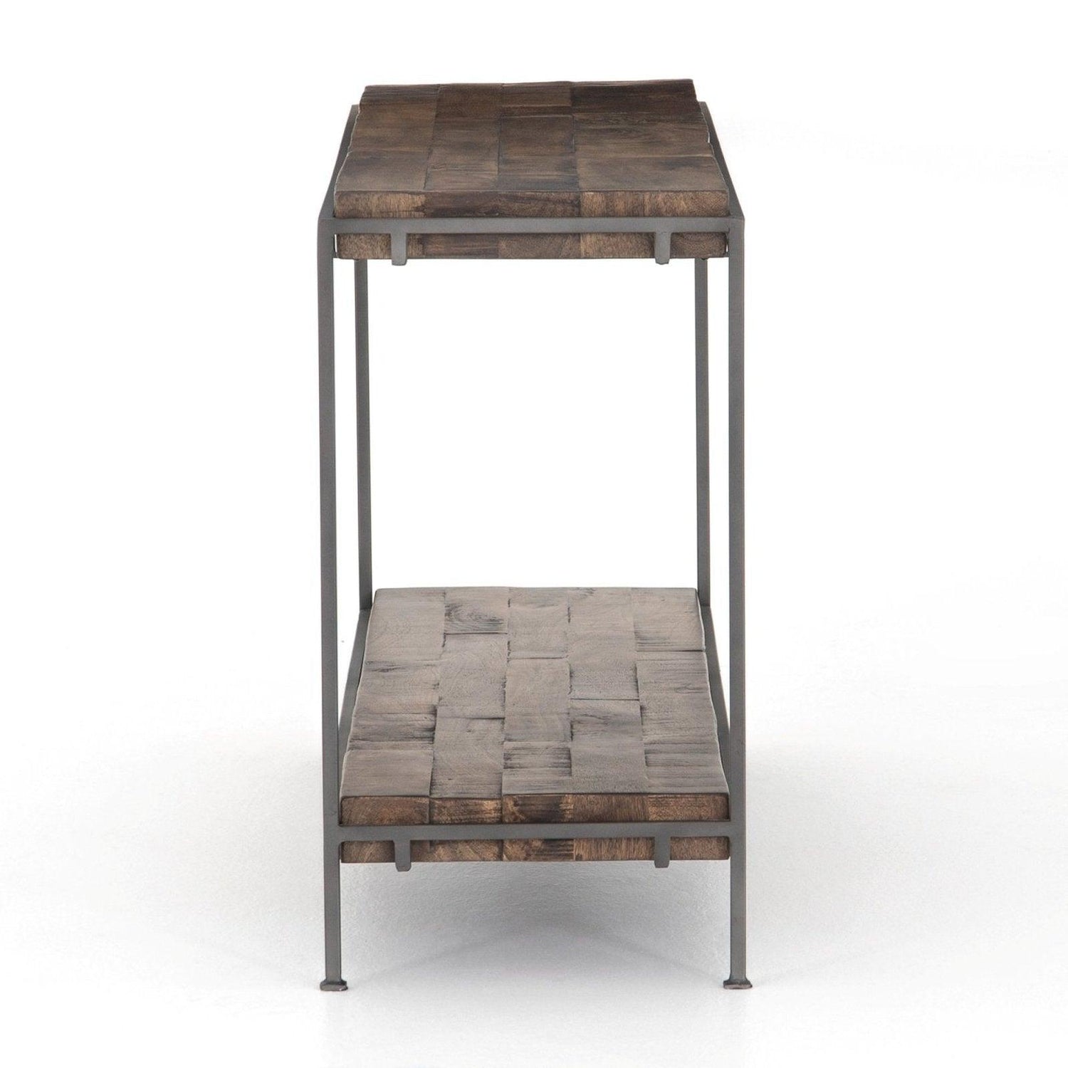 - Los tonos nogal desgastados aportan calidez al almacenamiento de la consola al aire libre.
