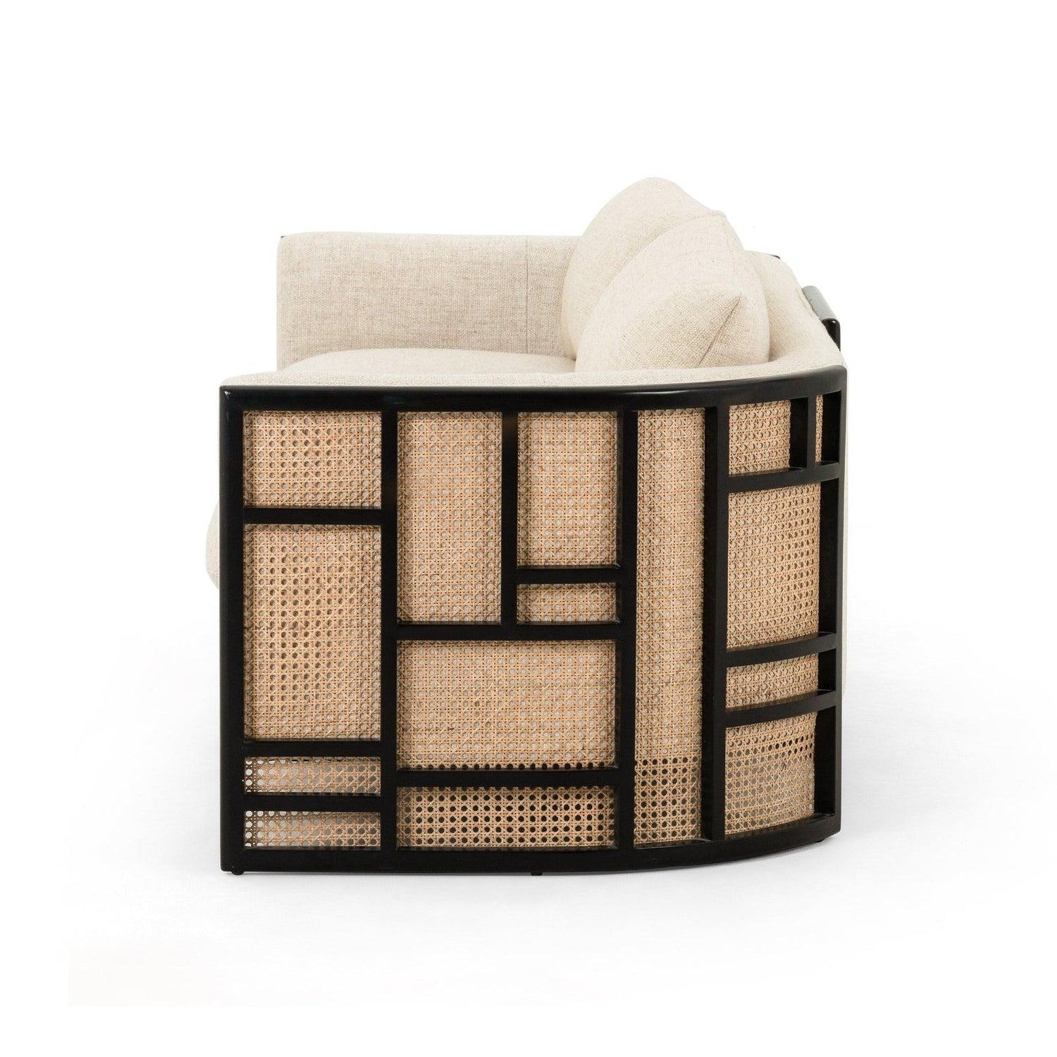 - A ese limpio contraste de colores se suma un asiento de alto rendimiento en mezcla de lino color crema exclusivo de Four Hands, con almohadas de doble filo para mayor comodidad.