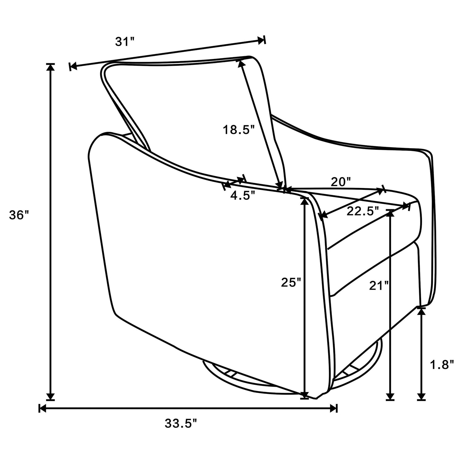 Silla giratoria deslizante: 31.00" de ancho x 33.50" de profundidad x 36.00" de alto