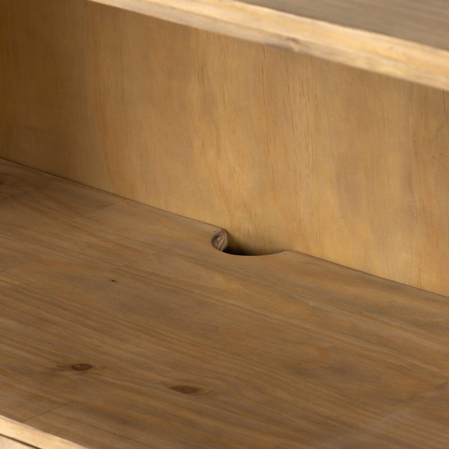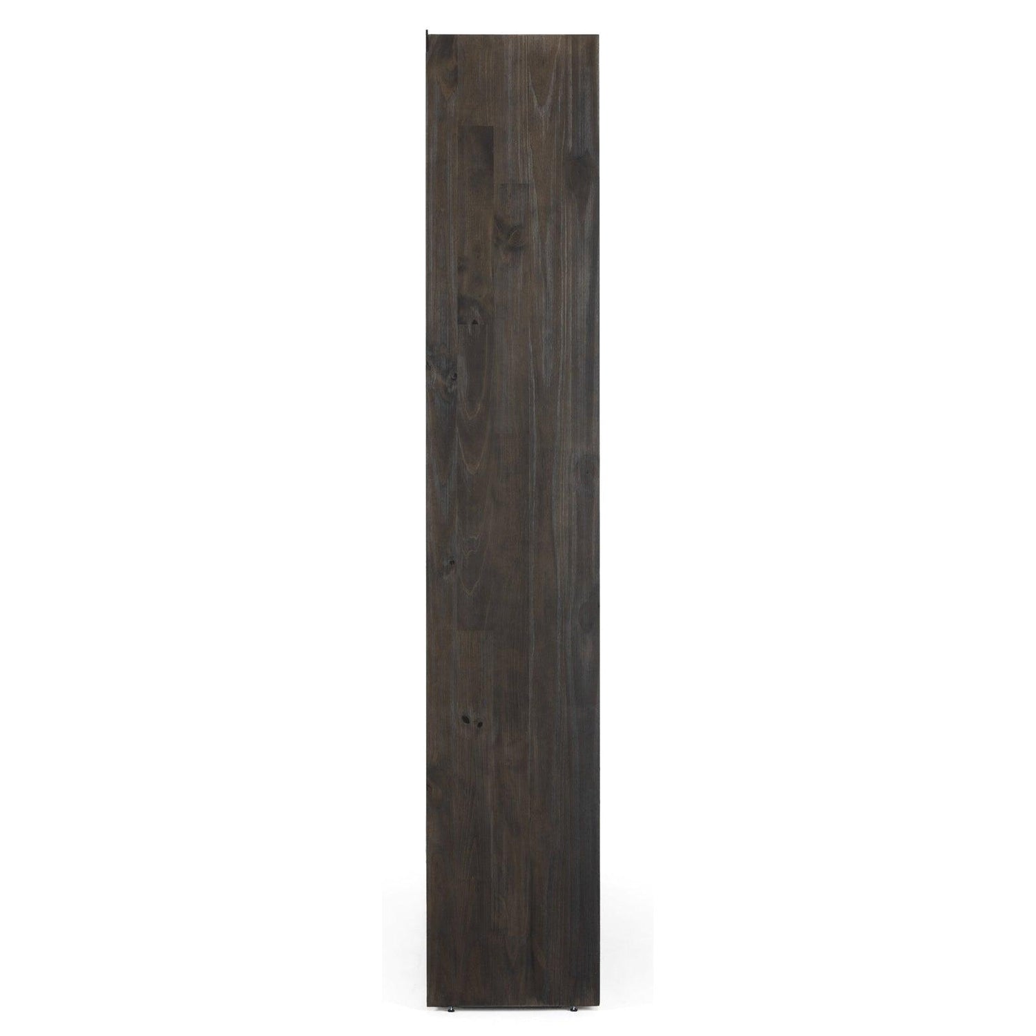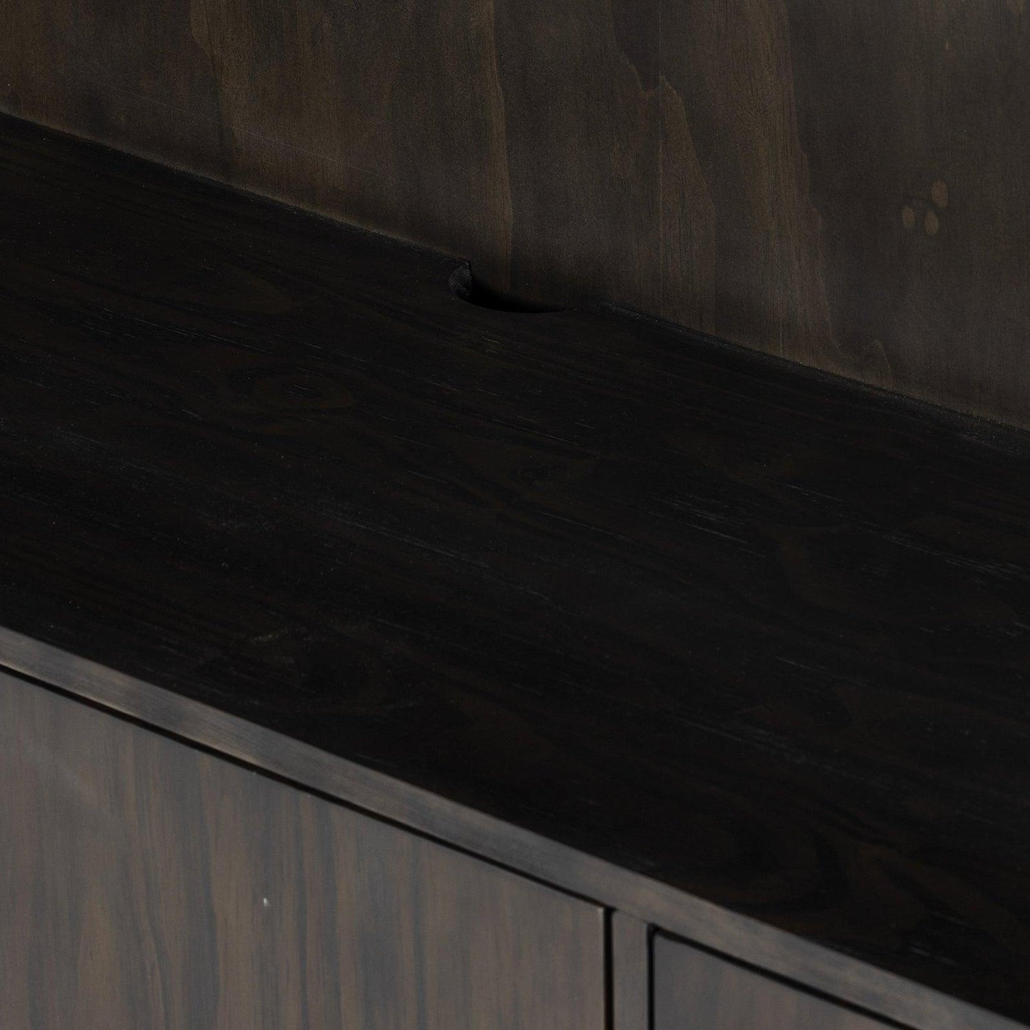 - Fabricada en pino macizo/madera maciza ahumada con acabado en carbón oscuro, esta consola de gran tamaño cuenta con un amplio espacio de almacenamiento abierto e interior para necesidades de exhibición y medios por igual.