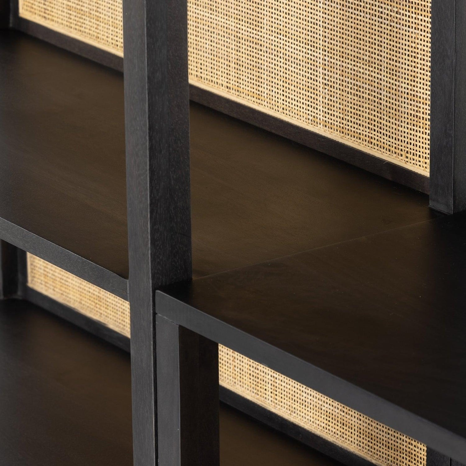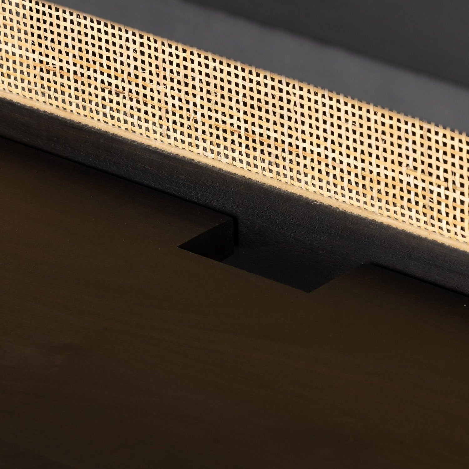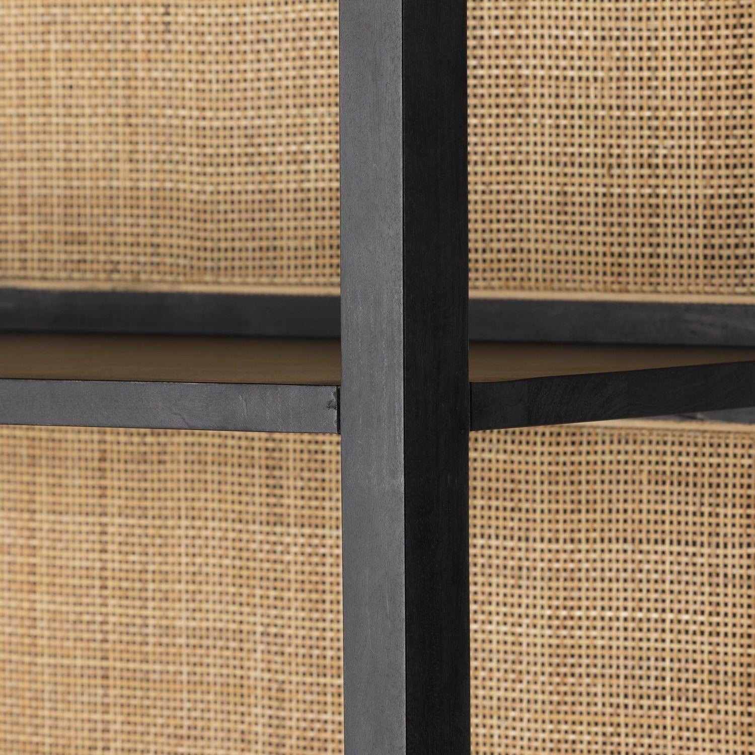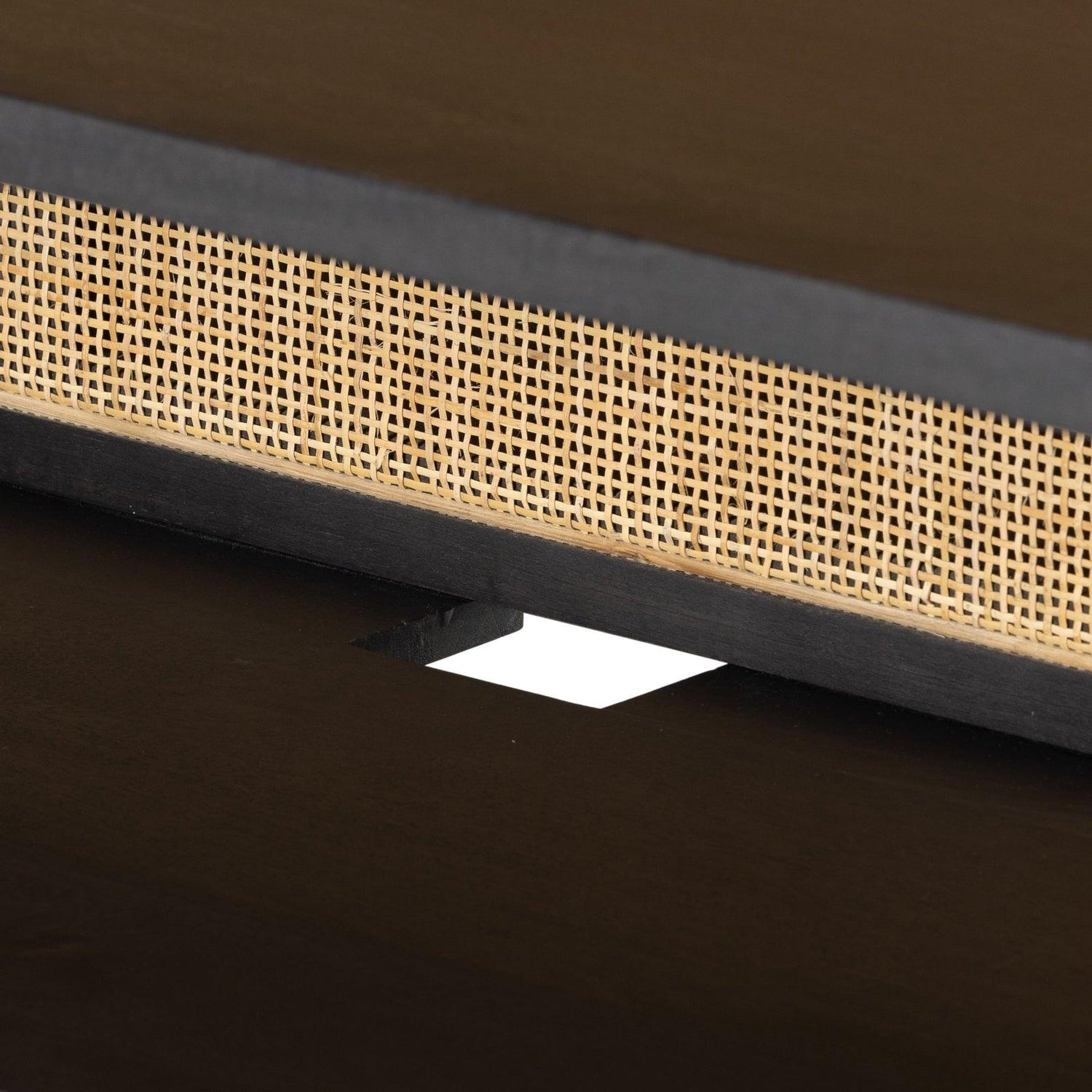• El mango sólido lavado en negro o lavado claro forma un marco aireado y lineal para paneles de caña tejida, creando un contraste de color llamativo con una textura rica.