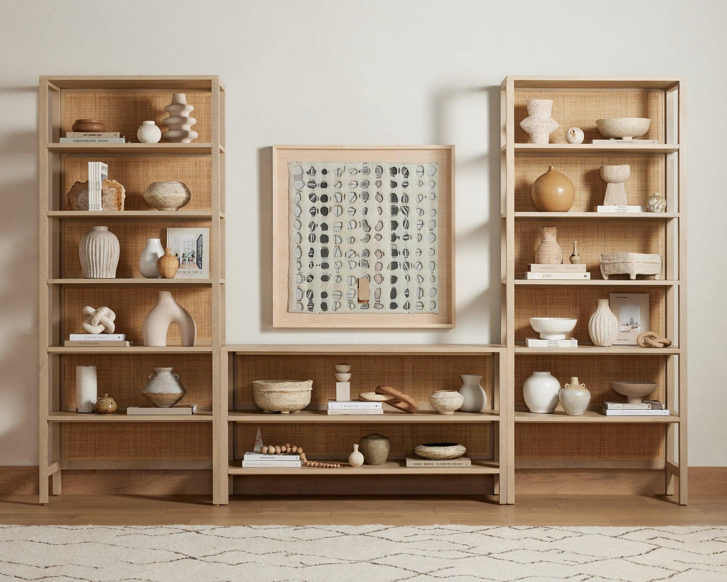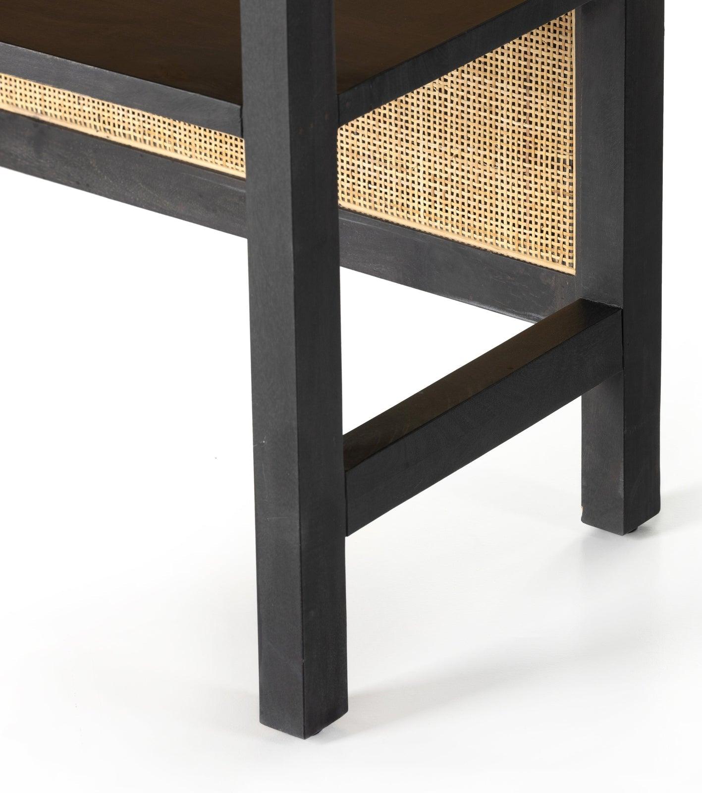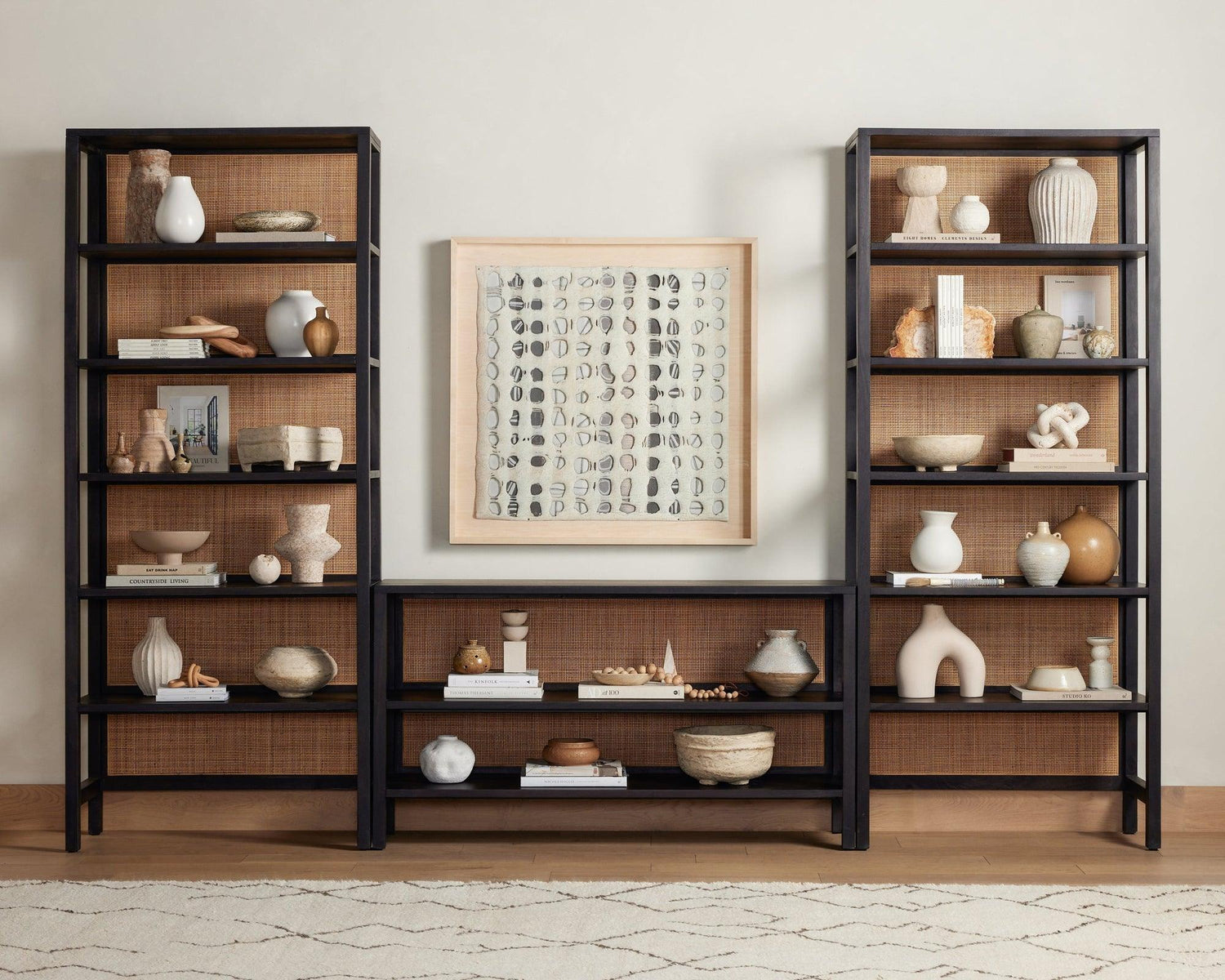 • El mango sólido lavado en negro o lavado claro forma un marco aireado y lineal para paneles de caña tejida, creando un contraste de color llamativo con una textura rica.