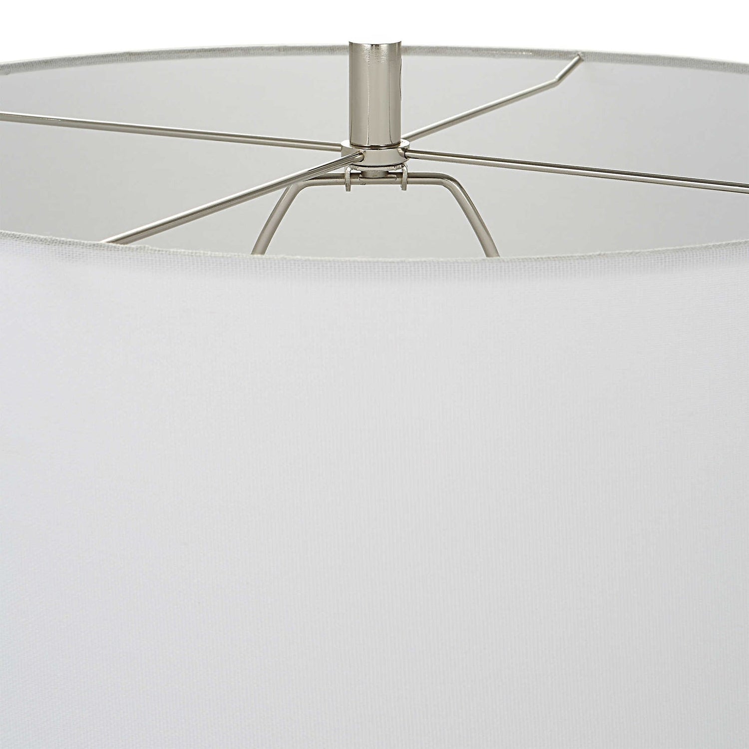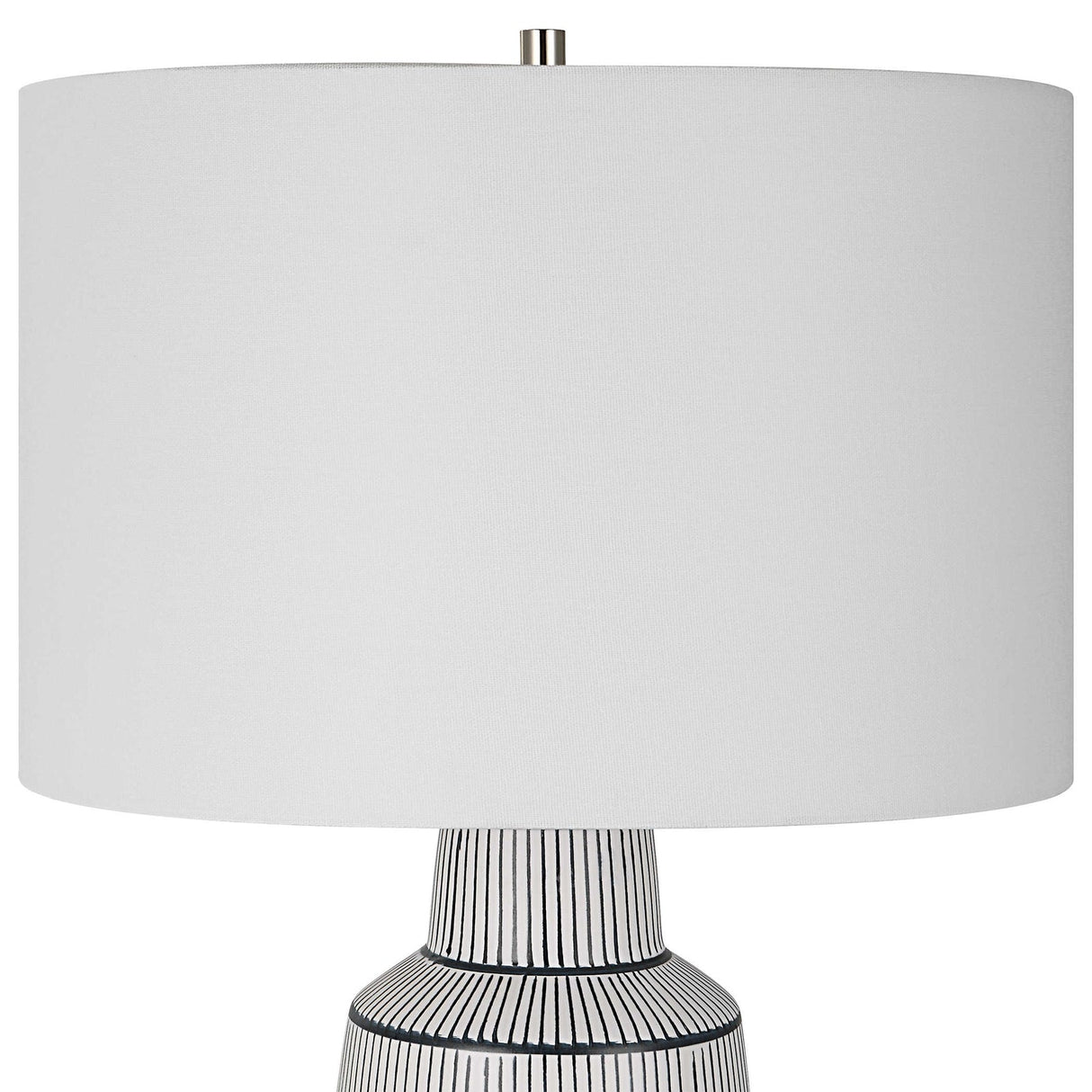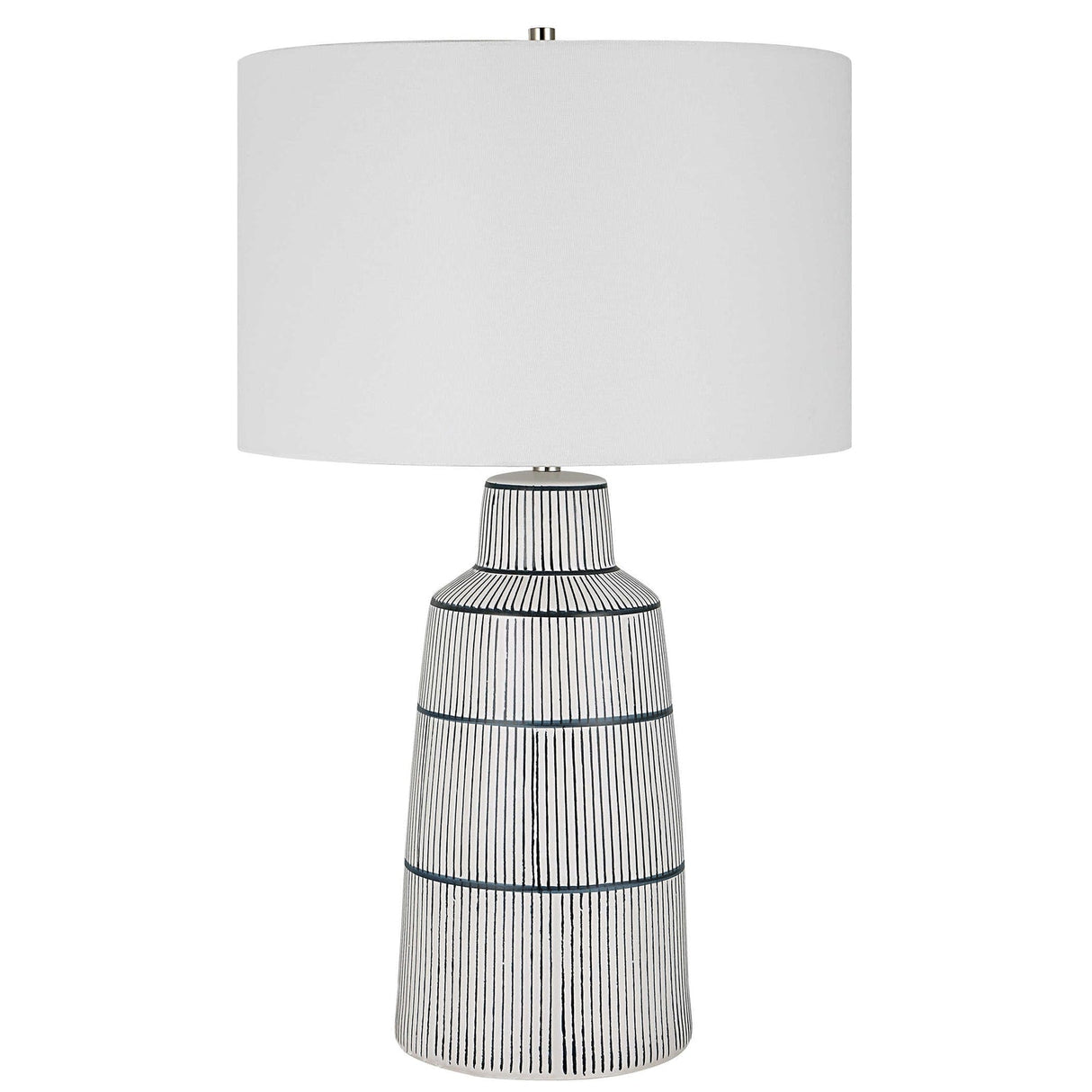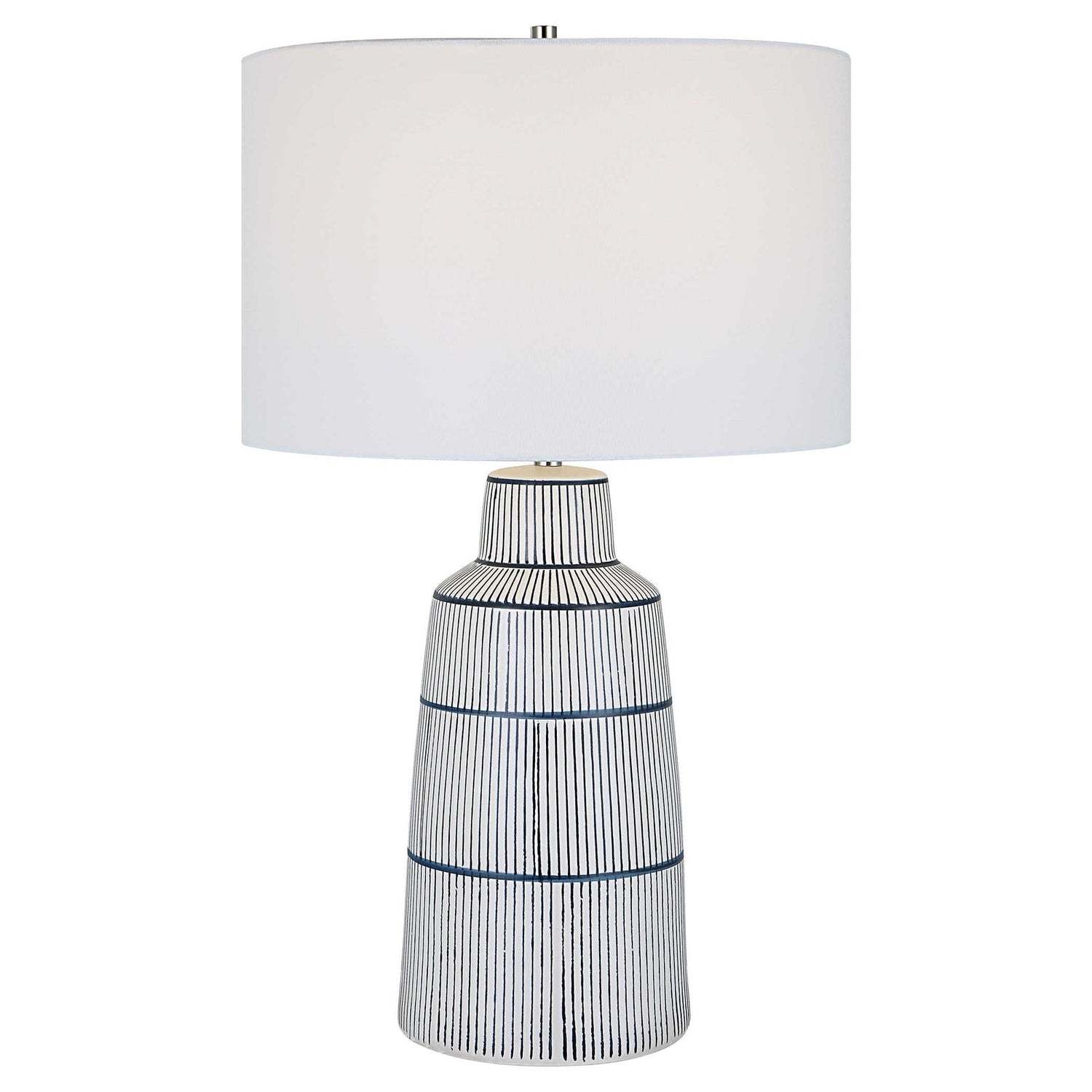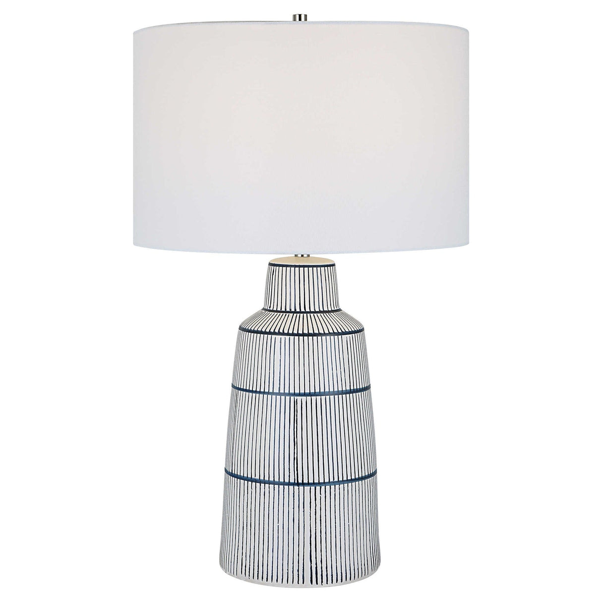 • Inspirada en el clásico tejido de rayas náuticas, esta lámpara de mesa de cerámica luce un esmalte blanco satinado con ricas rayas azul marino y detalles niquelados pulidos.