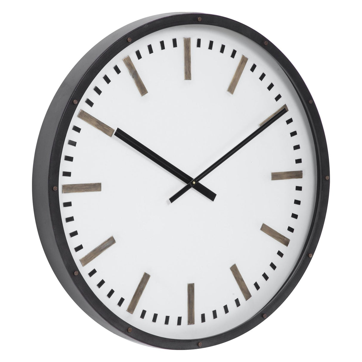 - Reloj de pared con marco de bronce oscuro con detalles de cabezas de clavos y una esfera blanca con detalles de latón antiguo y negro.