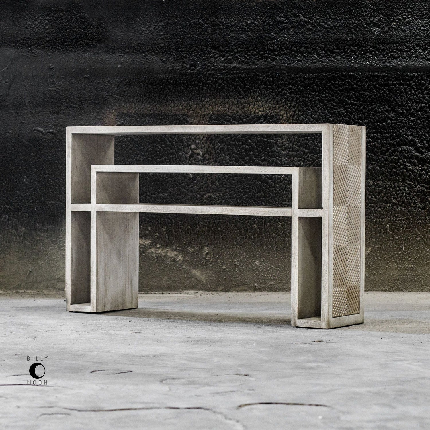 - Acabado en blanco hueso envejecido sobre chapa de caoba con una exhibición de varios niveles, presenta una tapa geométrica tallada a mano en madera maciza de caoba en un cálido lavado de avena.