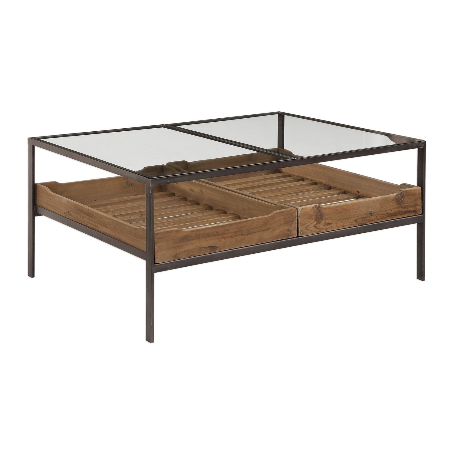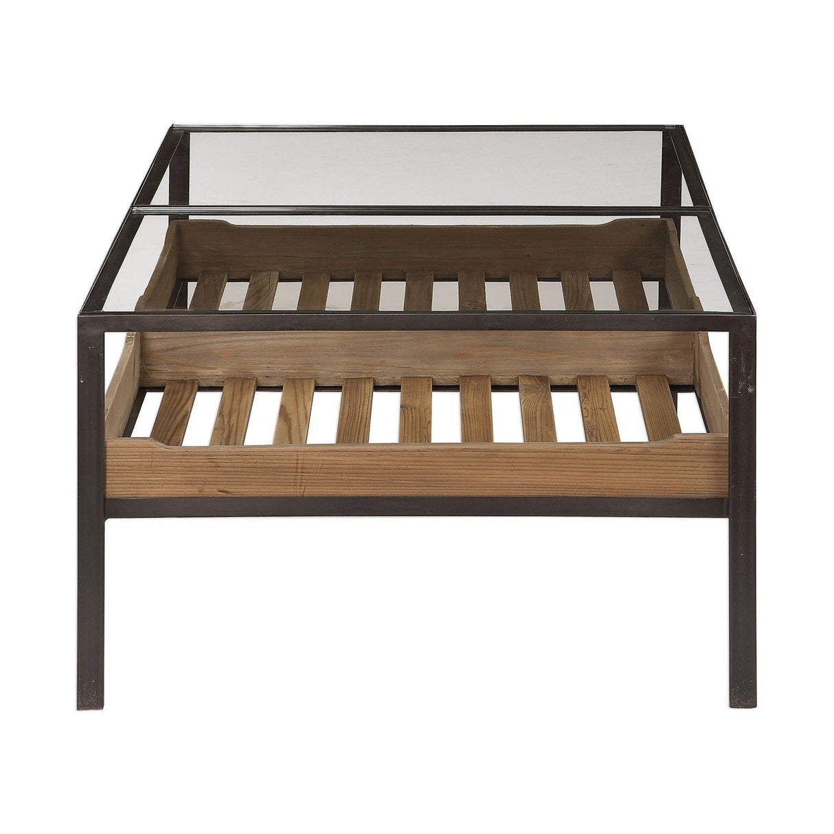 - El marco de hierro tiene un acabado de acero envejecido con dos tapas de vidrio templado empotradas.