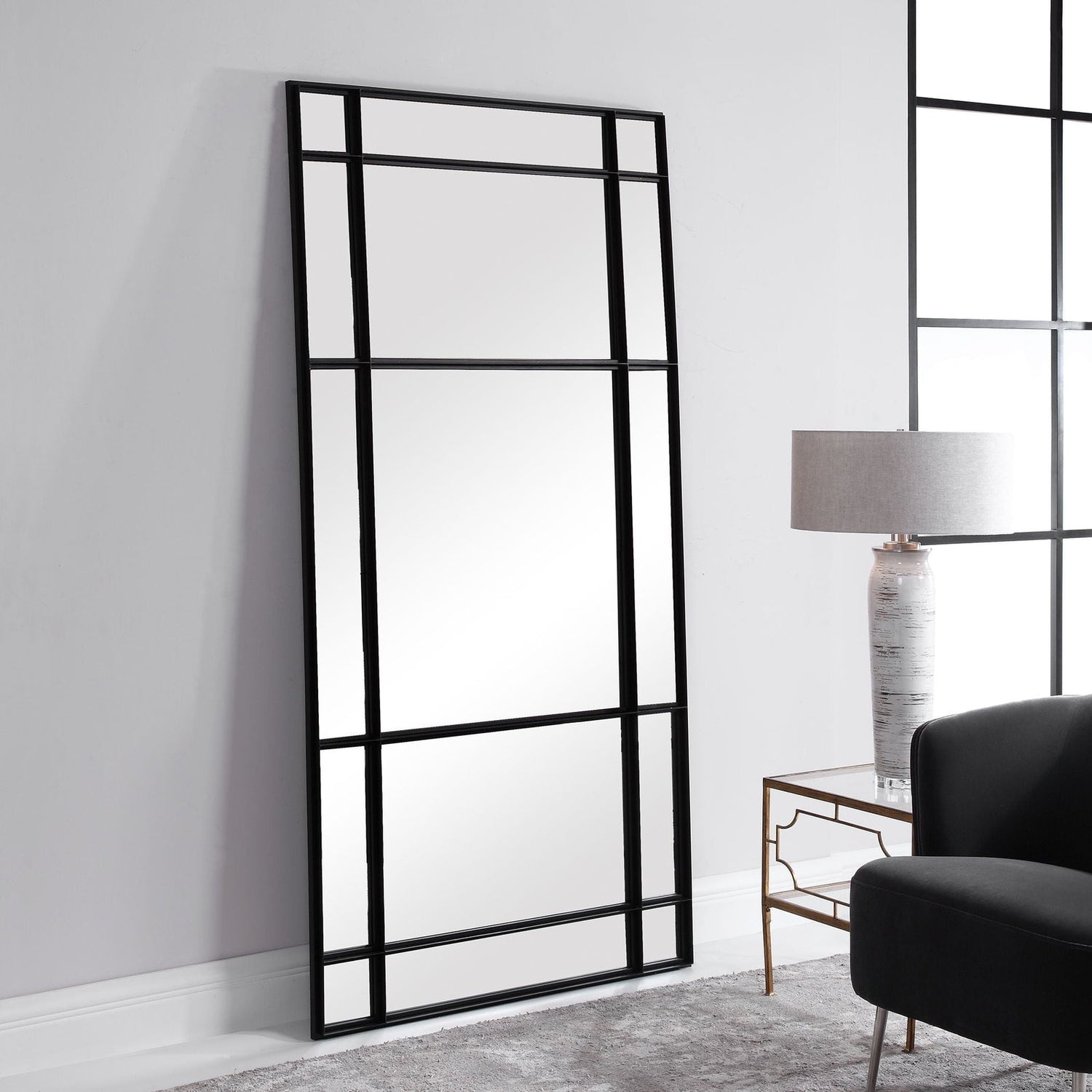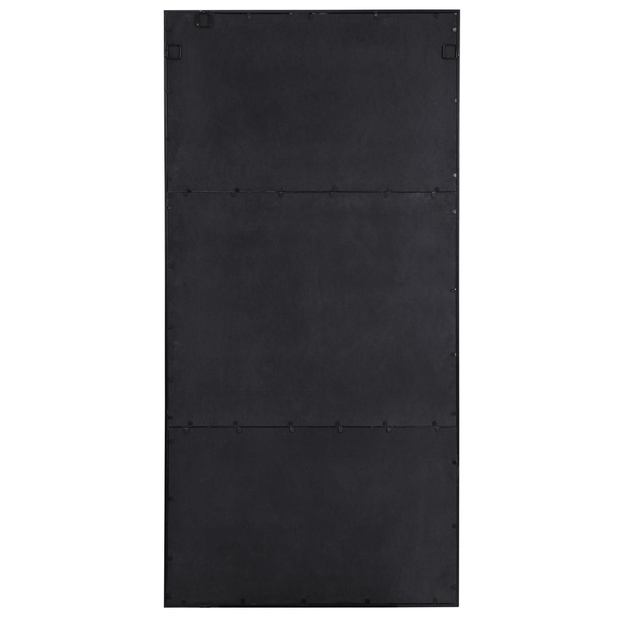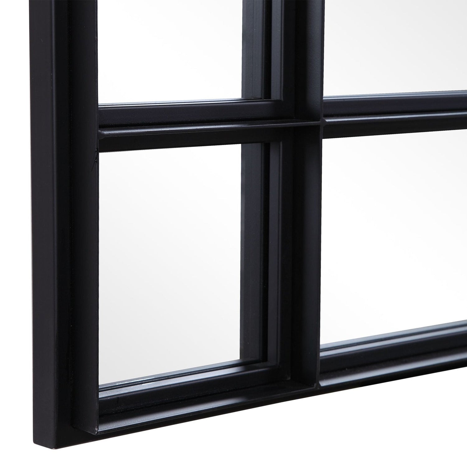 - Este espejo de gran tamaño presenta un marco de hierro pesado con canales profundos inspirados en las ventanas de los antiguos almacenes y acabado en negro satinado.