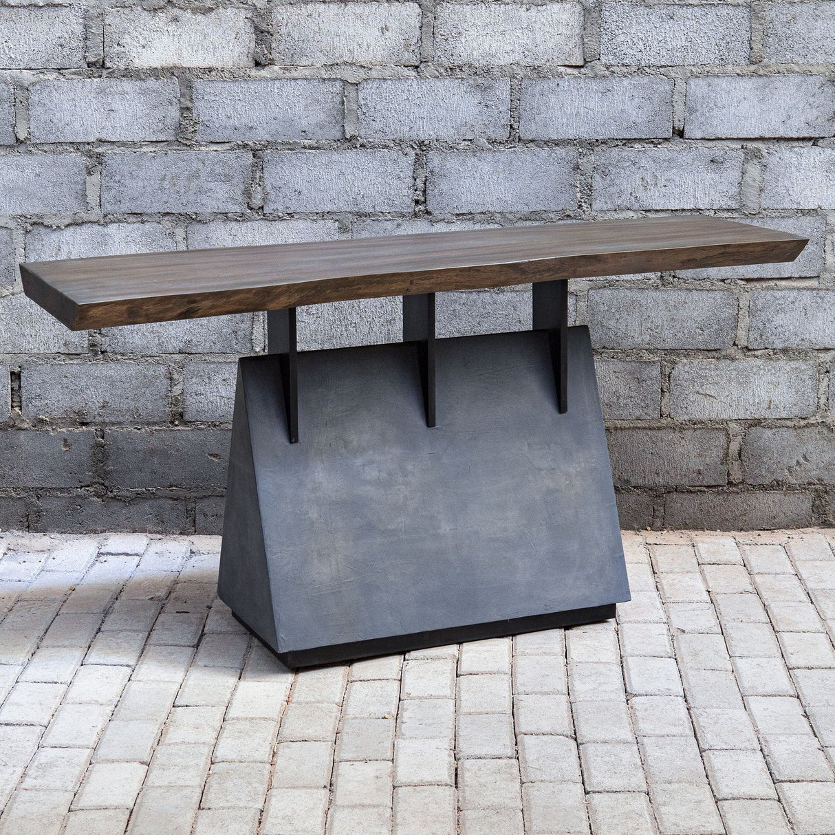 Inspirada en los estilos rústico e industrial, esta consola presenta una losa de madera de caoba con acabado natural y detalles en los bordes. Está acentuada con soportes de acero con acabado gunmetal y una base de imitación hormigón. El tamaño y la forma de la tapa pueden variar ligeramente debido a la autenticidad del diseño, lo que hace que cada pieza sea única. La madera maciza se mueve constantemente con los cambios de temperatura y humedad, lo que puede provocar grietas y superficies irregulares, lo que realza su autenticidad y carácter.