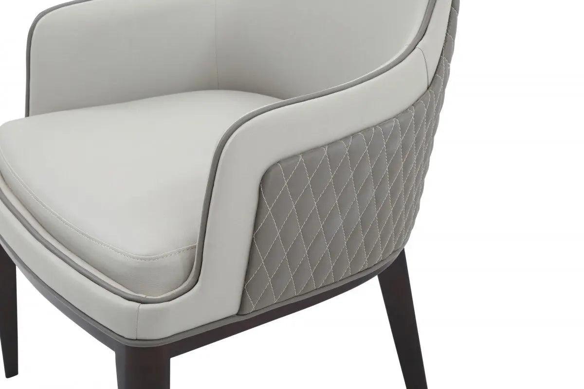 La silla de comedor Maxwell es la pieza contemporánea perfecta para cualquier comedor. El asiento tapizado en cuero regenerado beige está decorado con ribetes en gris oscuro. Las piezas decorativas de cuero regenerado gris oscuro del respaldo están cosidas en rombos con un hilo blanco en contraste. Este elegante toque realza la silla, haciéndola perfecta para un espacio formal.