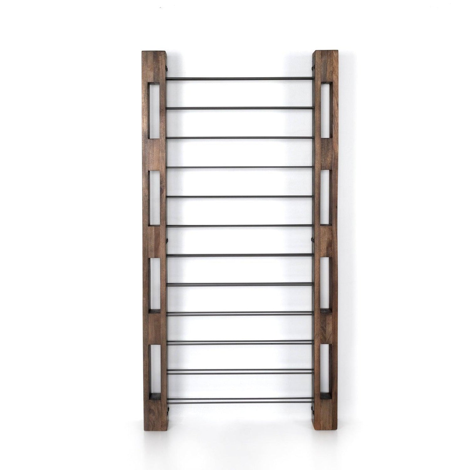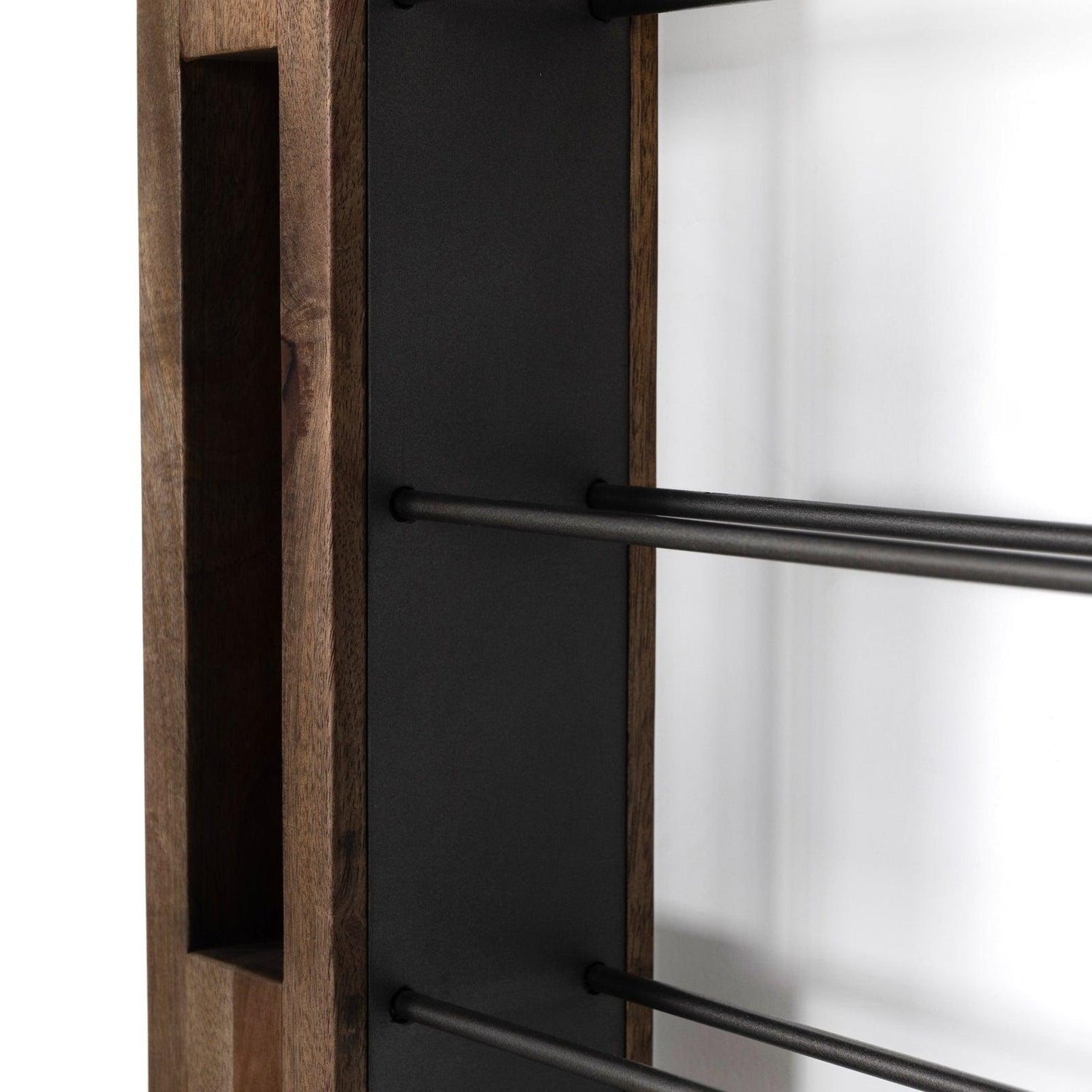 - El mango ahumado macizo da forma a un elegante botellero para montar en la pared, con tubos de hierro con acabado metalizado, listo para almacenar hasta 24 botellas de vino.